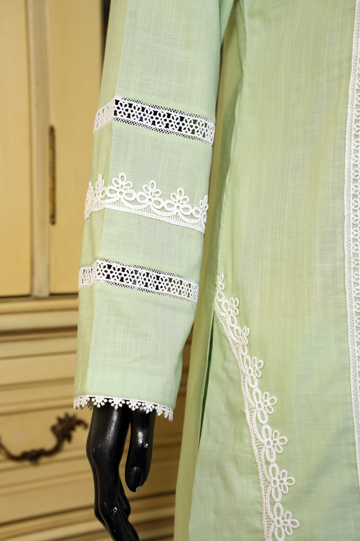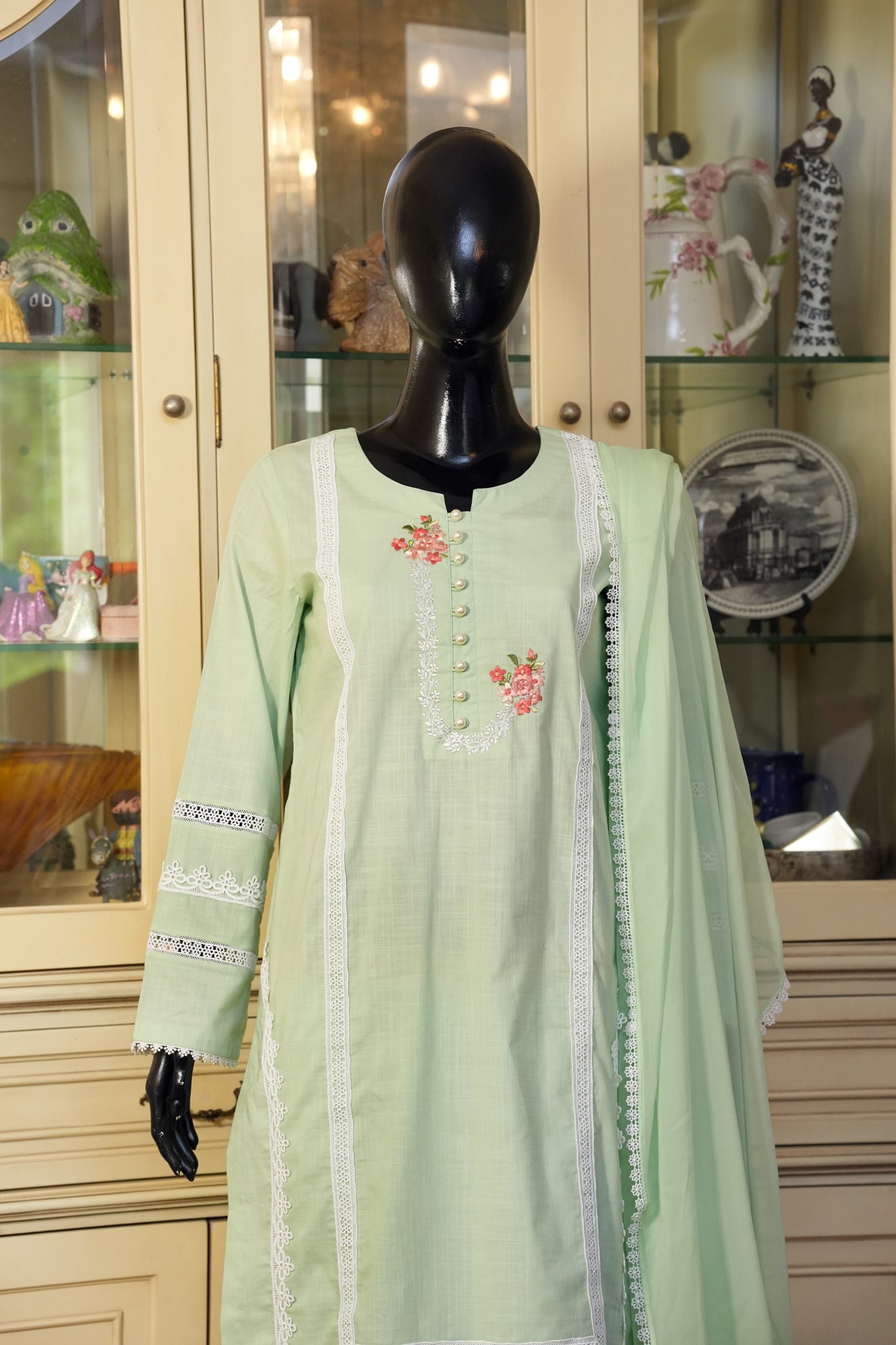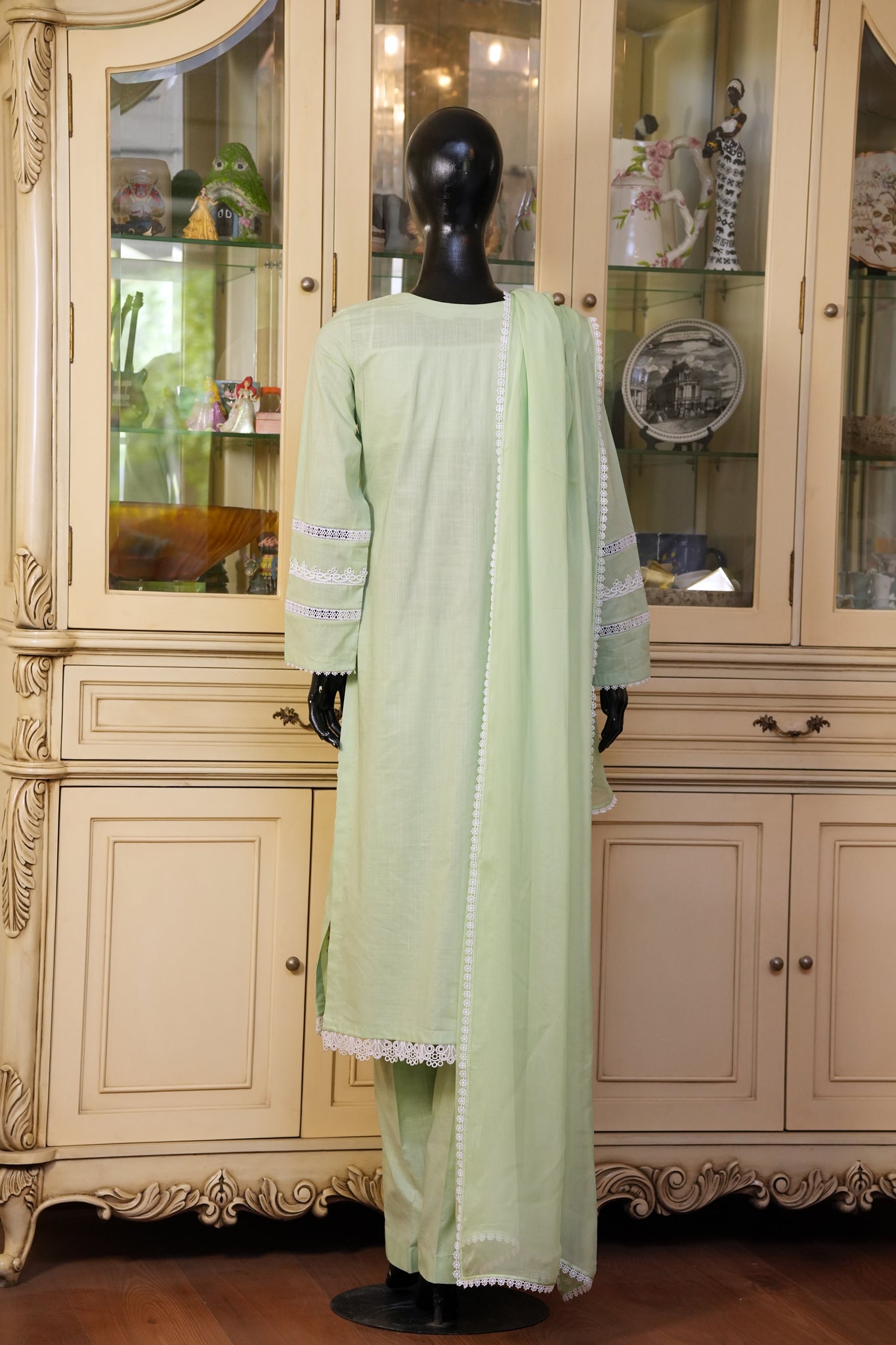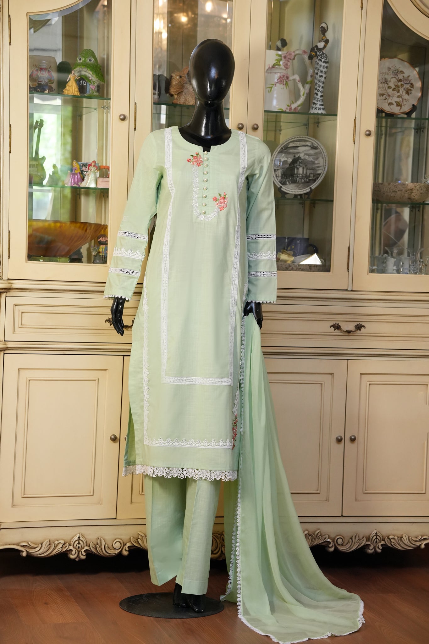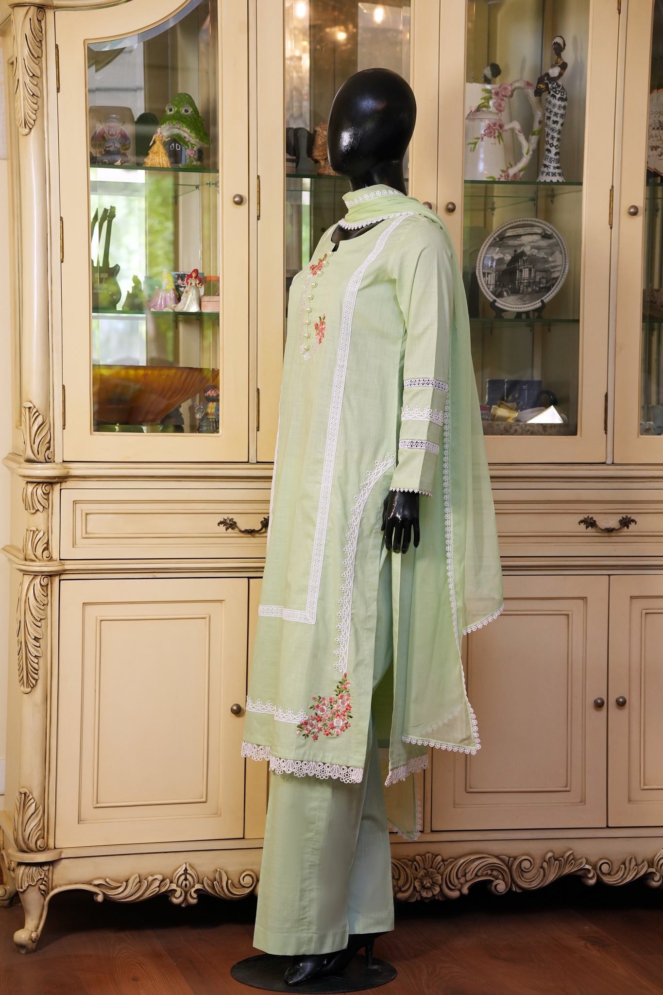 “Angoori” – a delicate cotton ensemble in the palest shade of grape, exuding elegance and grace. The fabric is adorned with intricate embroidery and subtle embellishments, adding a touch of sophistication. Contrasting accents in soft shades of peach create a beautiful harmony, enhancing the overall design. The look is completed with a lightweight dupatta, delicately edged with white lace, offering a timeless and refined appeal. Perfect for effortless elegance in warm weather