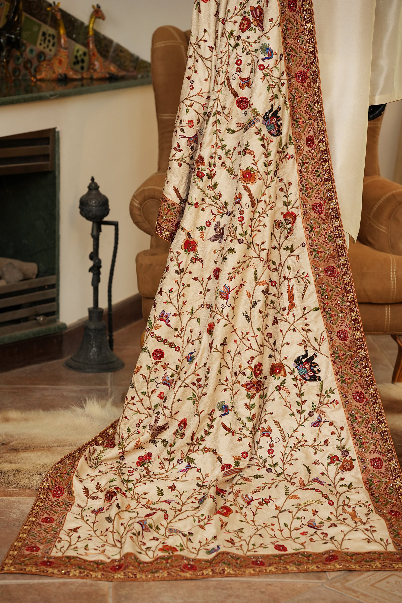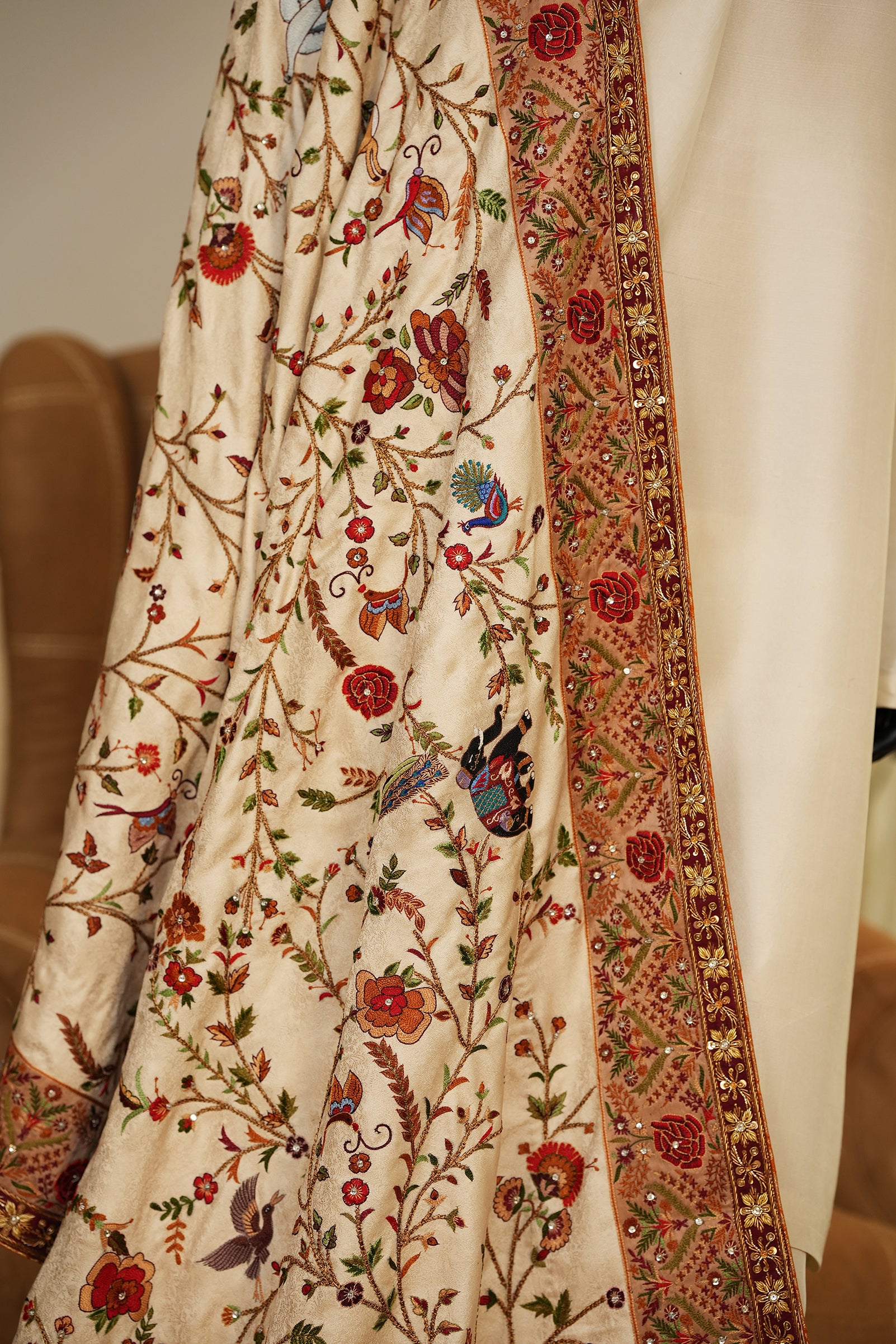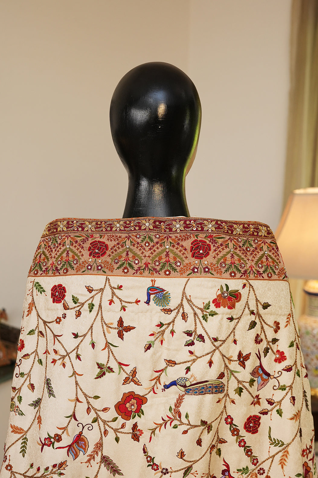 A pure self-embossed Jamawar shawl with intricate, single-thread embroidery depicts a scene of Royal gardens, showcasing floral and fauna motifs. The border contrasts beautifully with traditional zardozi work, adding a touch of elegance and sophistication to the piece.