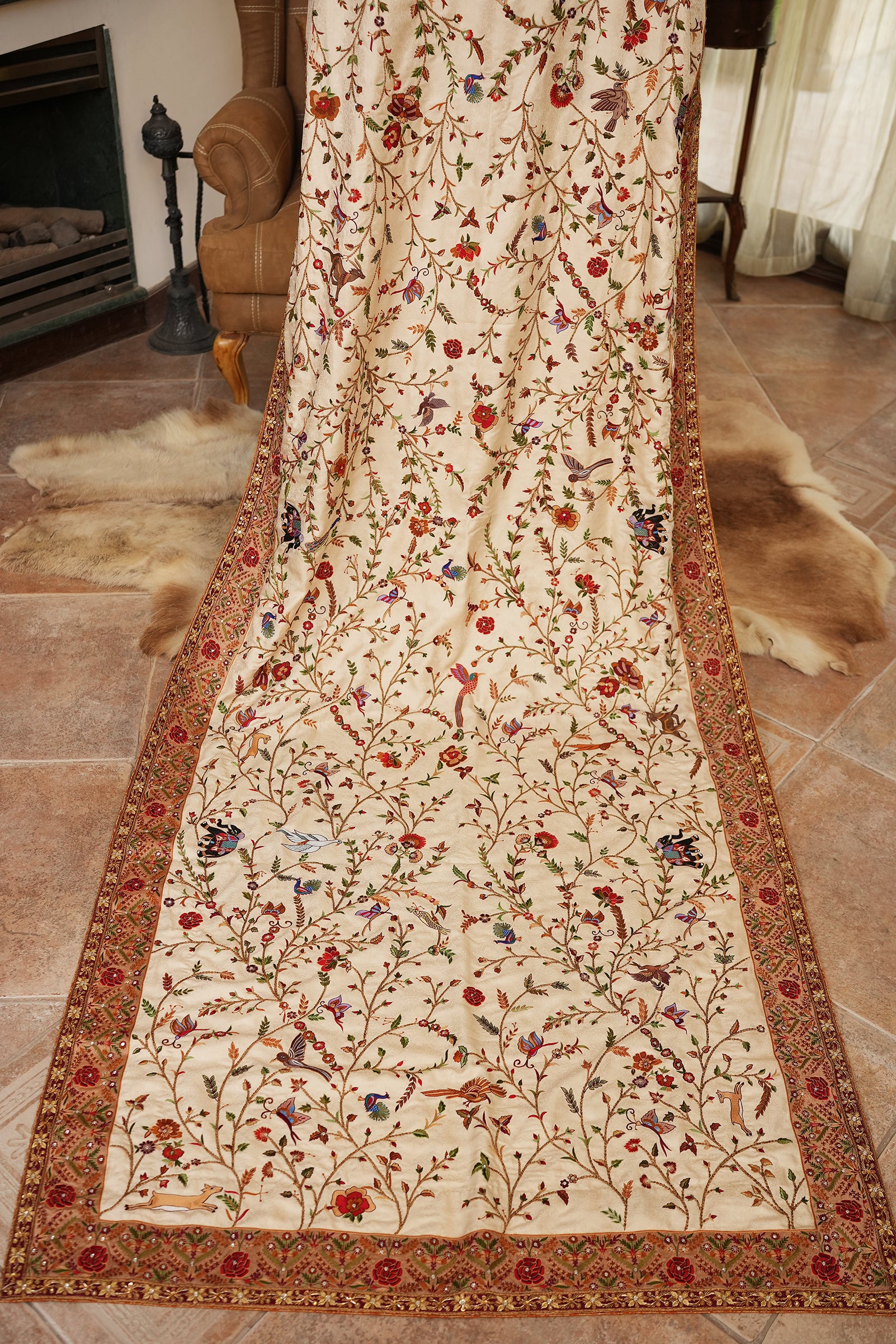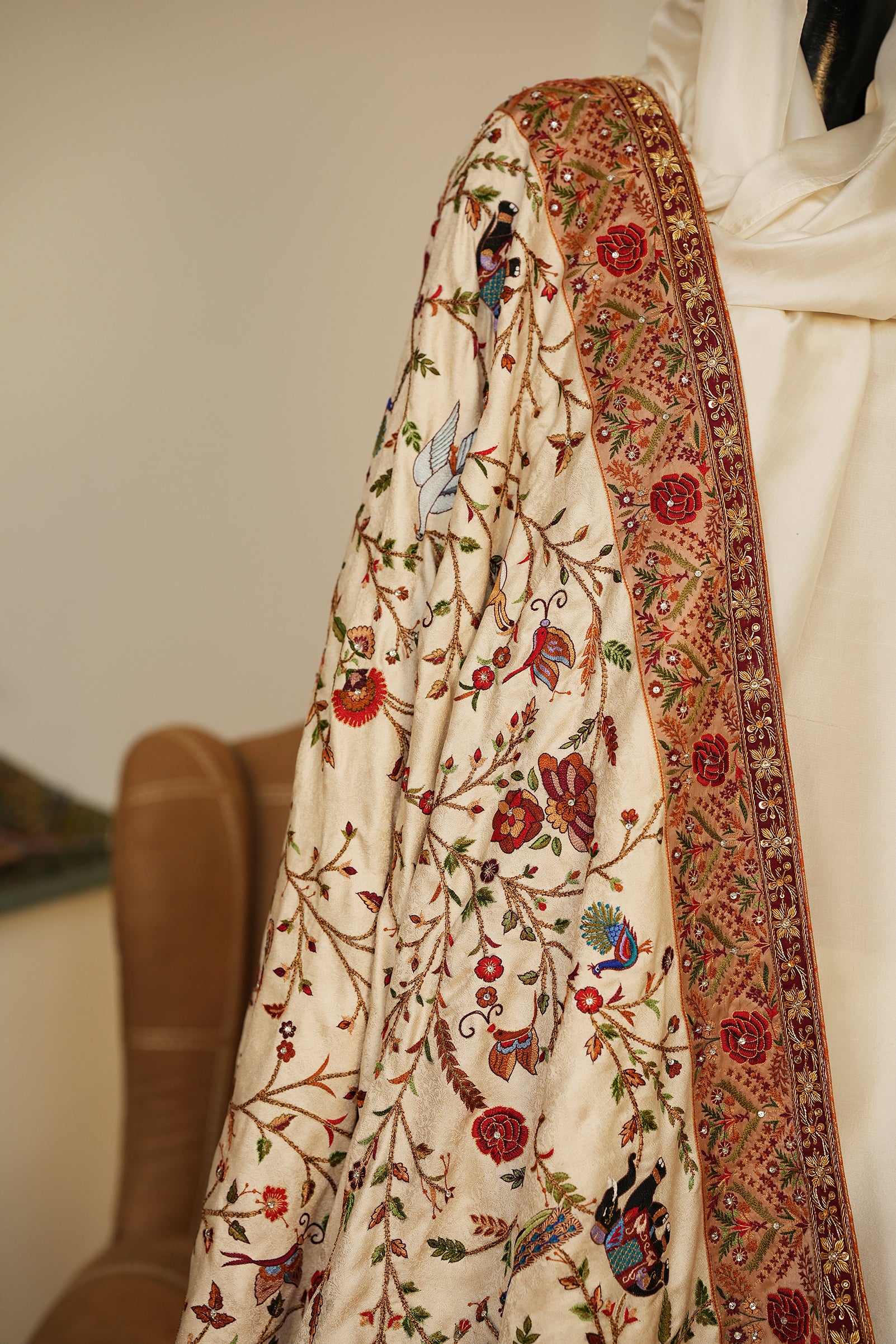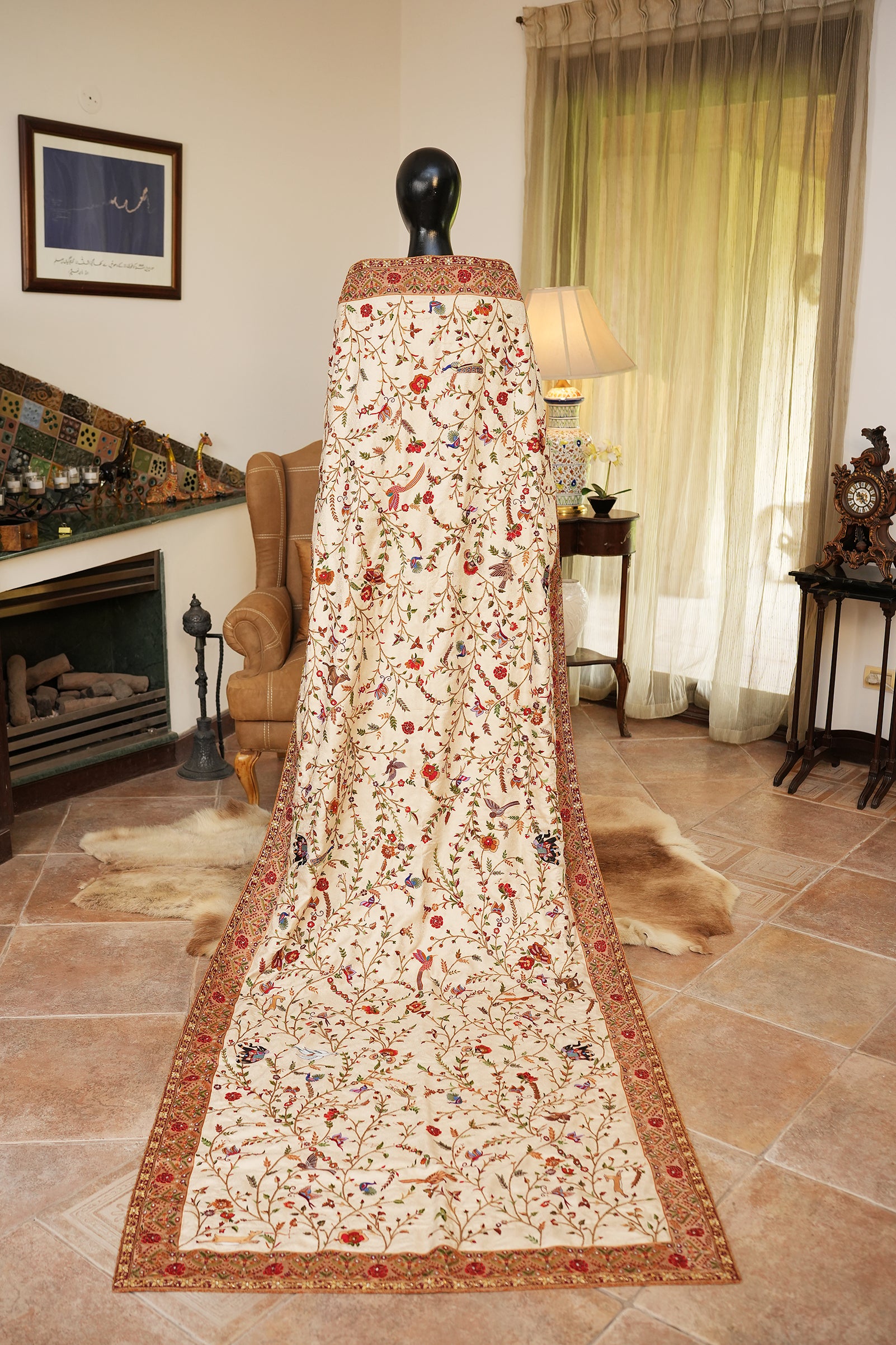A pure self-embossed Jamawar shawl with intricate, single-thread embroidery depicts a scene of Royal gardens, showcasing floral and fauna motifs. The border contrasts beautifully with traditional zardozi work, adding a touch of elegance and sophistication to the piece.