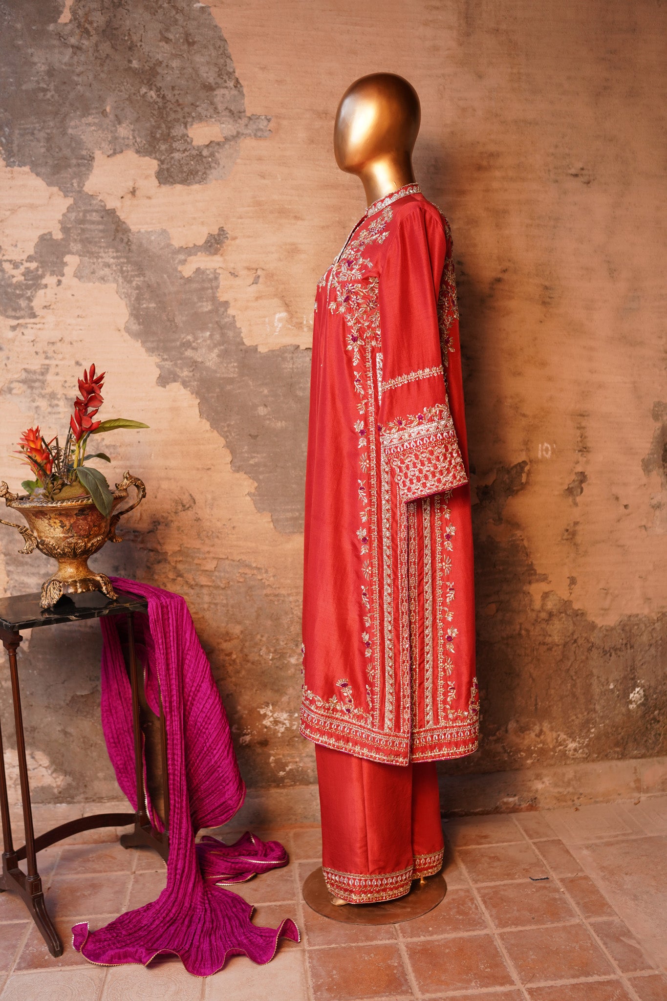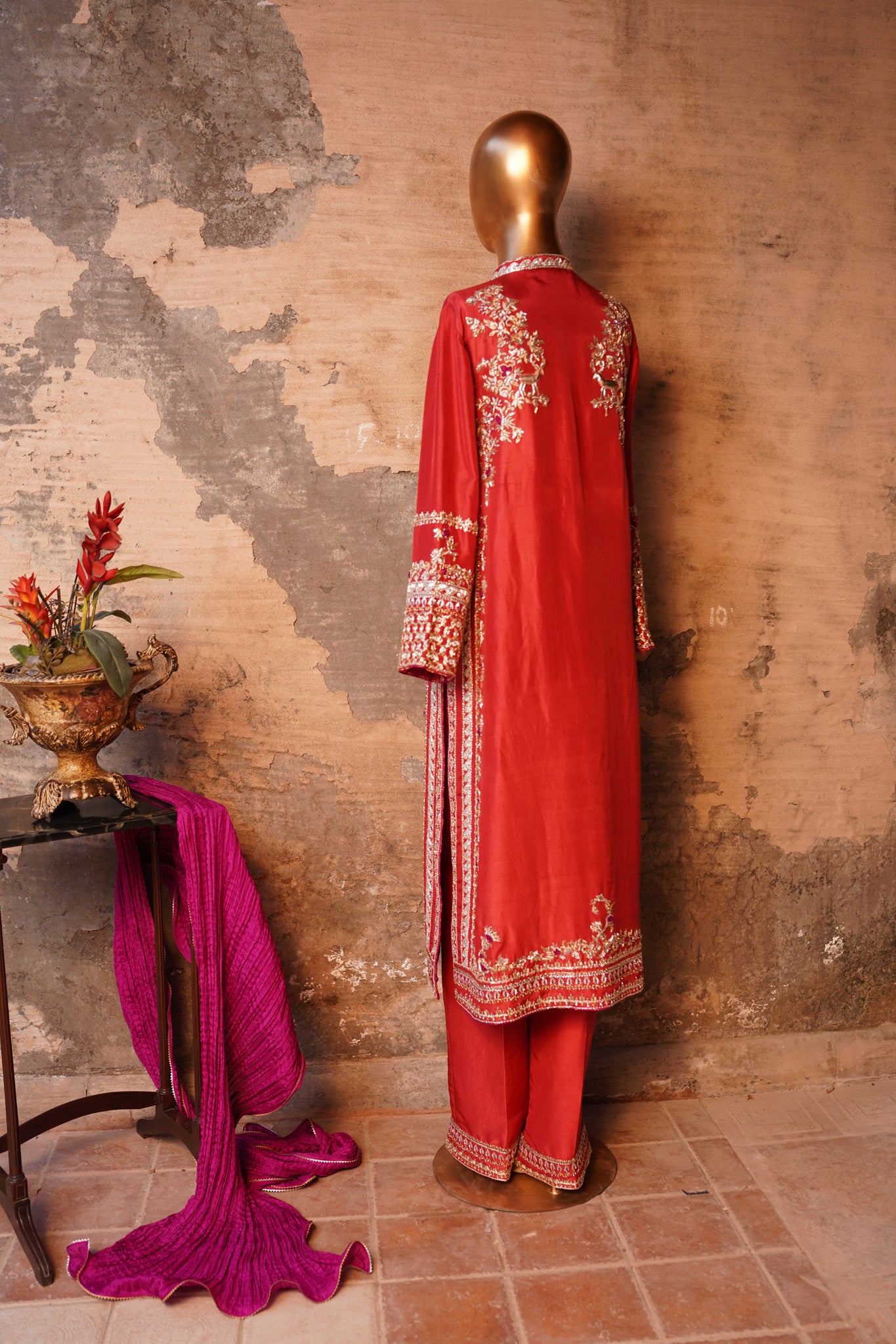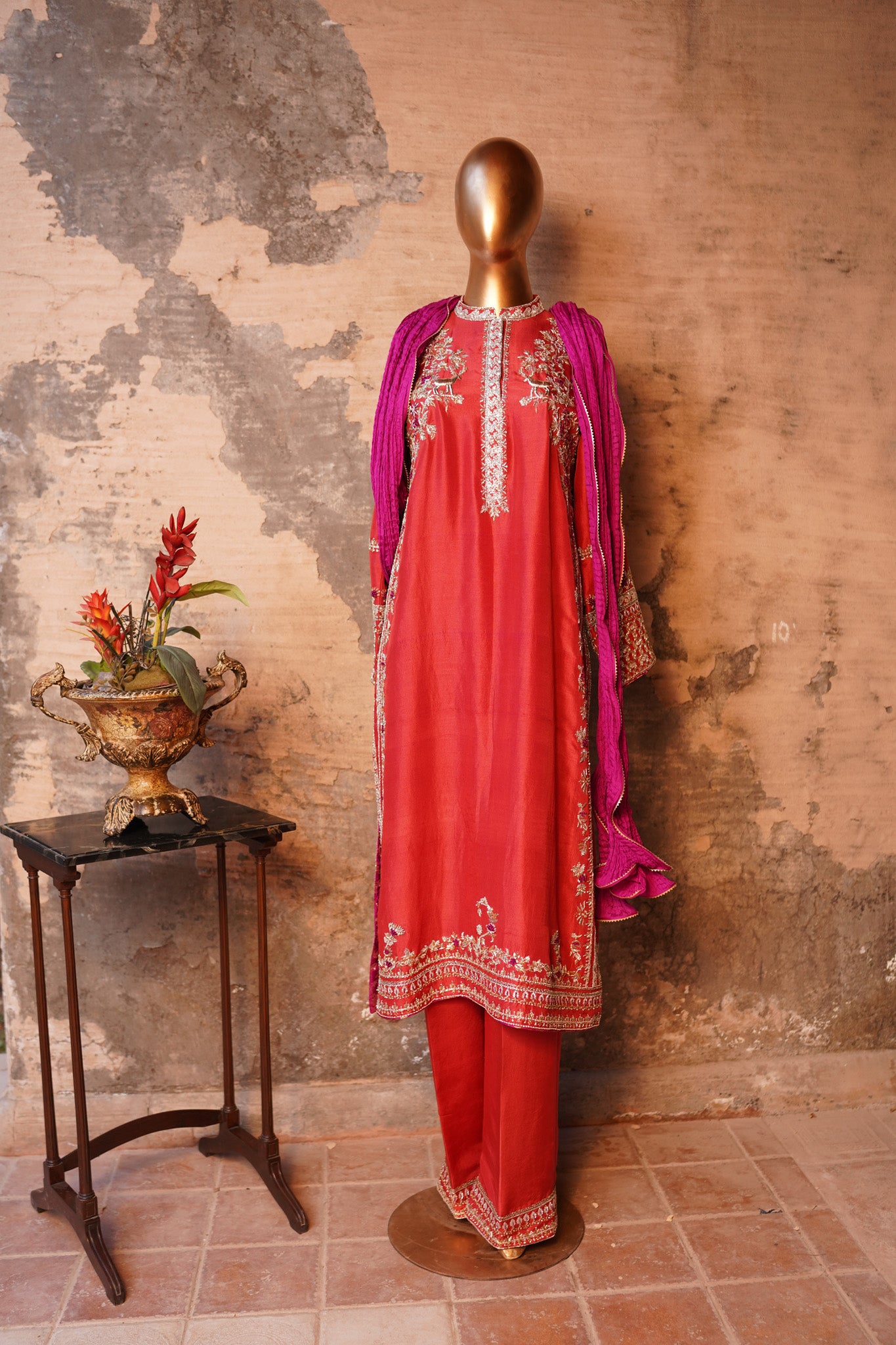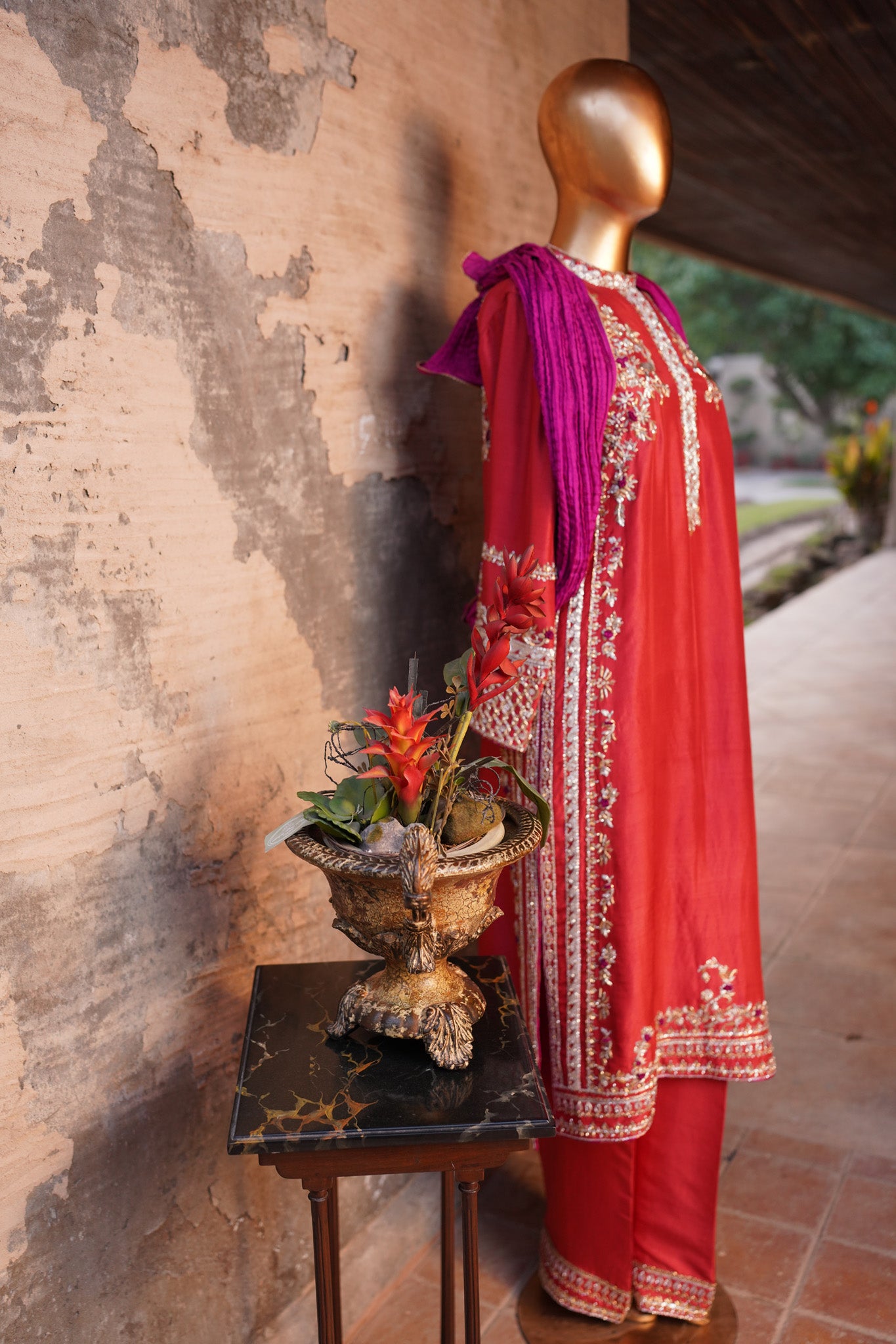 Look timelessly elegant with this luxurious Burnt Orange silk suit. Crafted with pure silk, it features intricate zardozi work with the traditional touch of Mukesh, paired with a contrasting plum dupatta. Feel the sophistication and grandeur of traditional style!