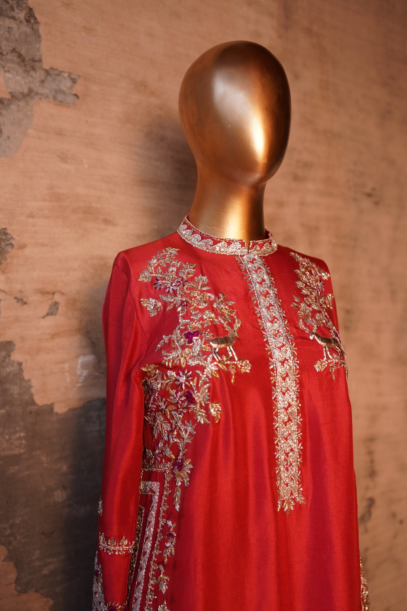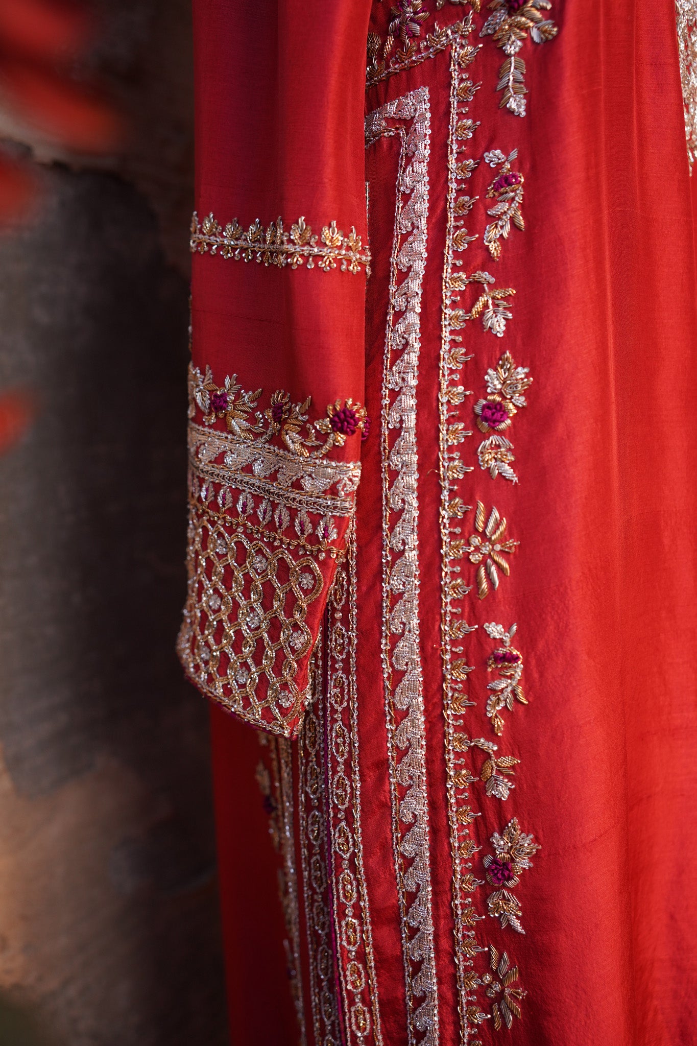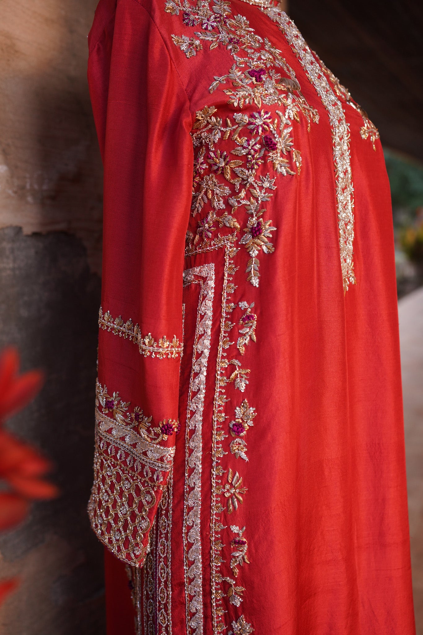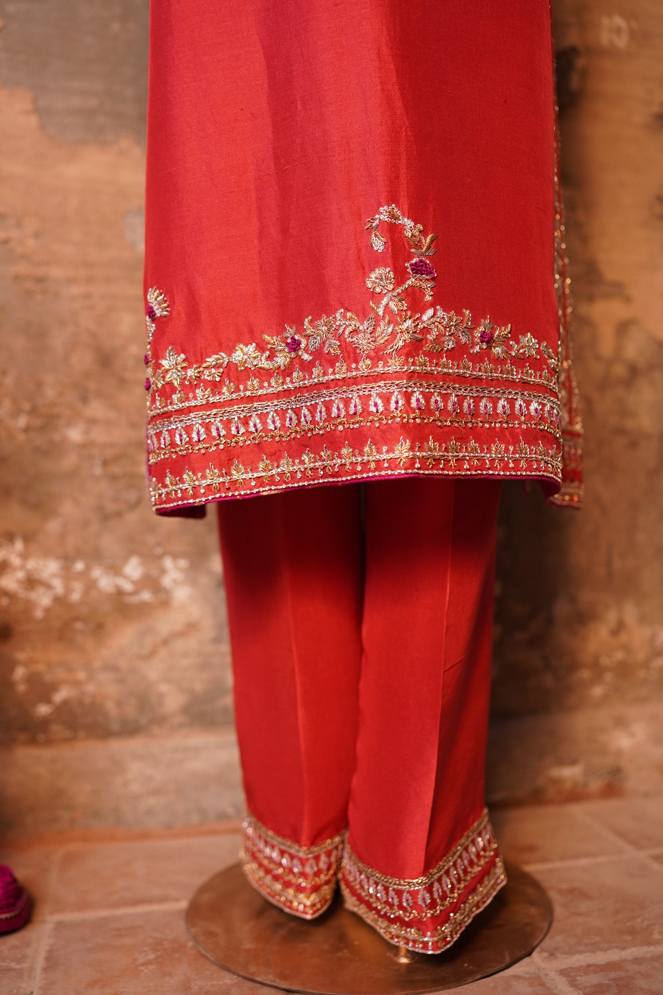 Look timelessly elegant with this luxurious Burnt Orange silk suit. Crafted with pure silk, it features intricate zardozi work with the traditional touch of Mukesh, paired with a contrasting plum dupatta. Feel the sophistication and grandeur of traditional style!