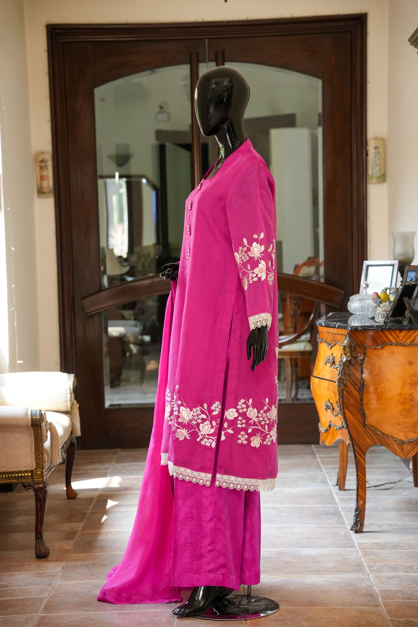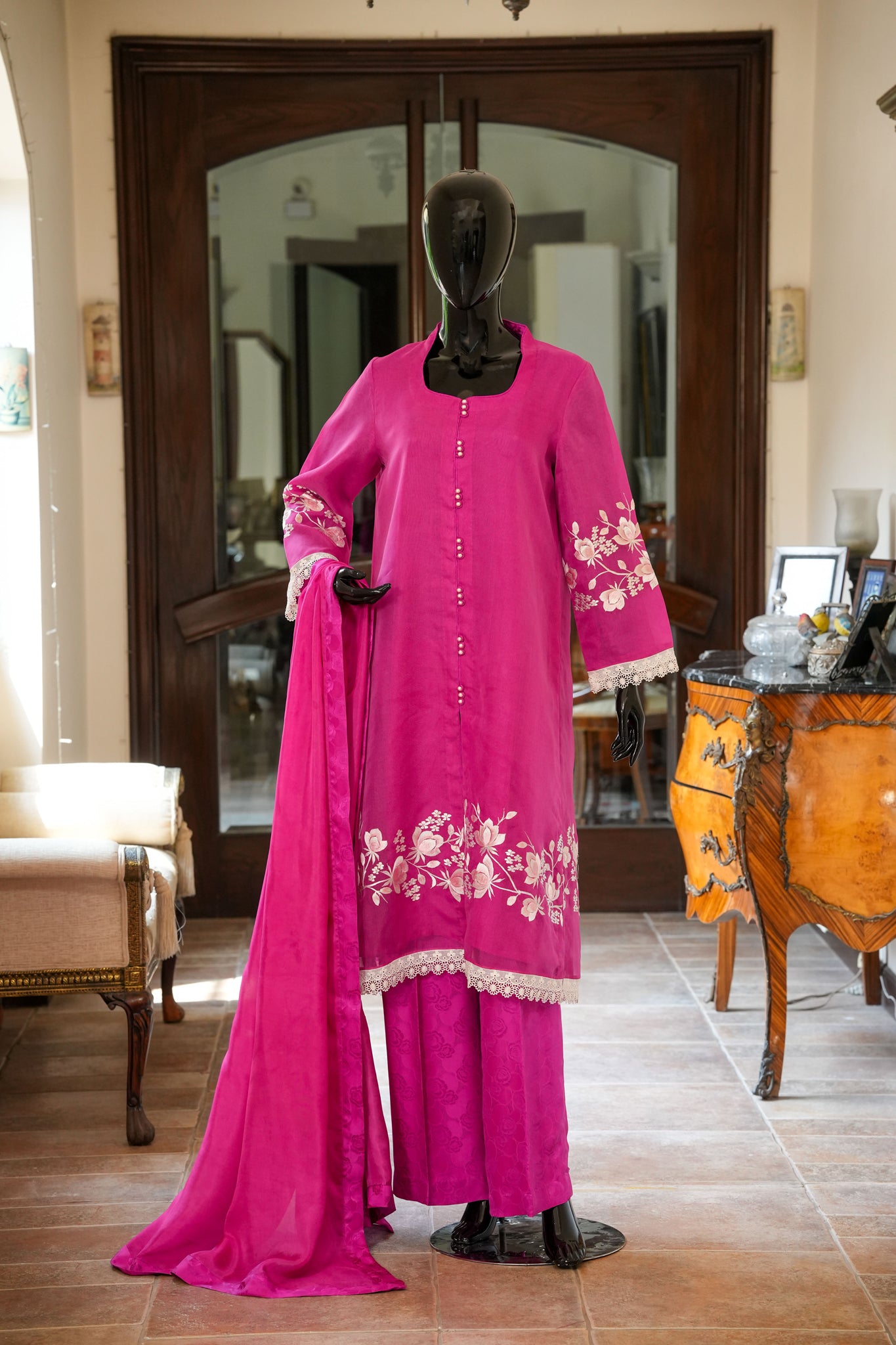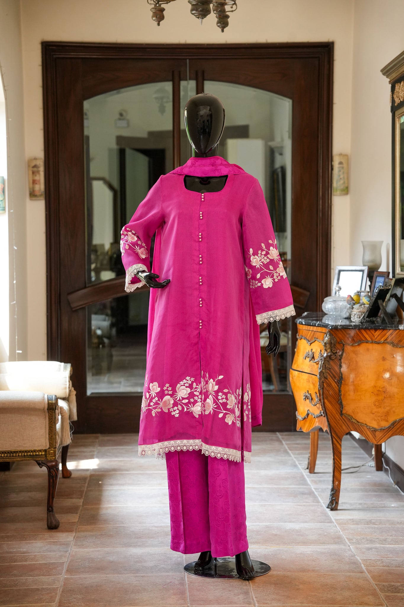 Elevate your wardrobe with this elegant dull pink pure silk organza shirt featuring delicate pastel machine embroidery, modern loop and button accents, paired seamlessly with self-embossed silk trousers and a luxurious silk dupatta, all finished with intricate braided details on the sleeves and hem for a sophisticated, timeless look.