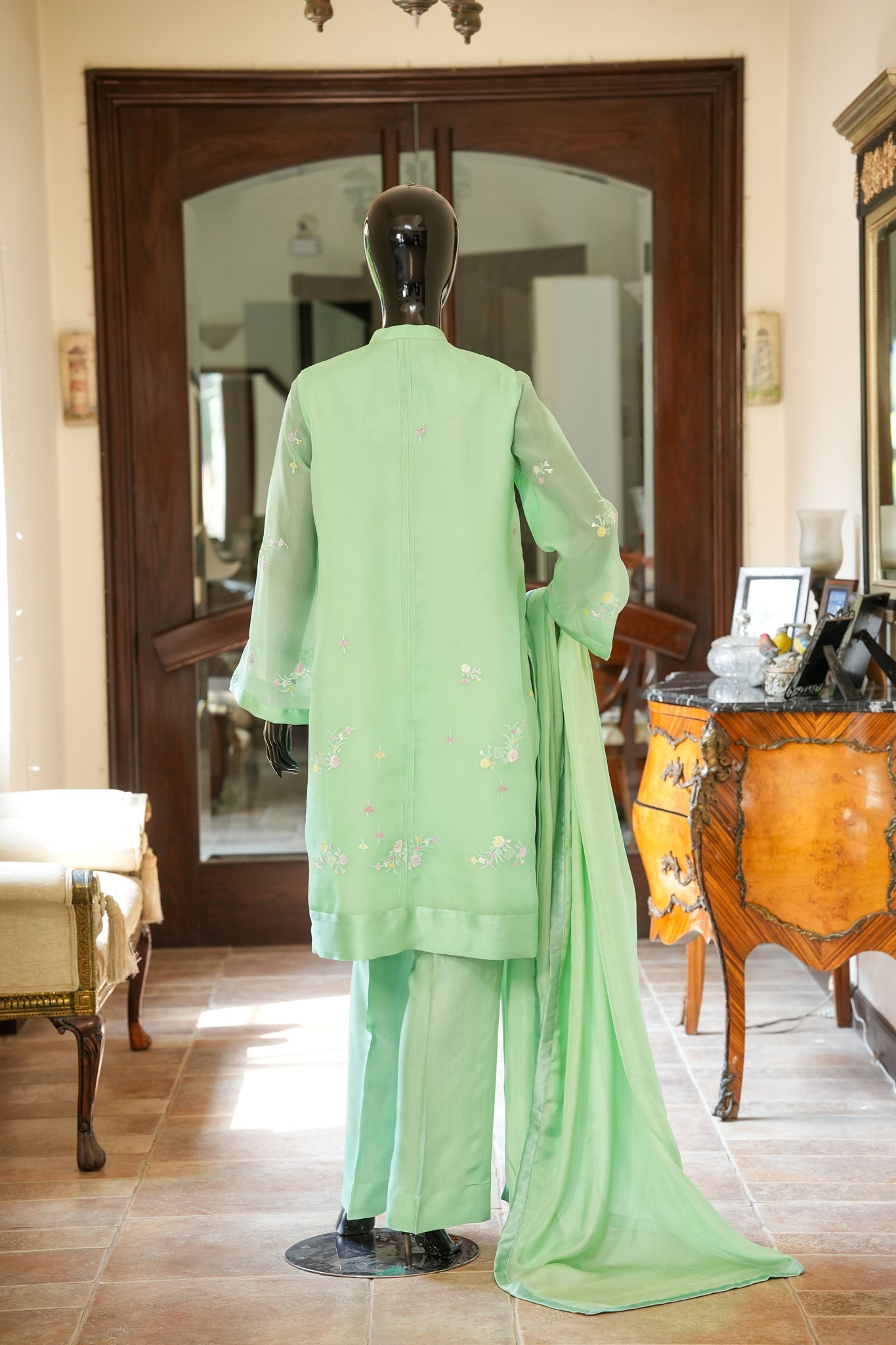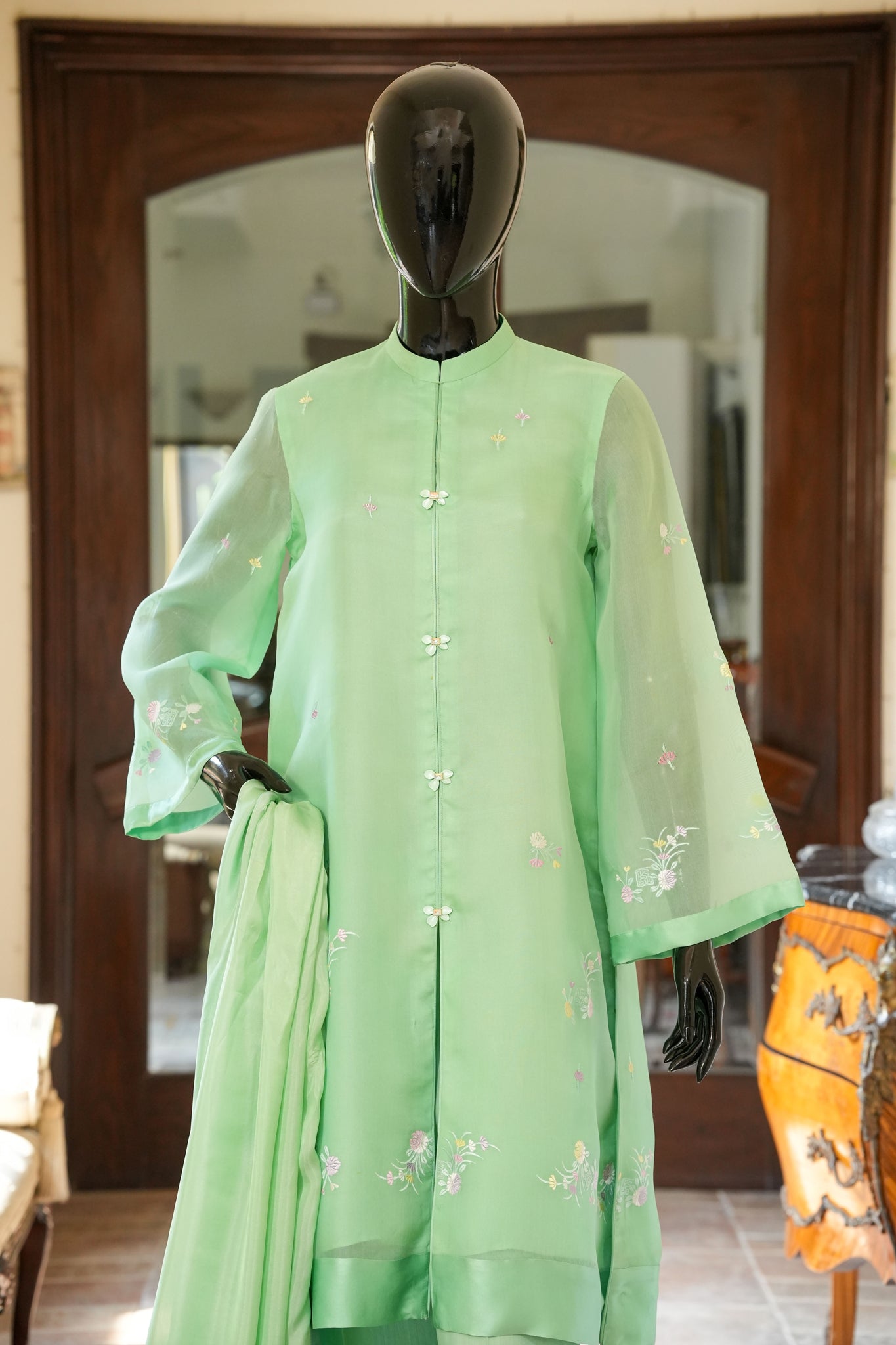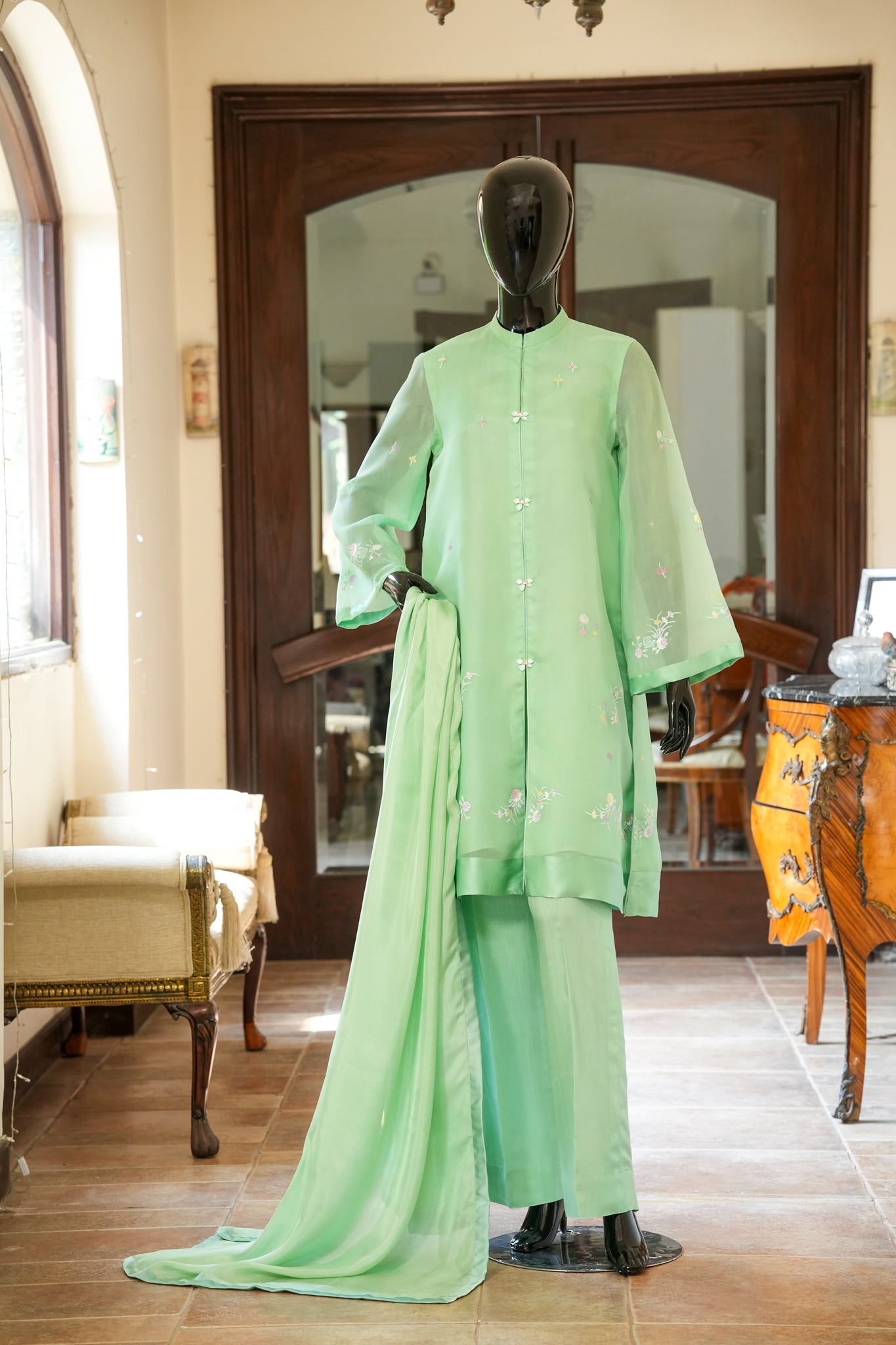 Experience effortless elegance with this fresh green organza shirt adorned with delicate floral machine embroidery and finished in smooth pure charmeuse. It pairs beautifully with pure silk straight pants and a silk dupatta, complemented by dainty buttons that add a refined, graceful touch to your ensemble.