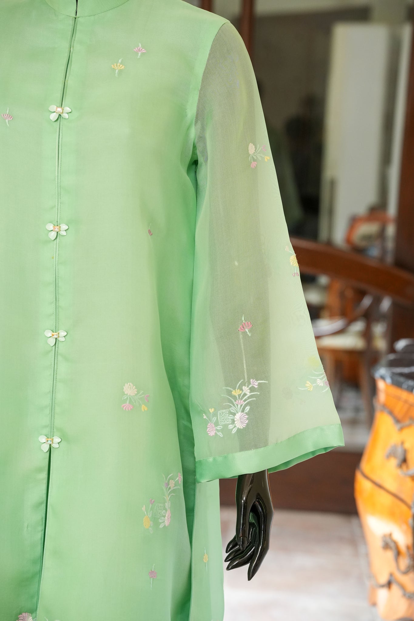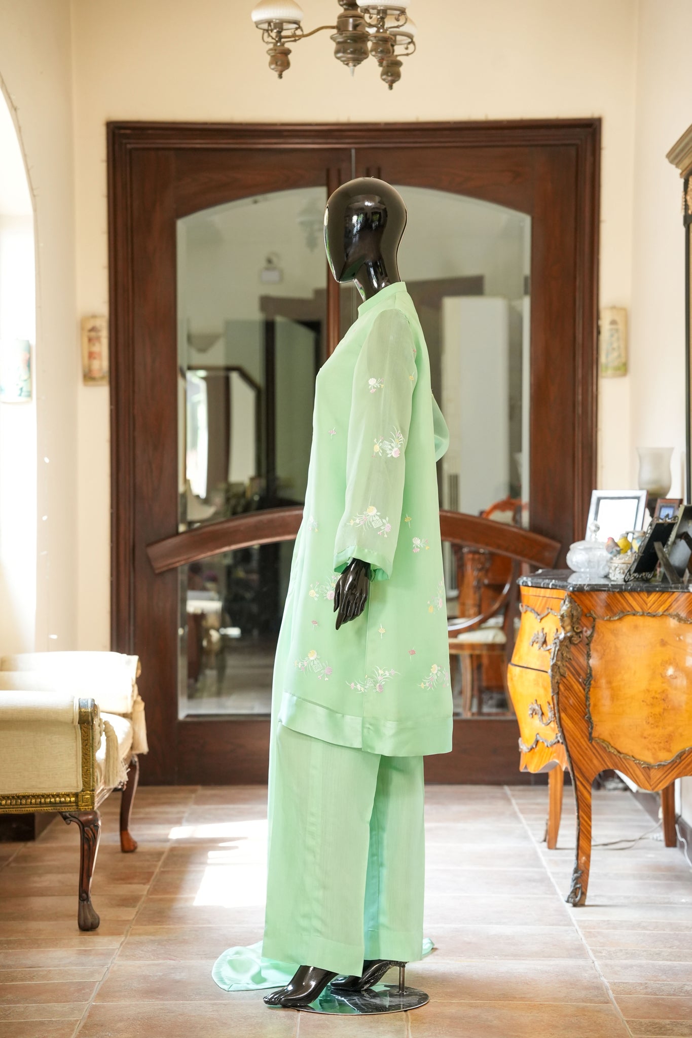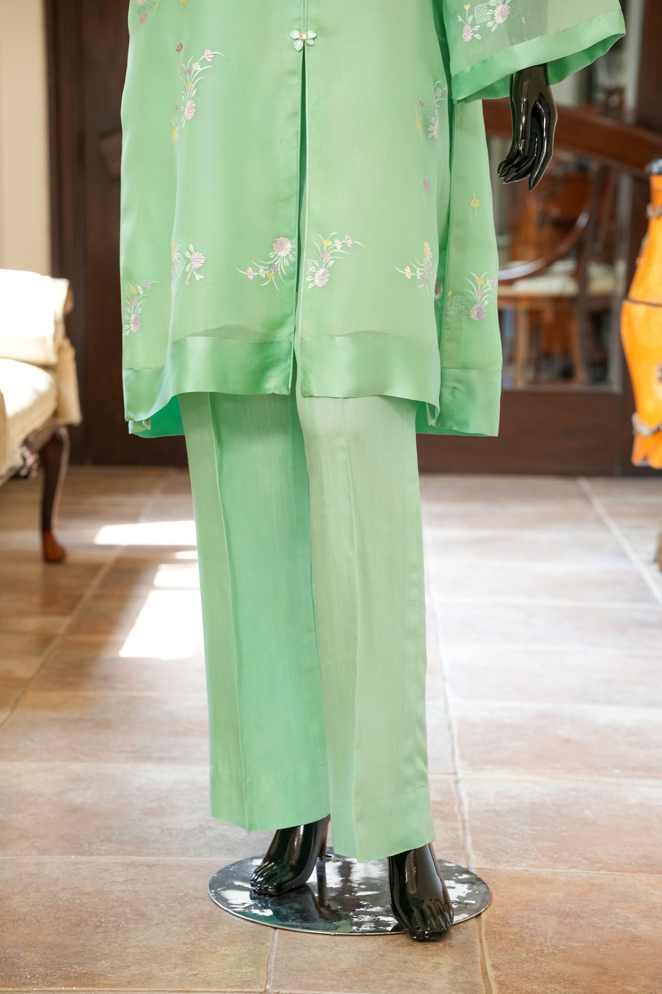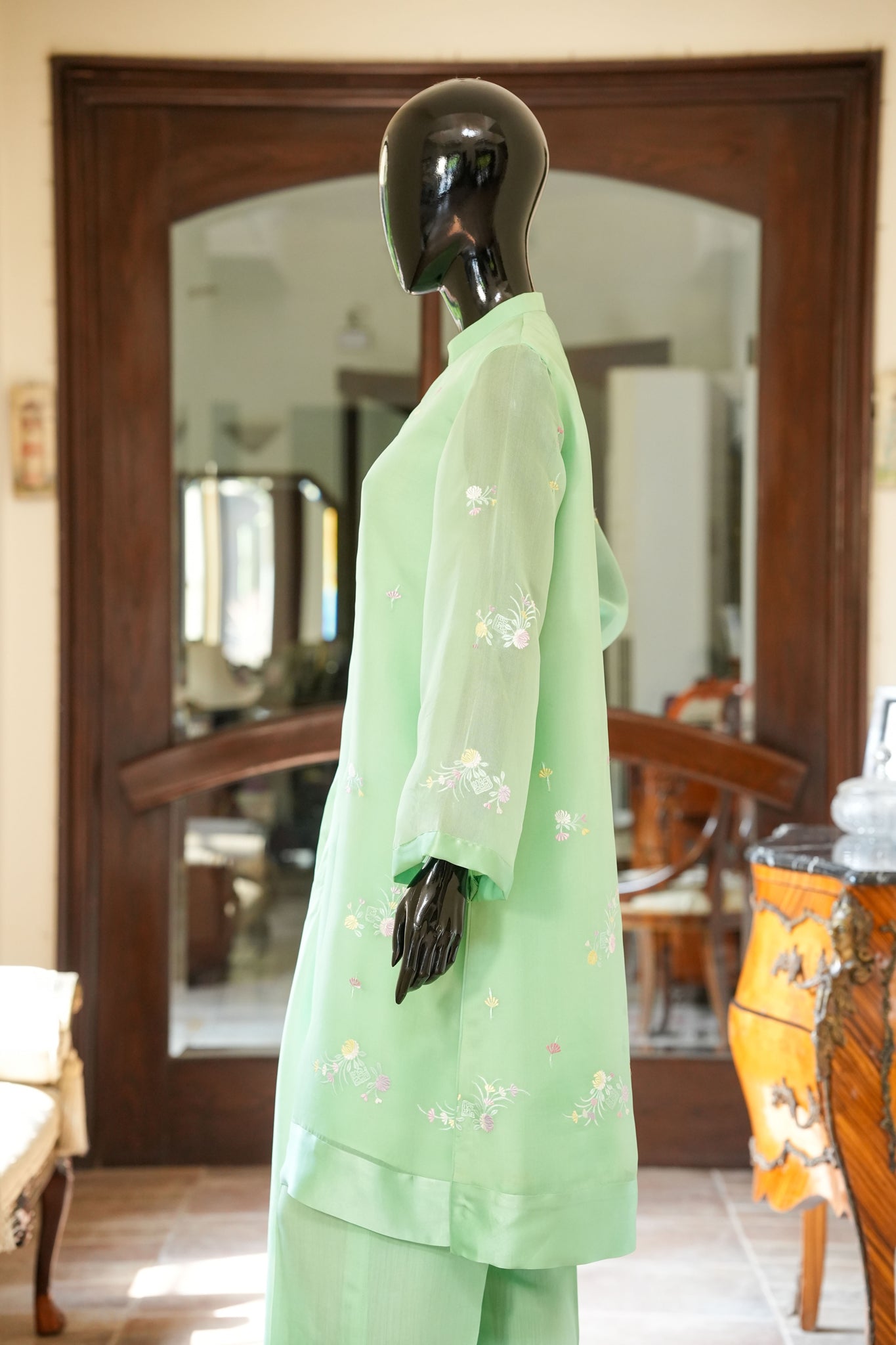 Experience effortless elegance with this fresh green organza shirt adorned with delicate floral machine embroidery and finished in smooth pure charmeuse. It pairs beautifully with pure silk straight pants and a silk dupatta, complemented by dainty buttons that add a refined, graceful touch to your ensemble.
