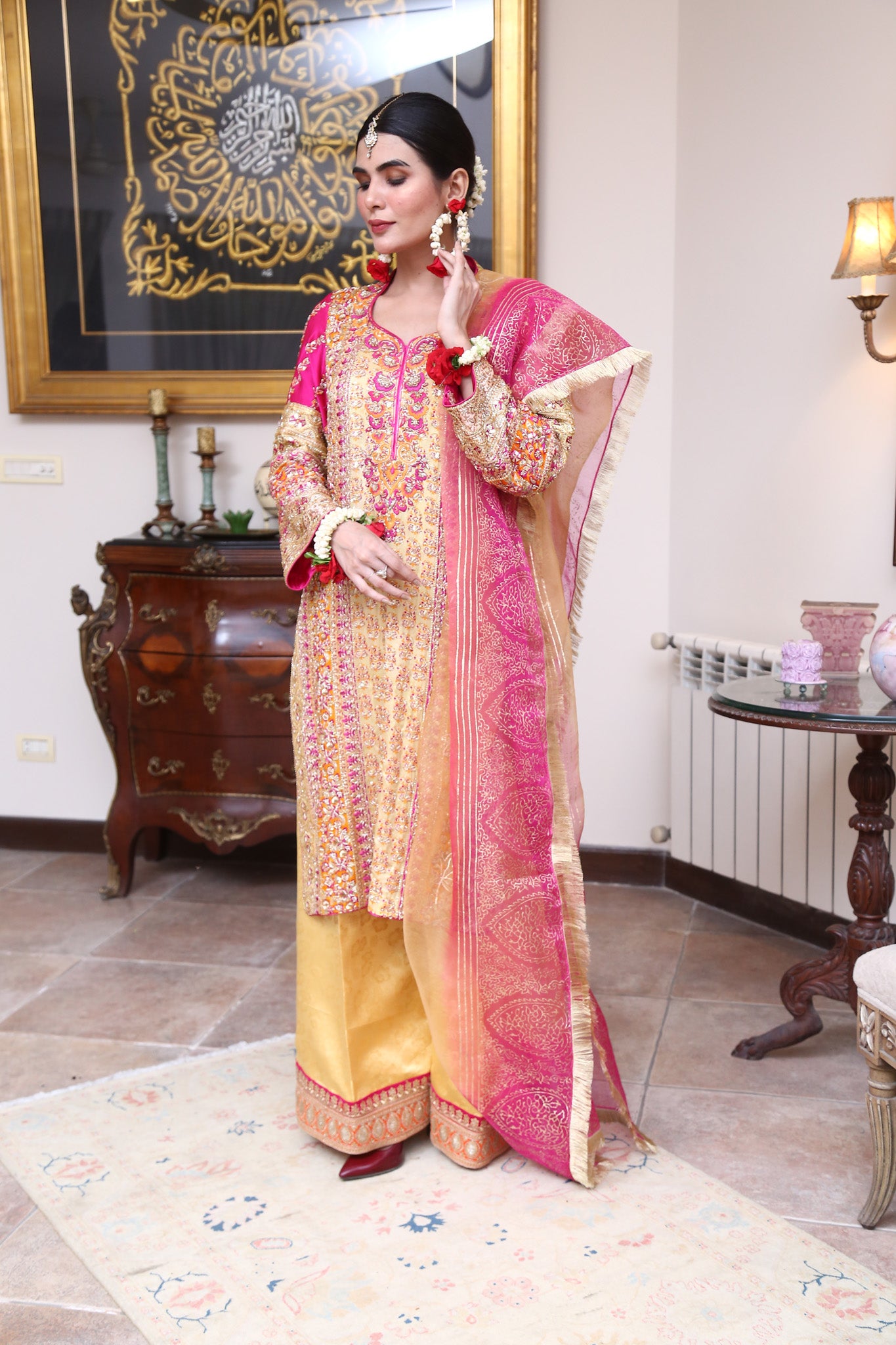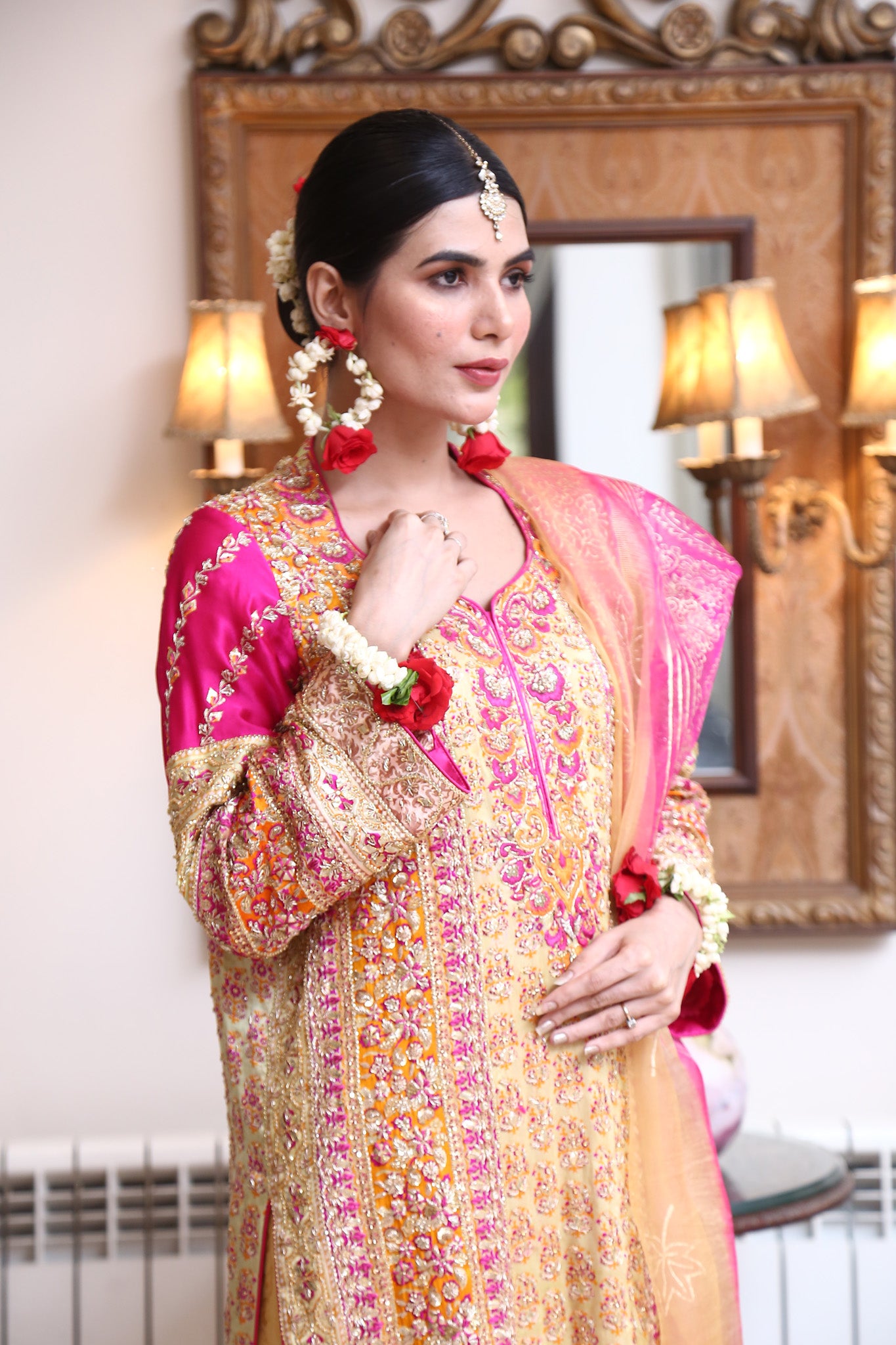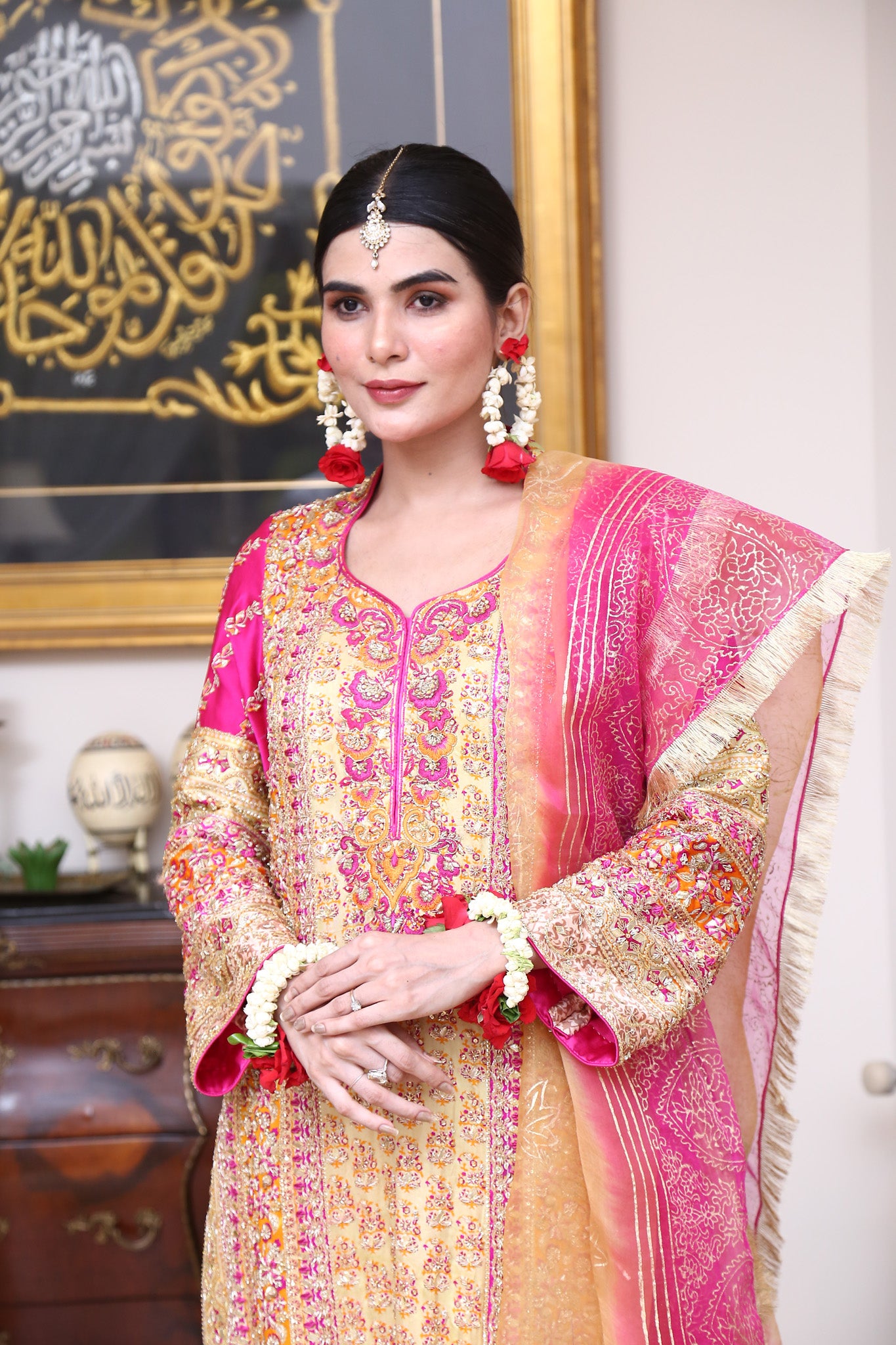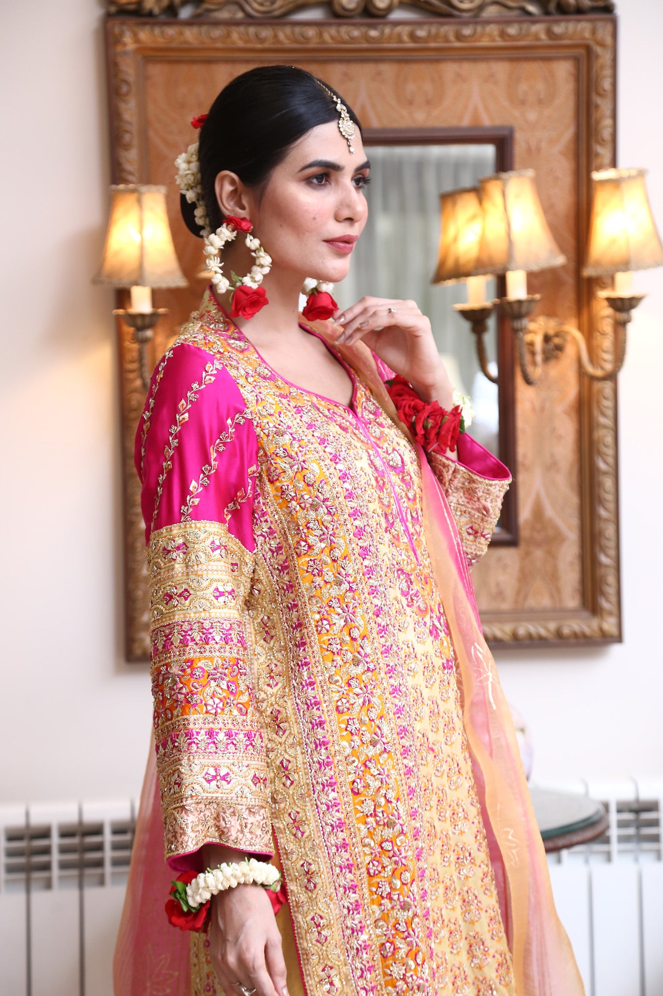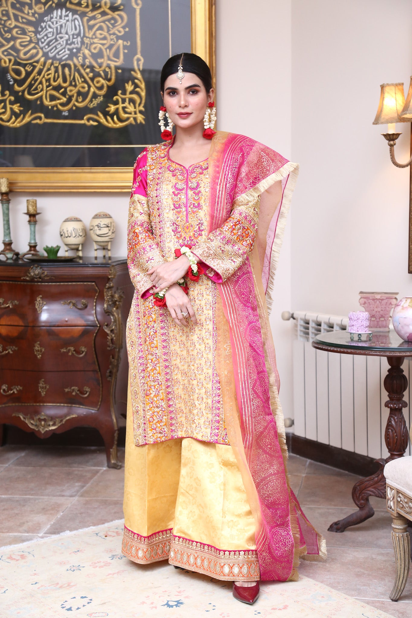 Discover a timeless beauty with our stunning Gold and Pink Pure Silk Screen Printed Long Shirt. This statement piece is crafted with intricate colourwork in threads, gota and zardozi, while a plain lengha in a contrasting shade adds a modern twist. Flaunt your style with this luxurious combination and an organza dupatta with block print! Transform the ordinary into extraordinary!