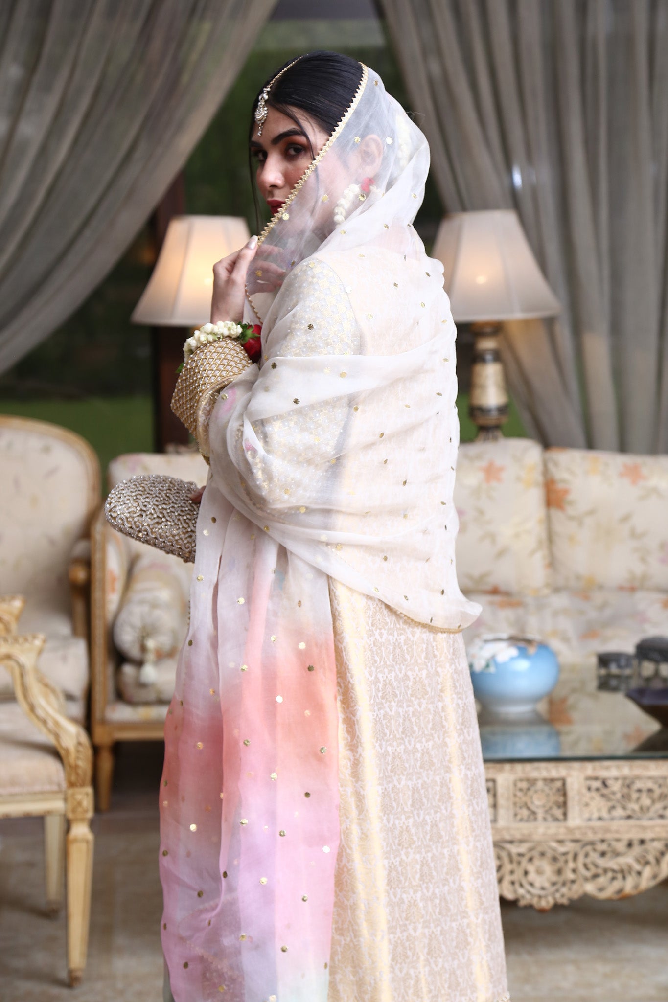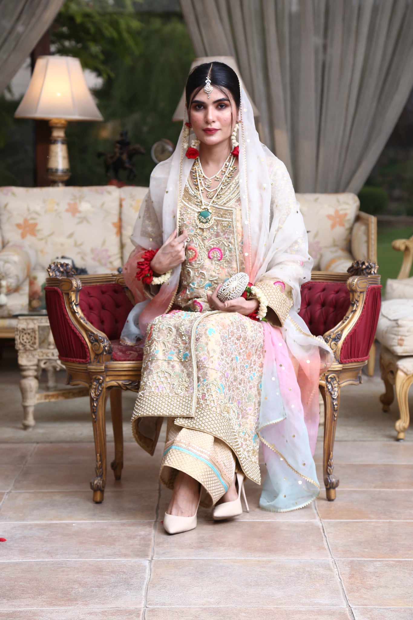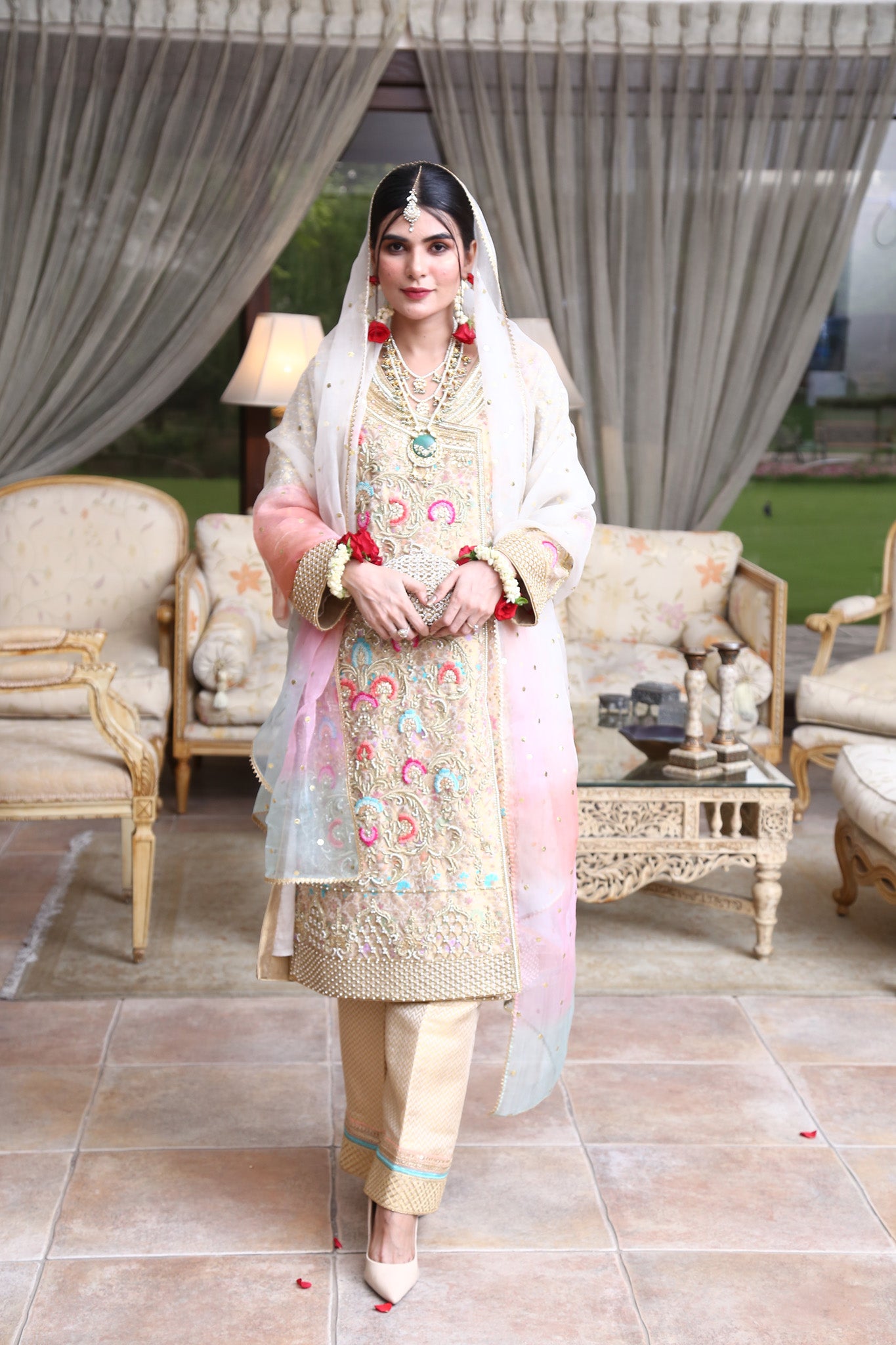 Be your own showstopper with this exquisite Cream Multi Floral Pure Jamawar Angarkha! From the delicate pastel thread and pearl work to the light gold zardozi work, this traditional ensemble is sure to make a statement! Stun in a loose culottes and chatta patti mukesh dupatta for the perfect show-stopping look!