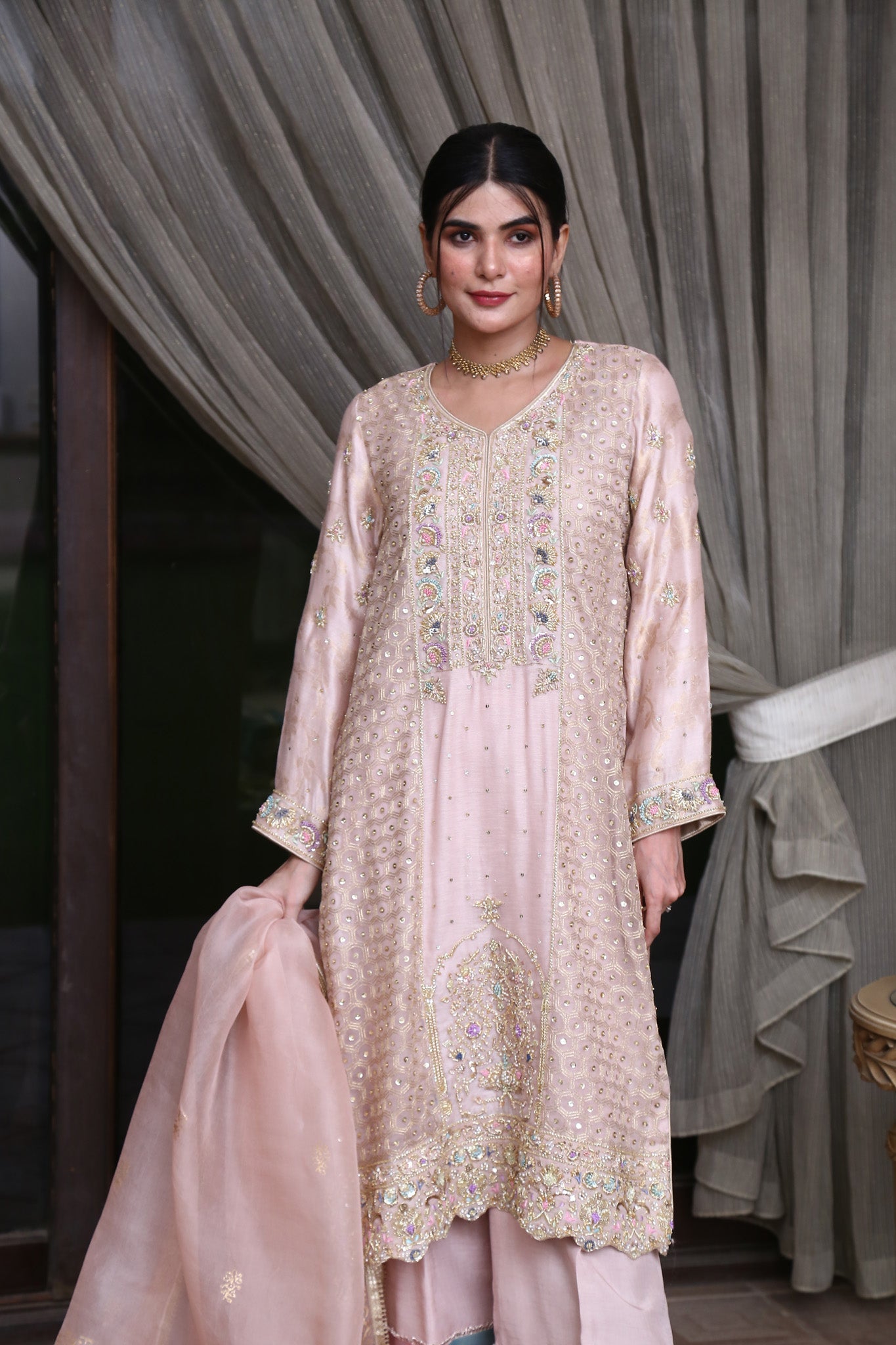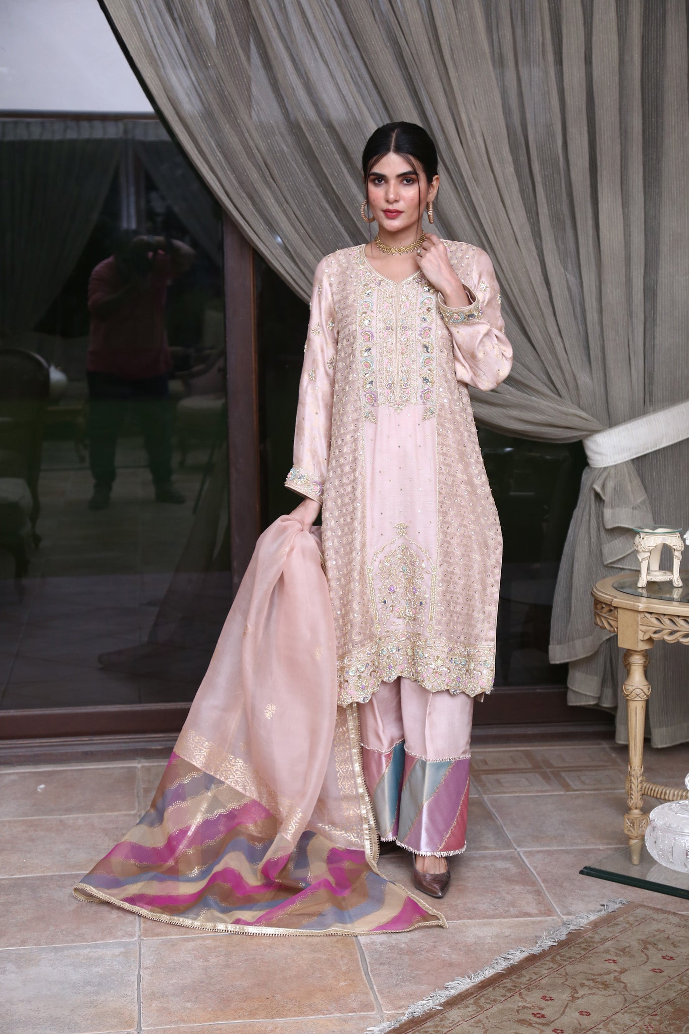 Make a stunning statement with this pastel pink zardozi work ensemble. Perfect for any special occasion, the delicate zardozi work on the shirt paired with chatta patti culottes and a sheer organza dupatta gives it an ethereal charm. So why not add a splash of color to your wardrobe? Be the star of any event in this head-turning outfit.
