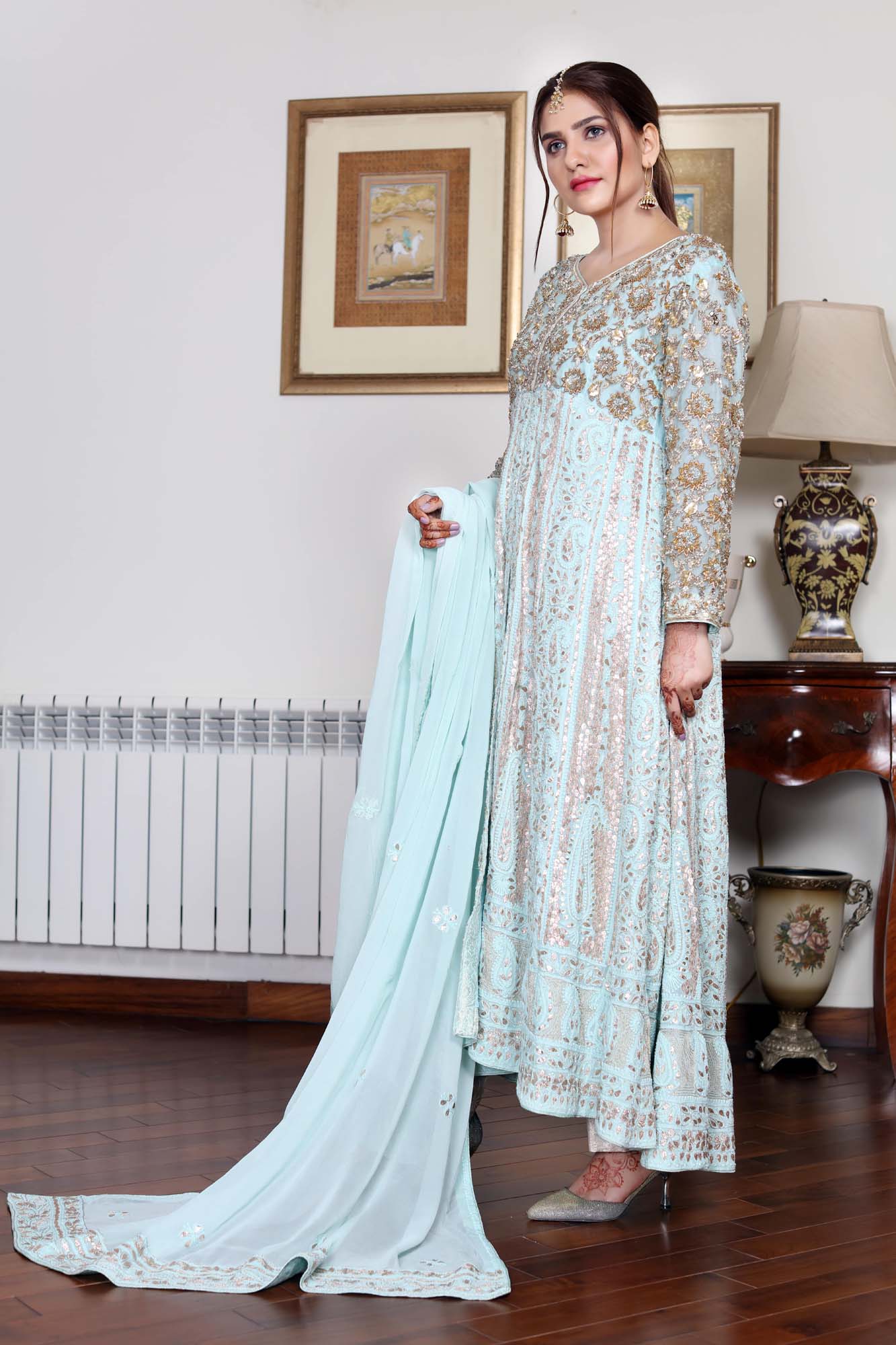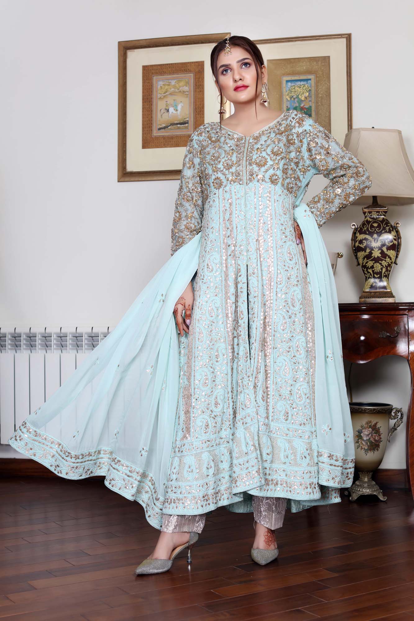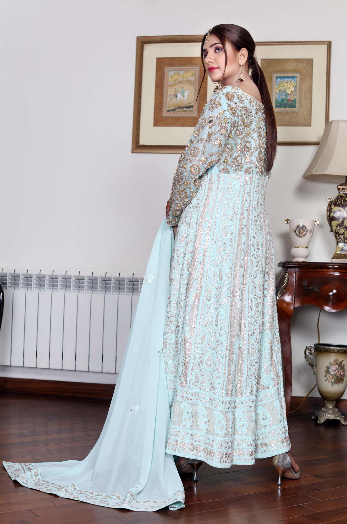 Light aqua blue Chikankari paneled long dress with thread and gota work. Heavy gold kam on bodice sleeves