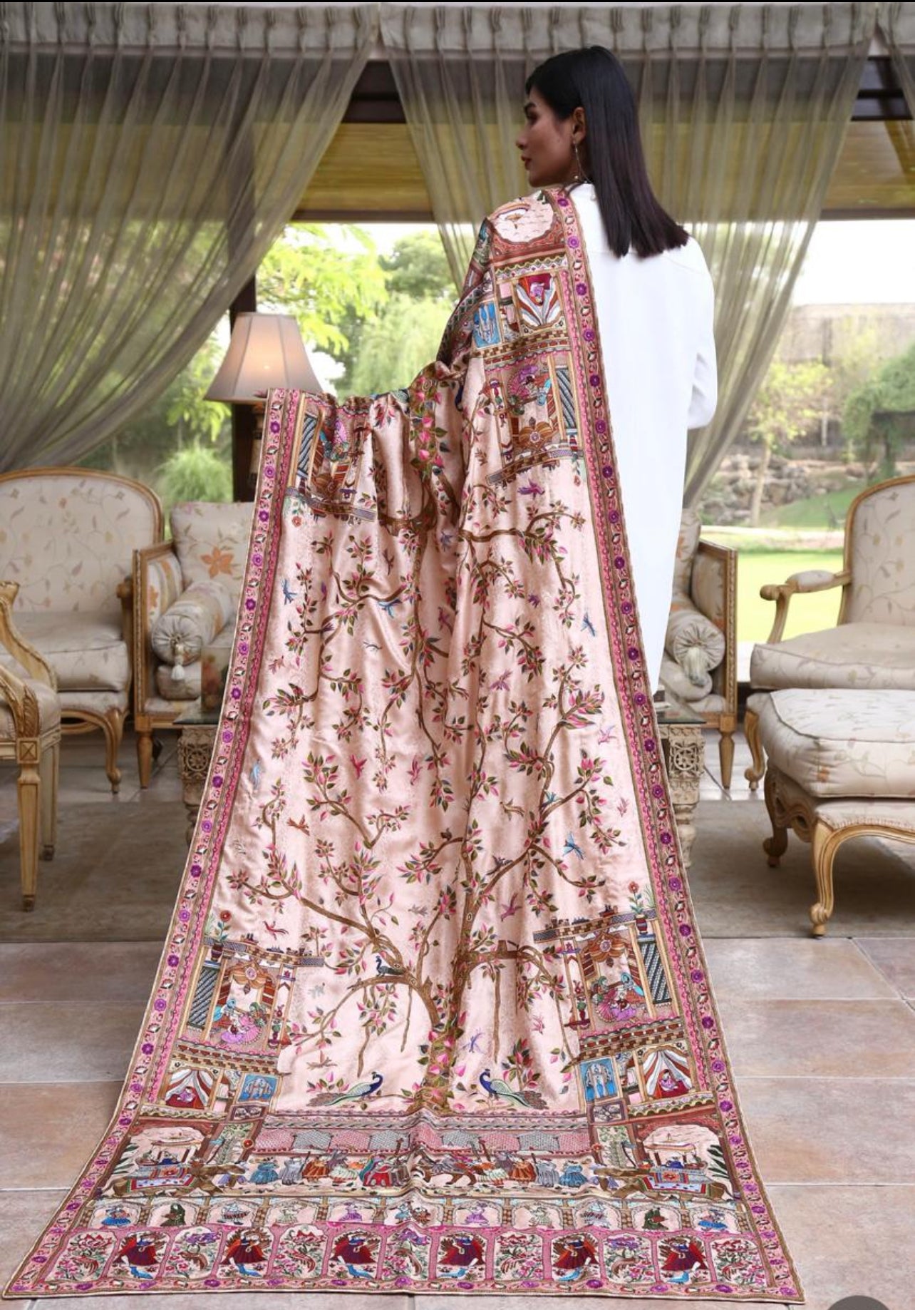 Introducing our Ghulabi Mahal shawl from exquisite Heritage Line, featuring single-thread embroidery that masterfully captures the opulent life of royals. Each piece is a vibrant tapestry of rich colours, meticulously depicting scenes of heritage and culture. The embroidery is done on pure, self-embossed jamawar fabric, known for its luxurious texture and timeless elegance. This collection is a celebration of artistry and tradition, perfect for those who appreciate the finest in cultural craftsmanship.
