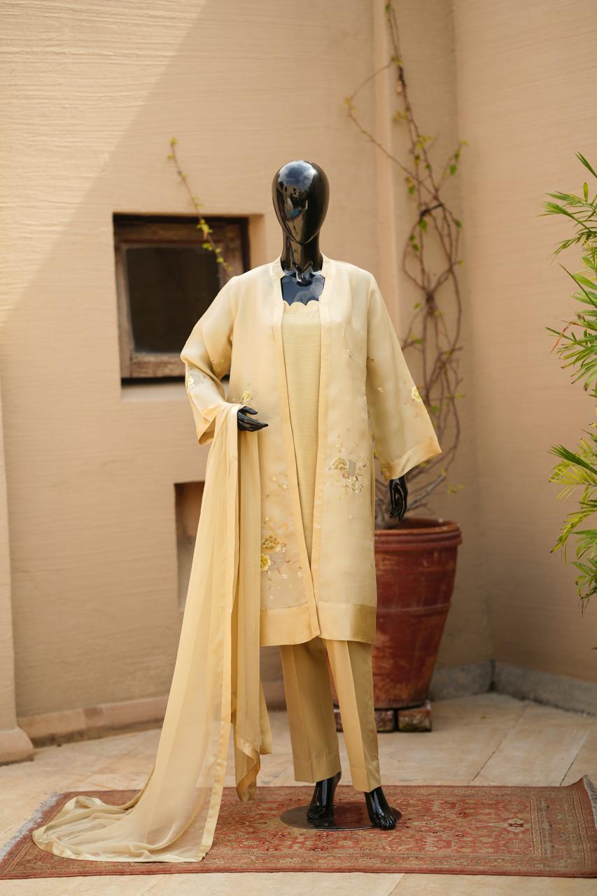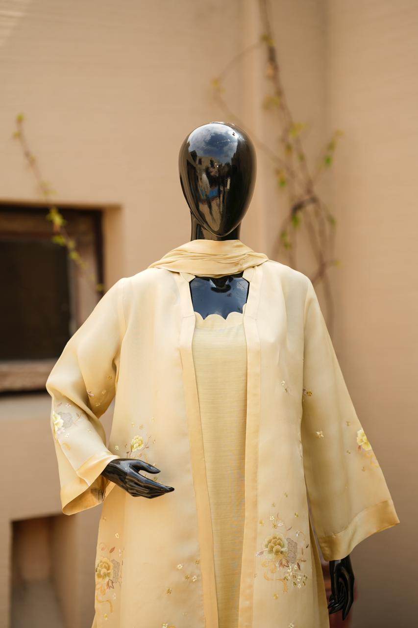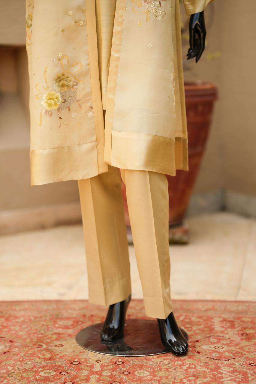 This ensemble radiates timeless sophistication and regal charm. The matt gold organza jacket, adorned with delicate embroidery in shades of gold, creates a luxurious, ethereal look with a subtle sheen that enhances its elegance. The pure silk undershirt and trousers add richness and fluidity, ensuring a graceful silhouette. The silk dupatta with refined finishing ties the entire outfit together, offering a polished and sophisticated touch.