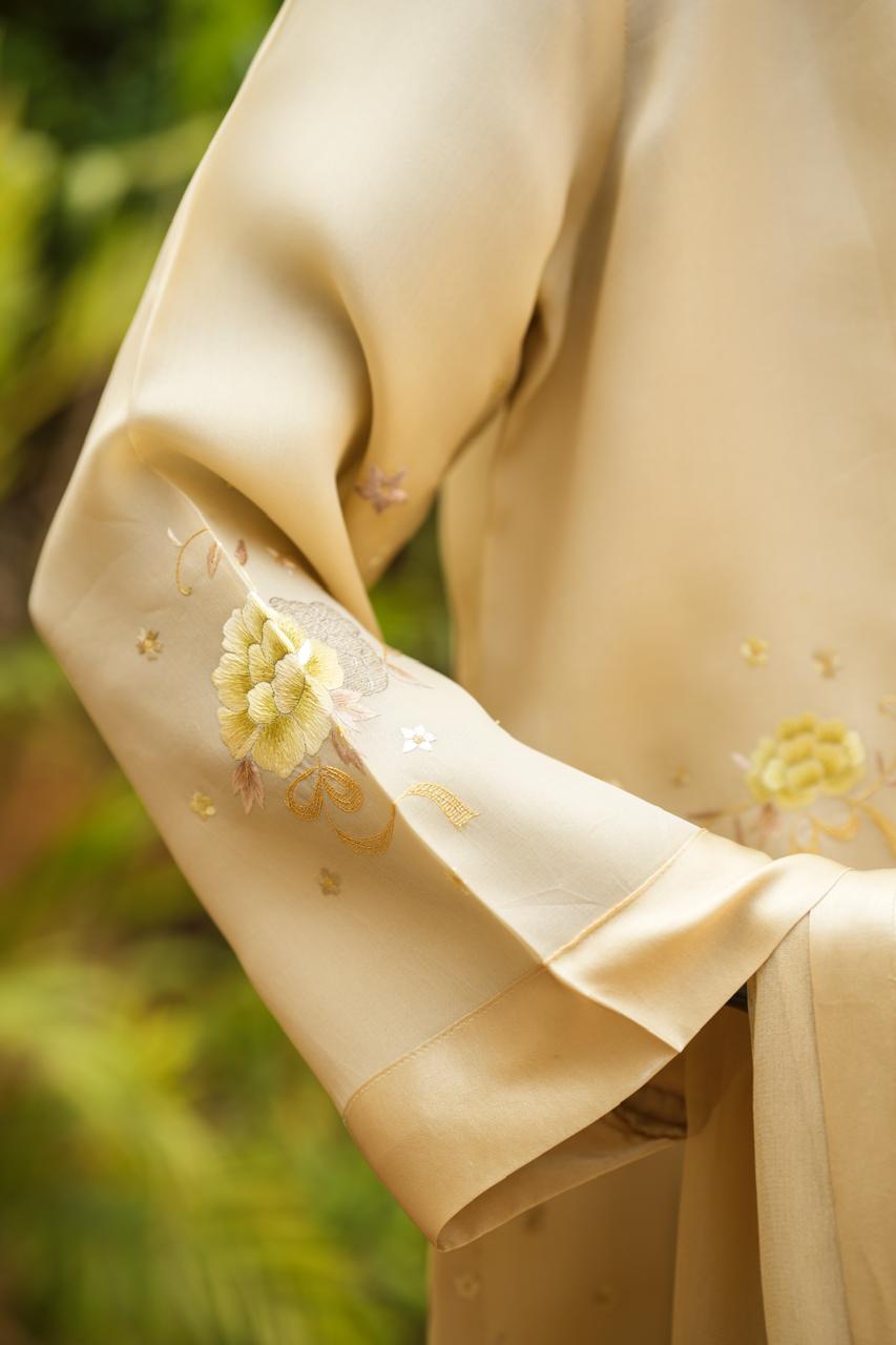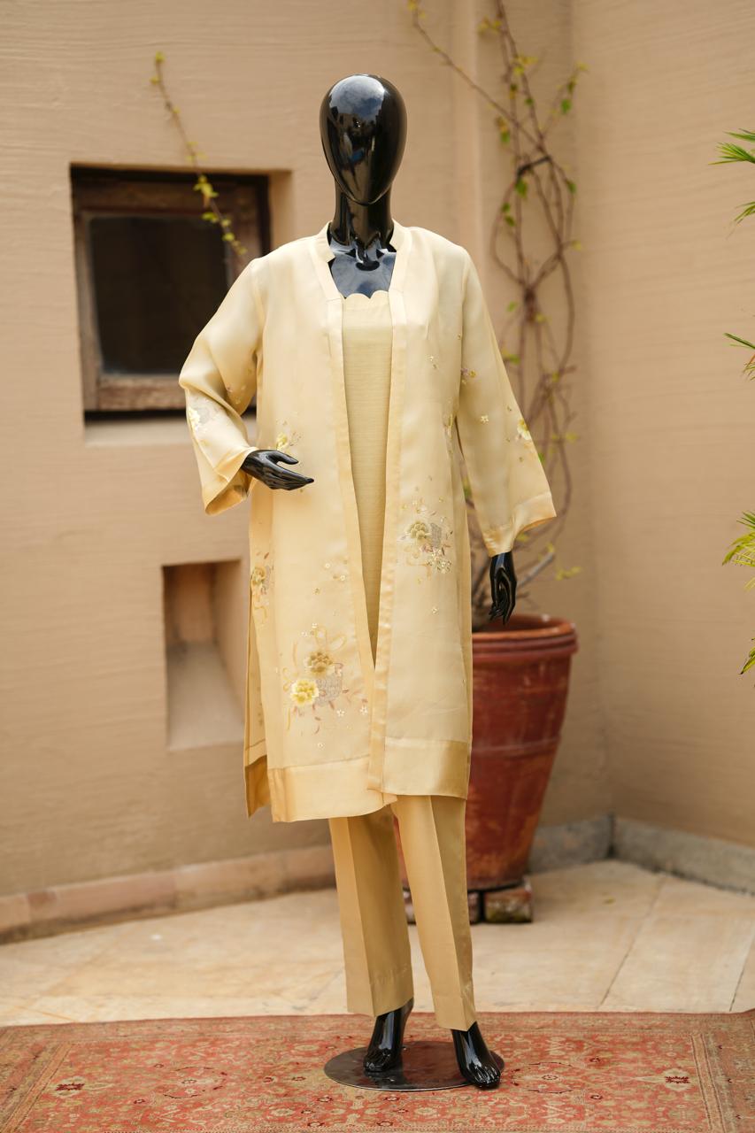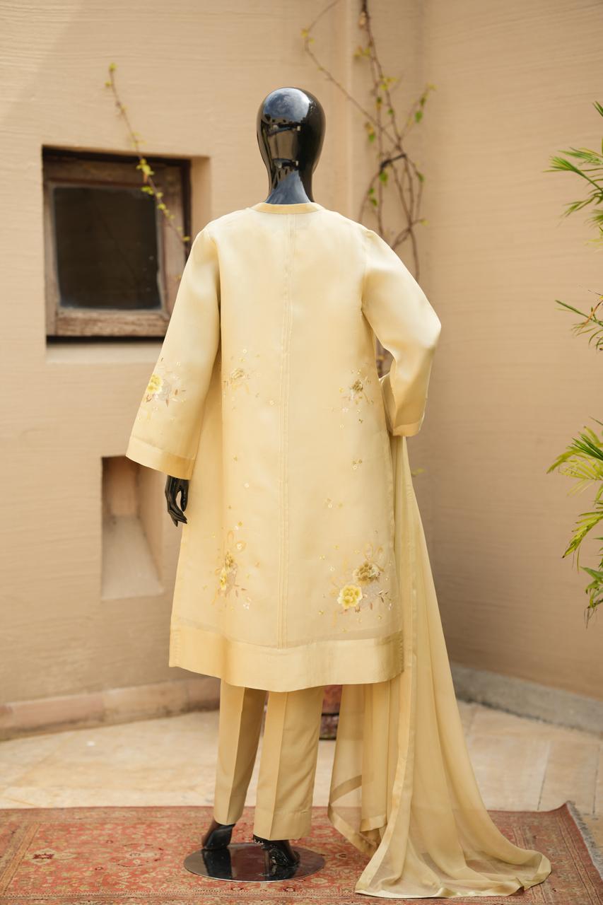 This ensemble radiates timeless sophistication and regal charm. The matt gold organza jacket, adorned with delicate embroidery in shades of gold, creates a luxurious, ethereal look with a subtle sheen that enhances its elegance. The pure silk undershirt and trousers add richness and fluidity, ensuring a graceful silhouette. The silk dupatta with refined finishing ties the entire outfit together, offering a polished and sophisticated touch.