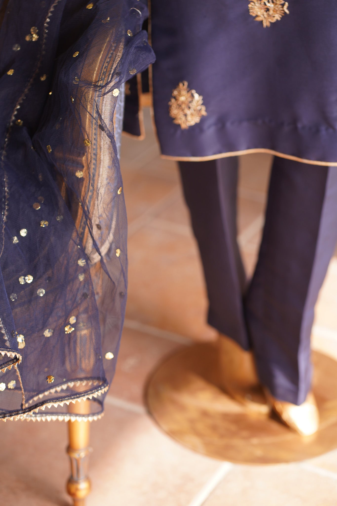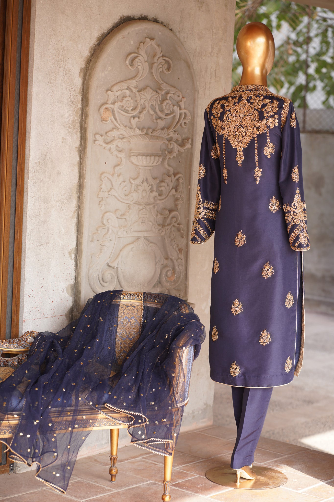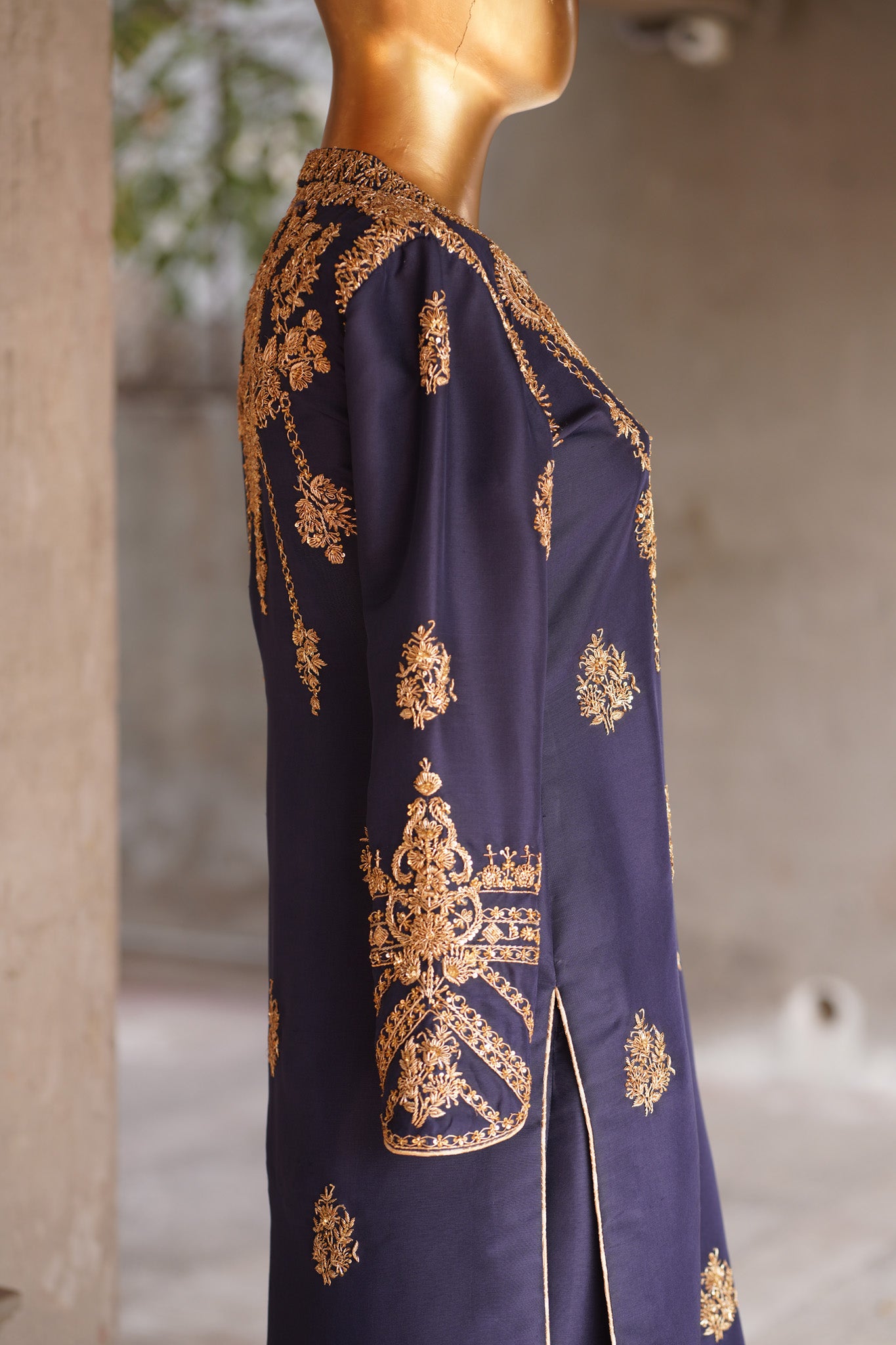 Experience exquisite craftsmanship with this beautiful deep blue raw silk ensemble. Intricate heavy Kam in antique shades of gold is featured on the front and back of the shirt, complemented by a delicate spray of botis. A mukesh bet dupatta adds elegant delicacy, for a look that will take you from day to night. This piece is also adjustable, so you get the perfect fit for your occasion!
