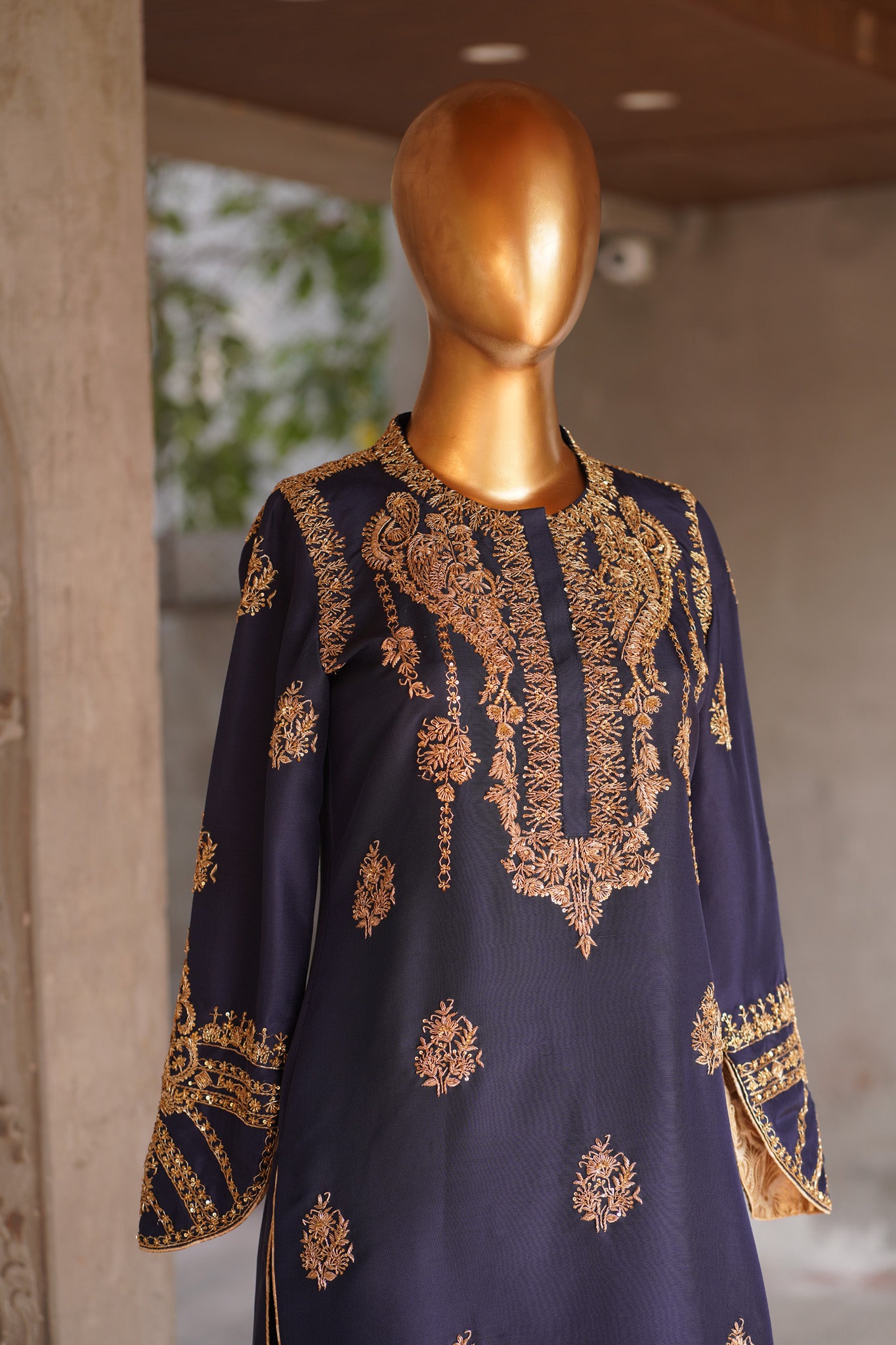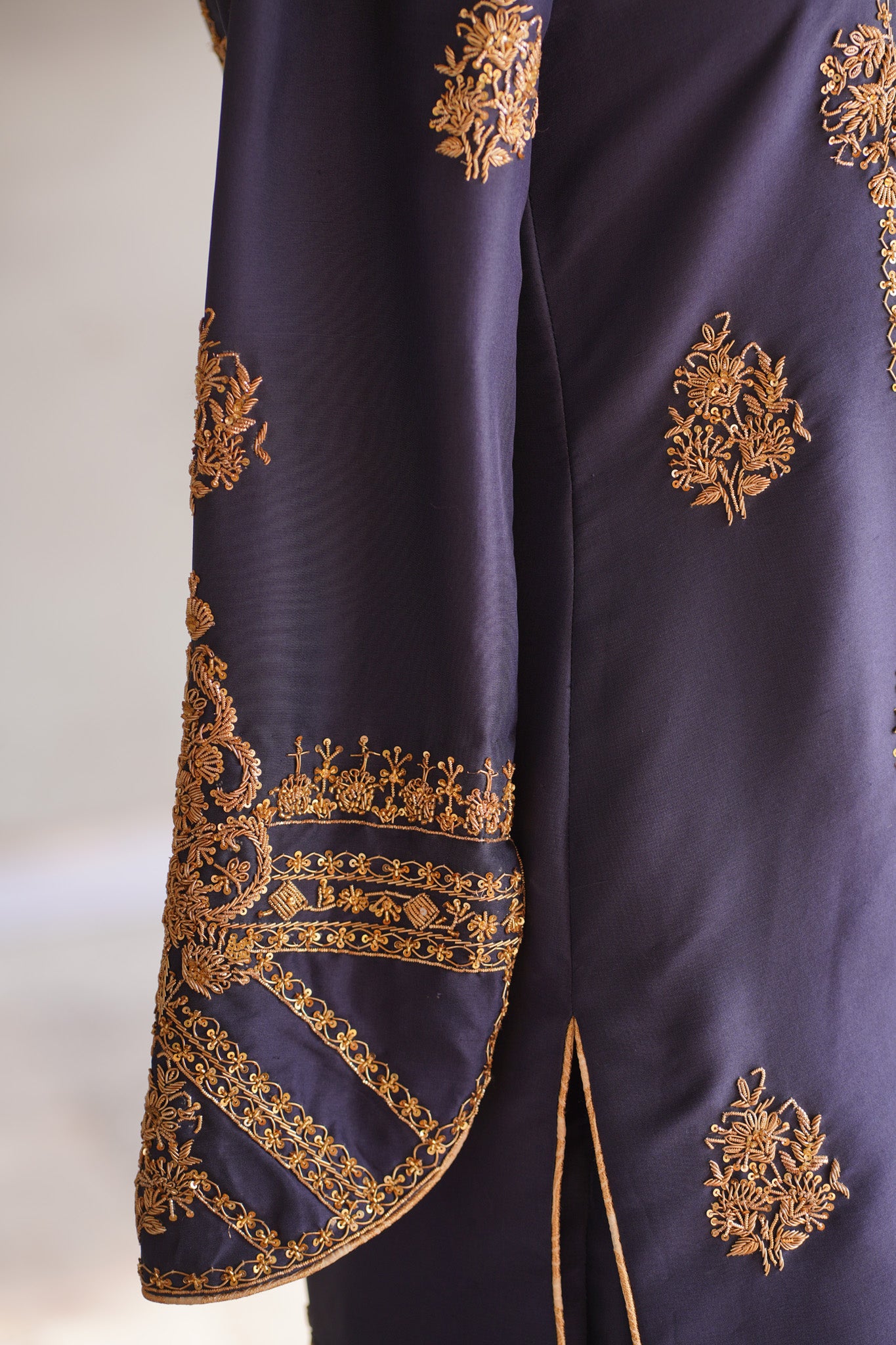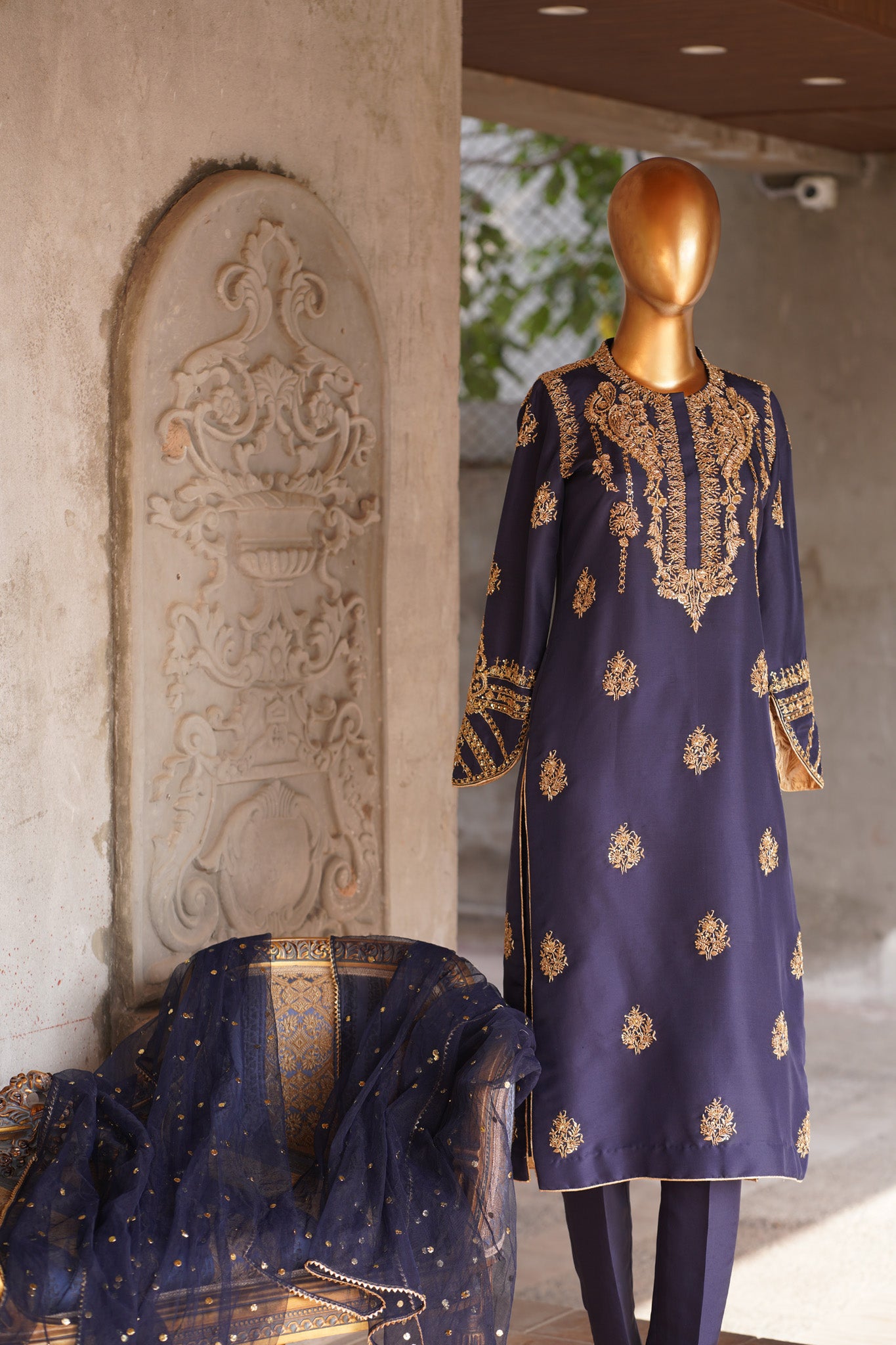 Experience exquisite craftsmanship with this beautiful deep blue raw silk ensemble. Intricate heavy Kam in antique shades of gold is featured on the front and back of the shirt, complemented by a delicate spray of botis. A mukesh bet dupatta adds elegant delicacy, for a look that will take you from day to night. This piece is also adjustable, so you get the perfect fit for your occasion!