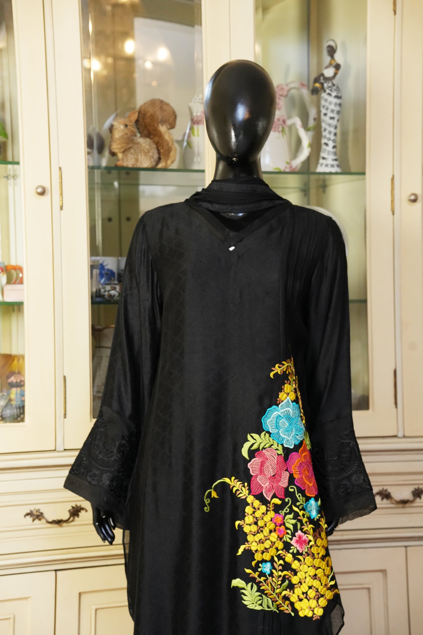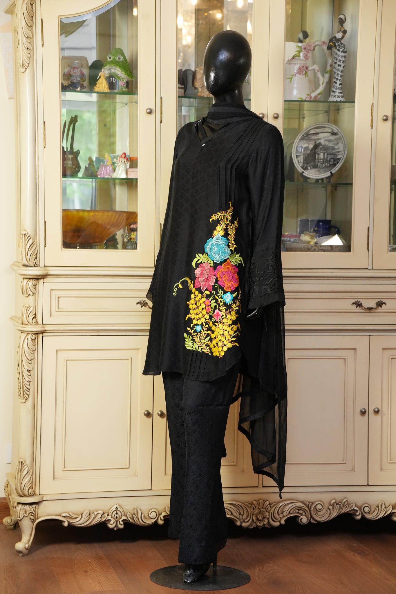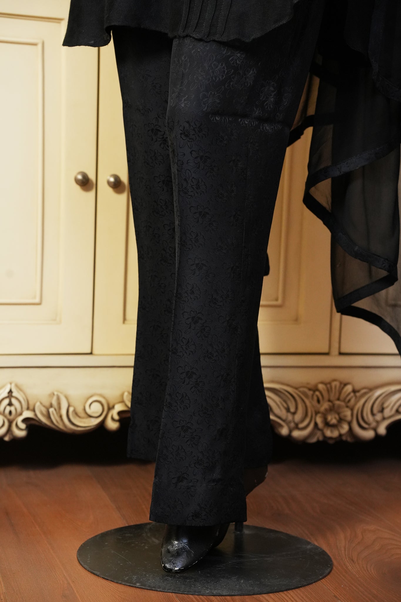 A chic and elegant black cotton net short shirt, perfect for summer evenings. Adorned with vibrant floral embroidery, it adds a lively contrast to the dark base. The broad black lace detailing enhances its sophistication, giving it a refined finish. Paired with bootcut self-embossed silk pants, this ensemble strikes the perfect balance between contemporary style and timeless grace. Ideal for effortless evening elegance.