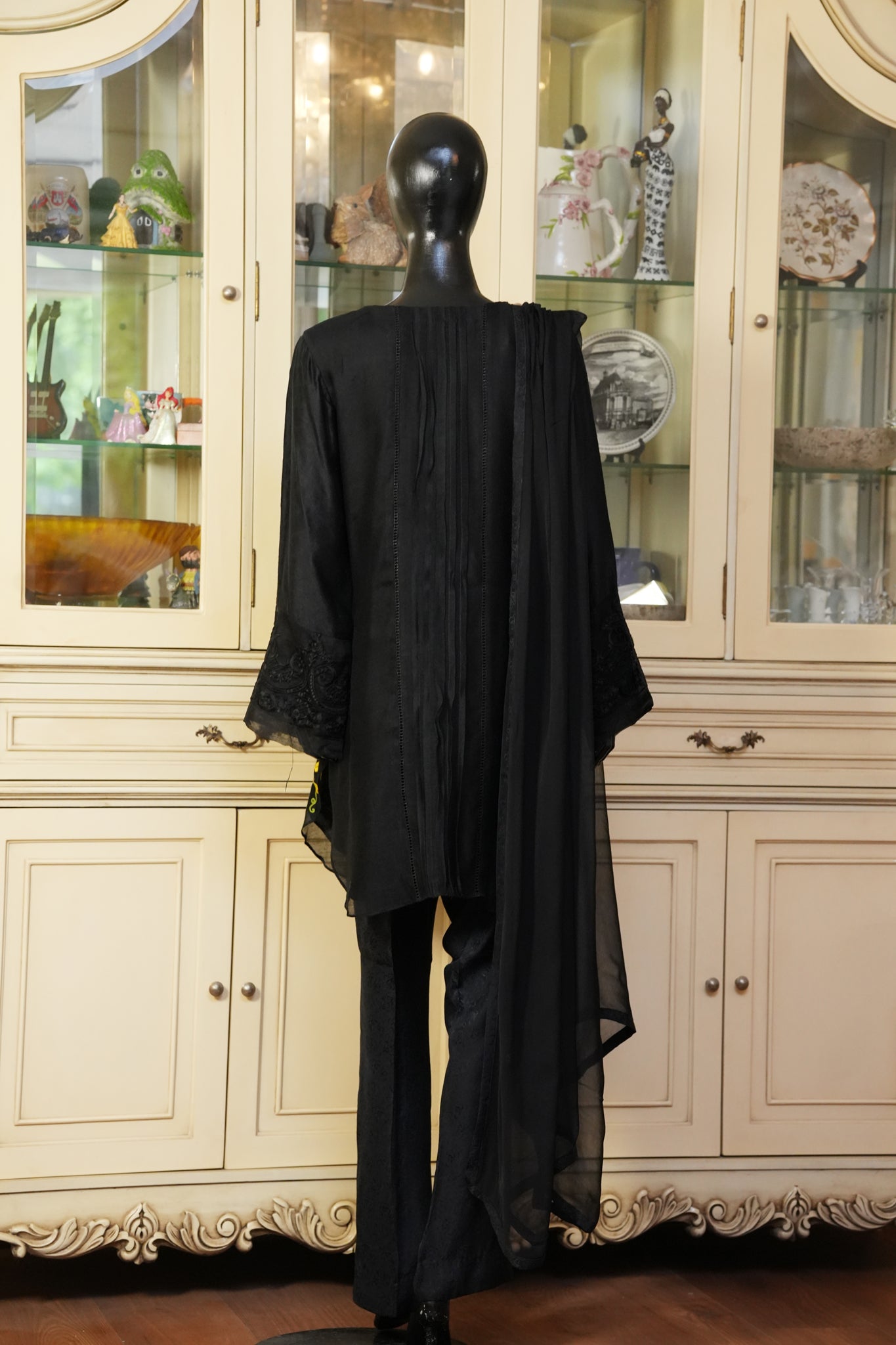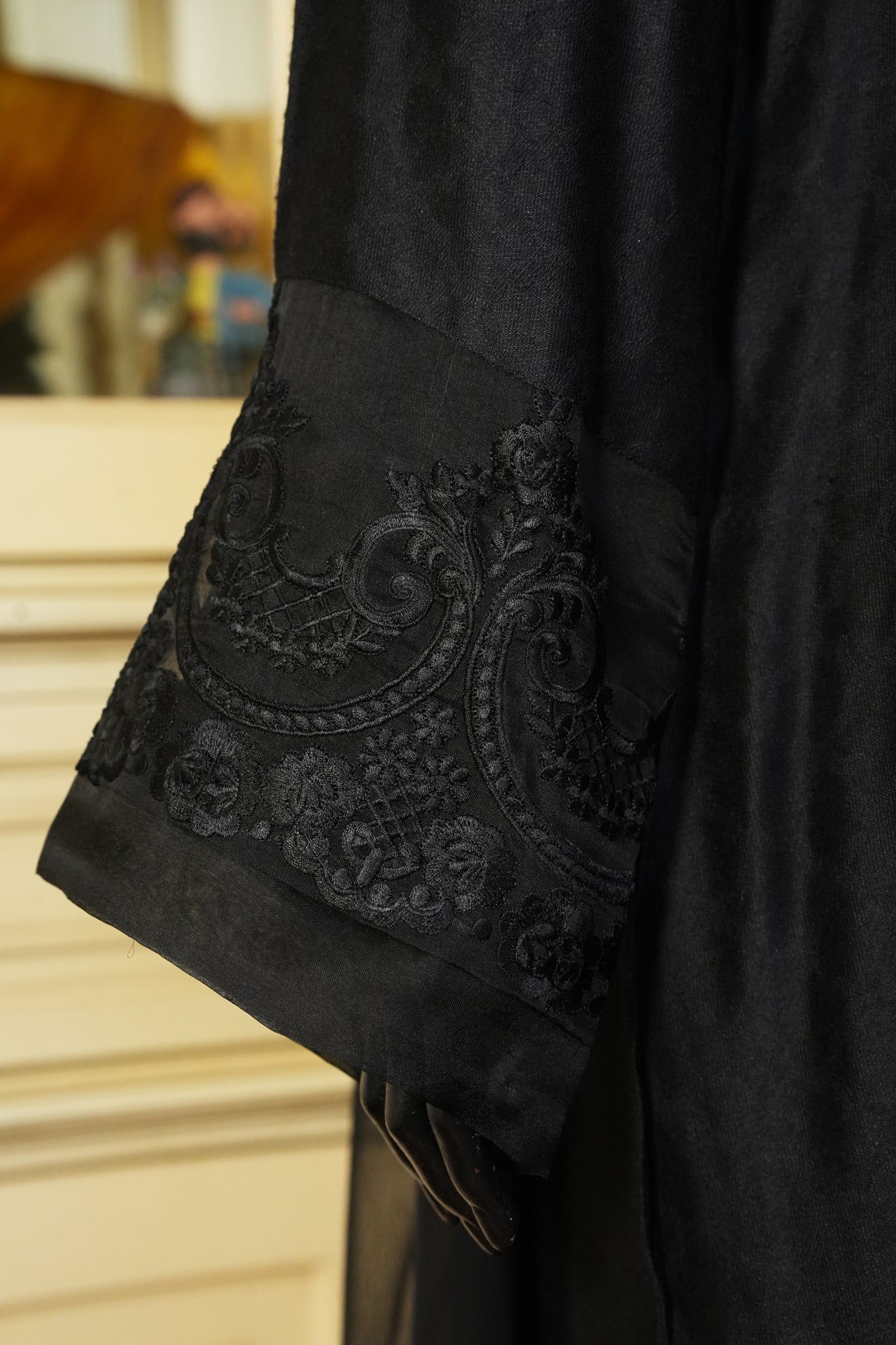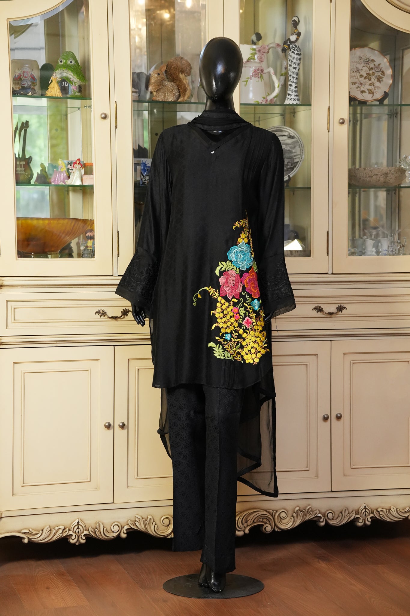 A chic and elegant black cotton net short shirt, perfect for summer evenings. Adorned with vibrant floral embroidery, it adds a lively contrast to the dark base. The broad black lace detailing enhances its sophistication, giving it a refined finish. Paired with bootcut self-embossed silk pants, this ensemble strikes the perfect balance between contemporary style and timeless grace. Ideal for effortless evening elegance.