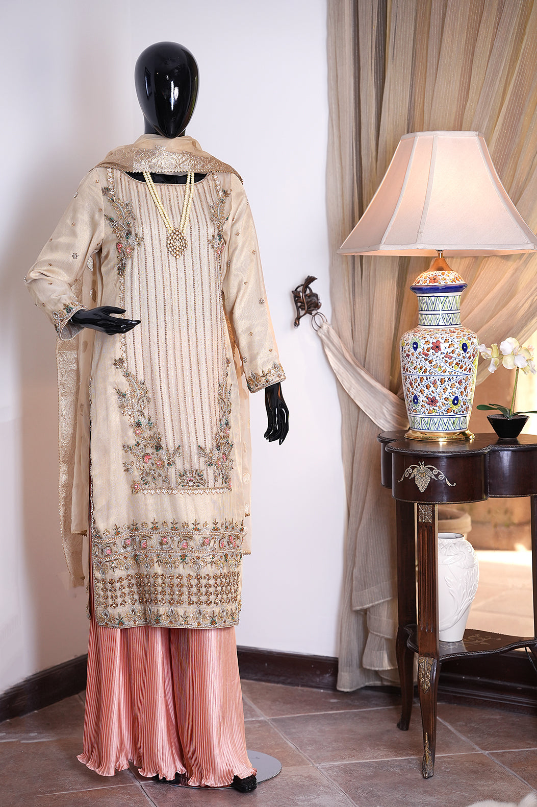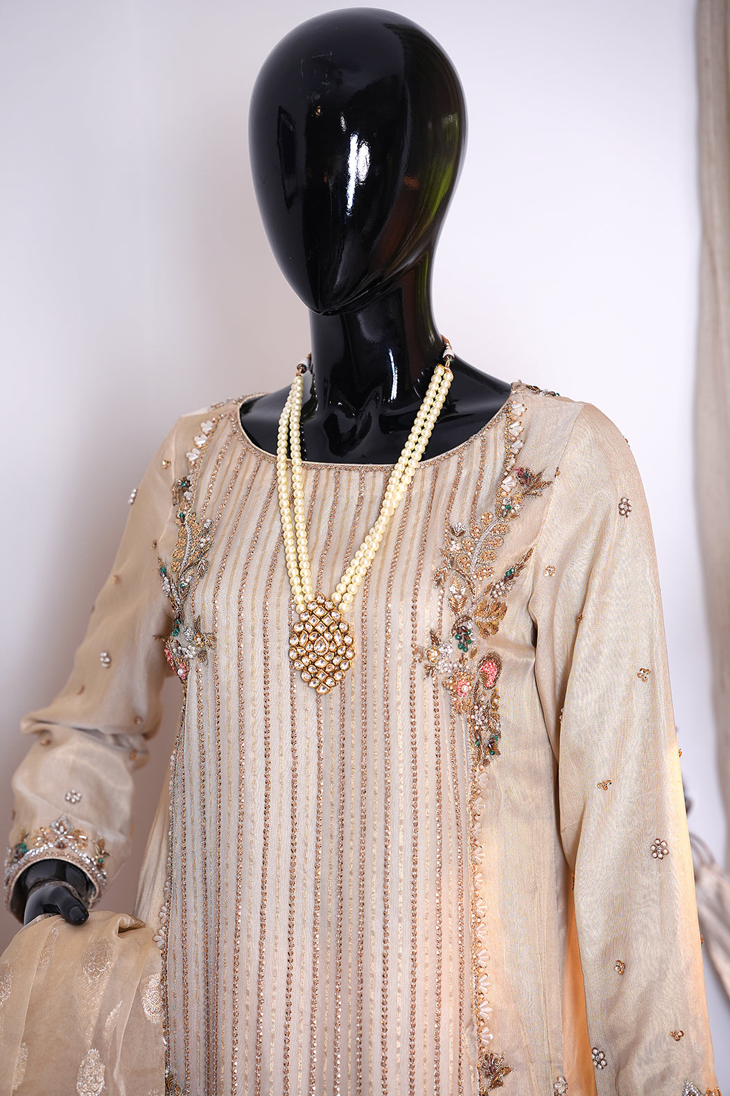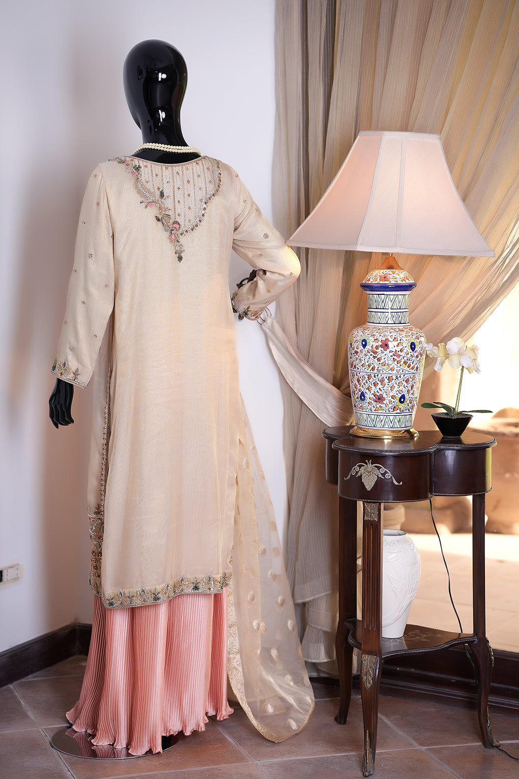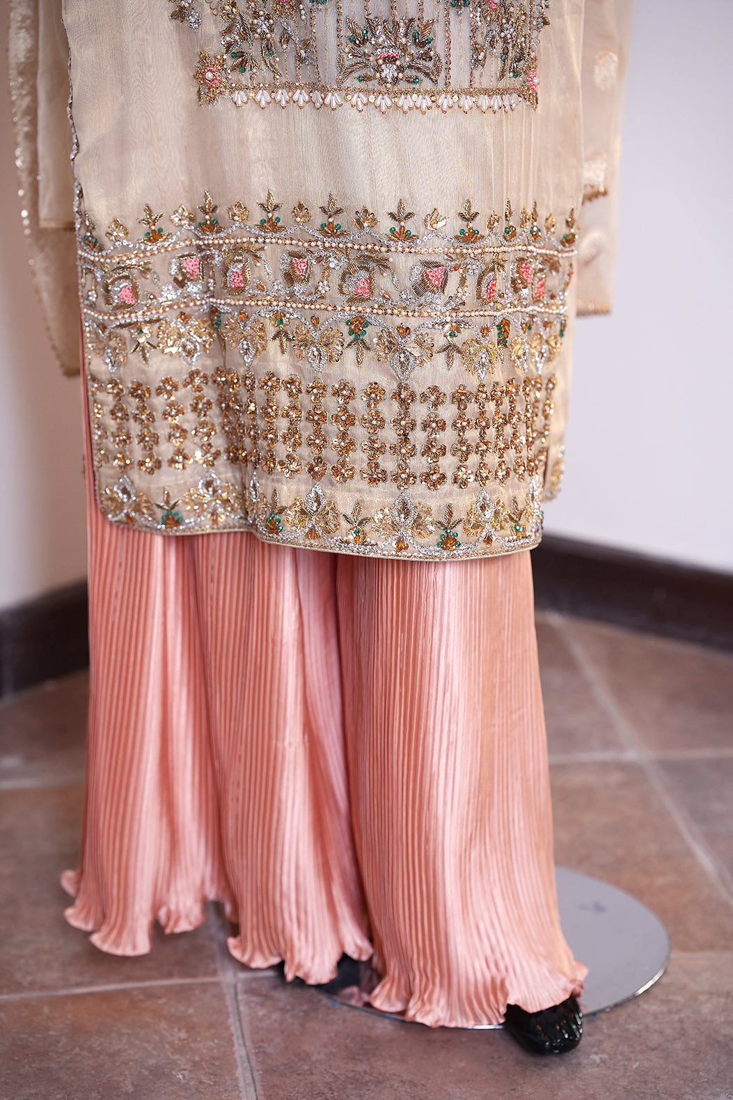 A cream shirt of cotton net and organza with beadwork paired with a stylish crushed sharara, combining sophistication and style.