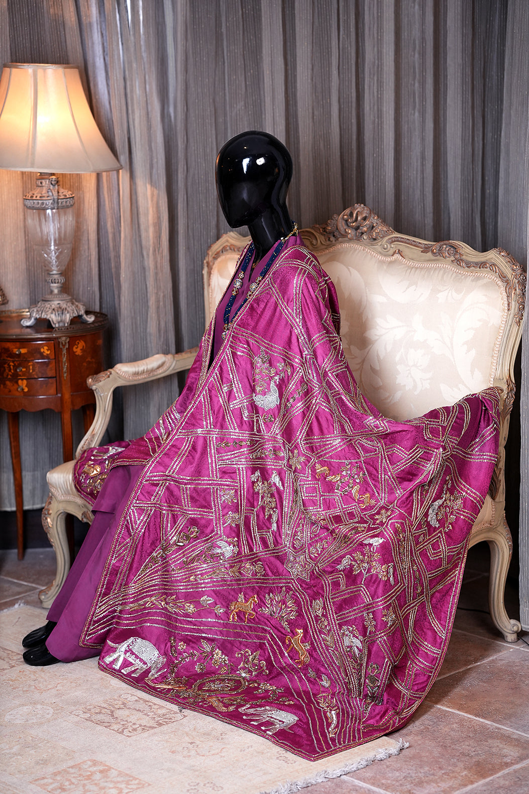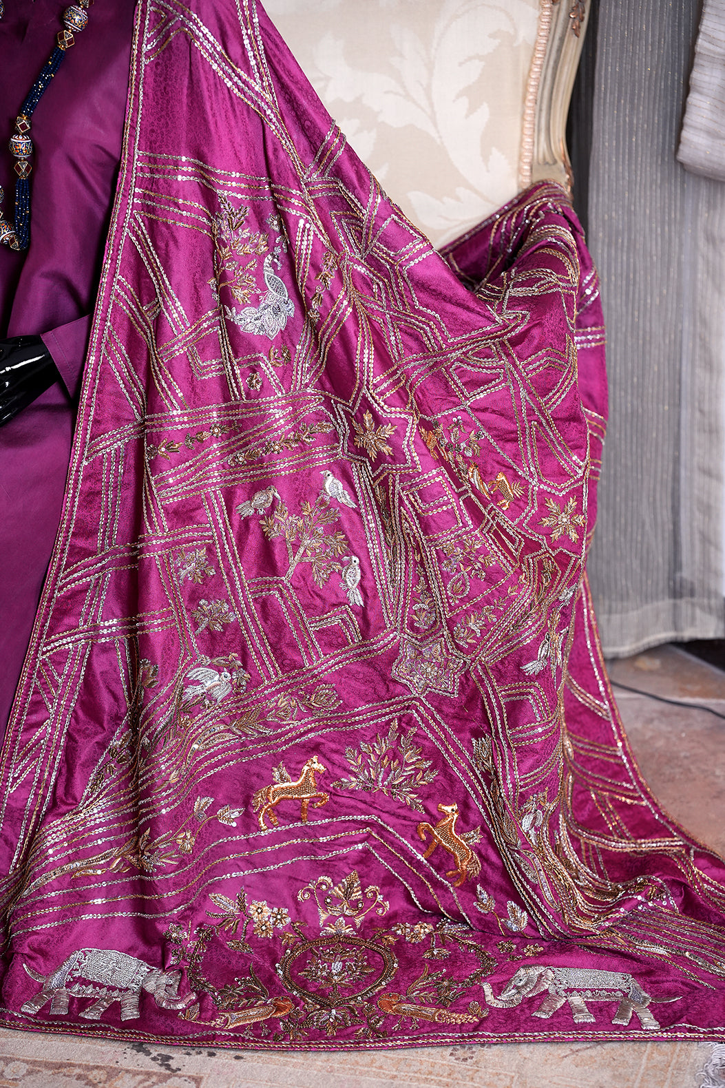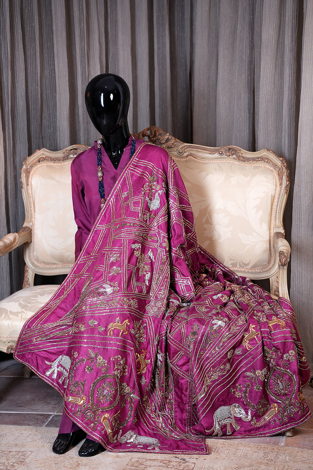 This elegant Periwinkle features deep plum and kam in the shades of antique gold, intricately decorated with bird and animal motifs. It's a timeless piece that will bring a touch of culture and sophistication to any space.