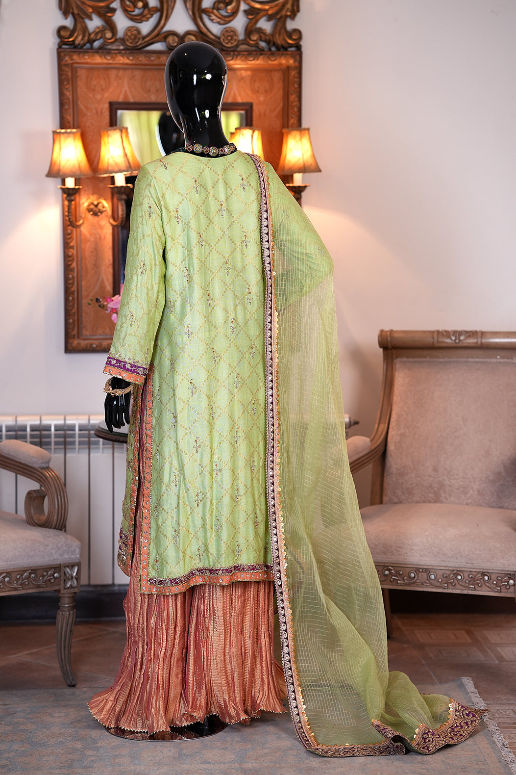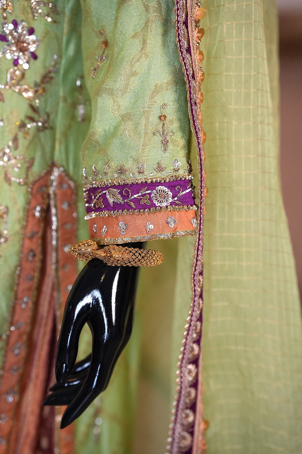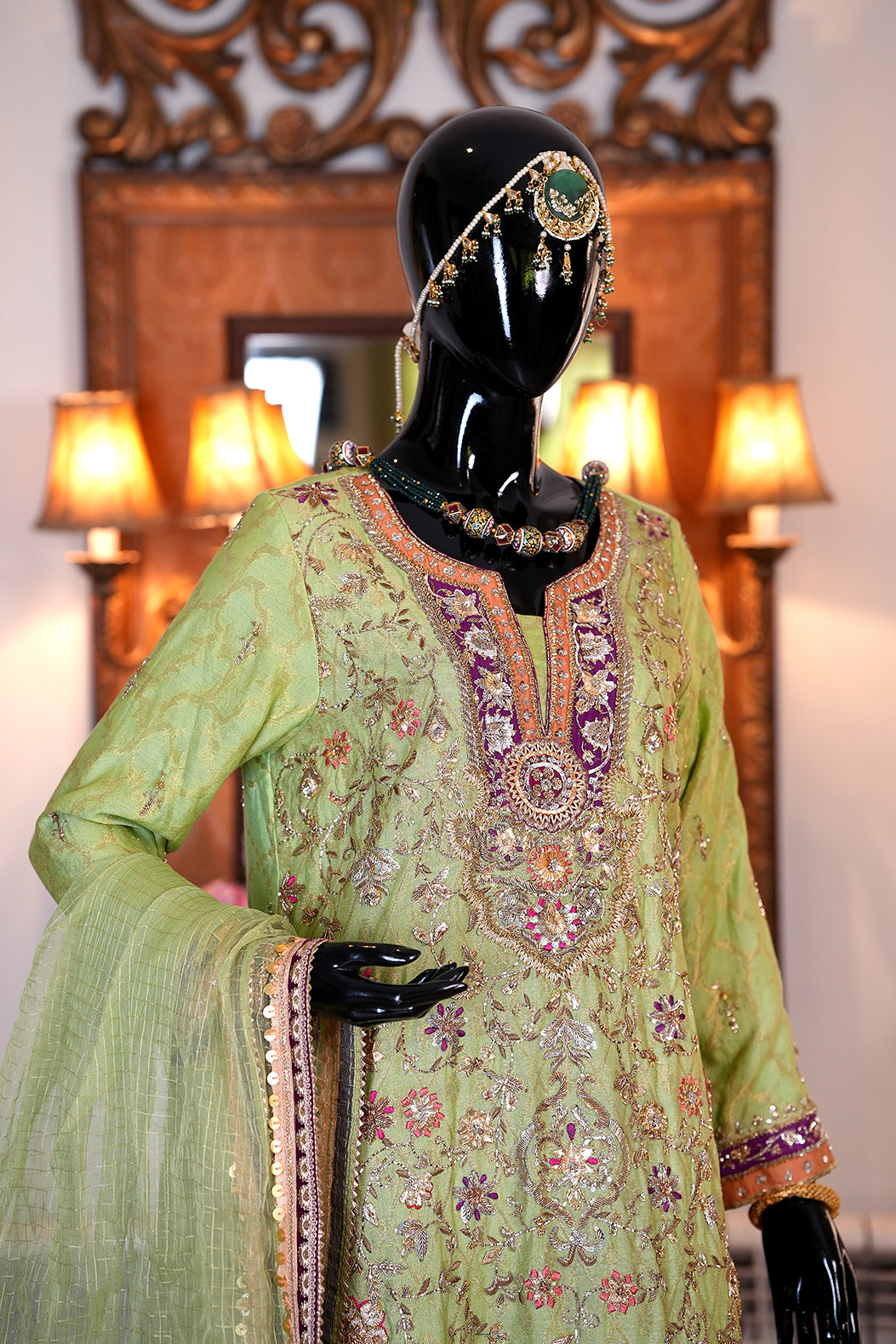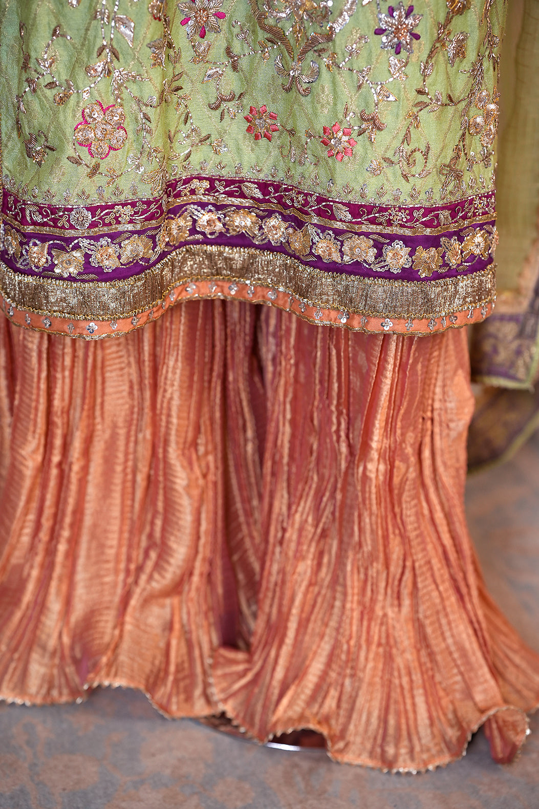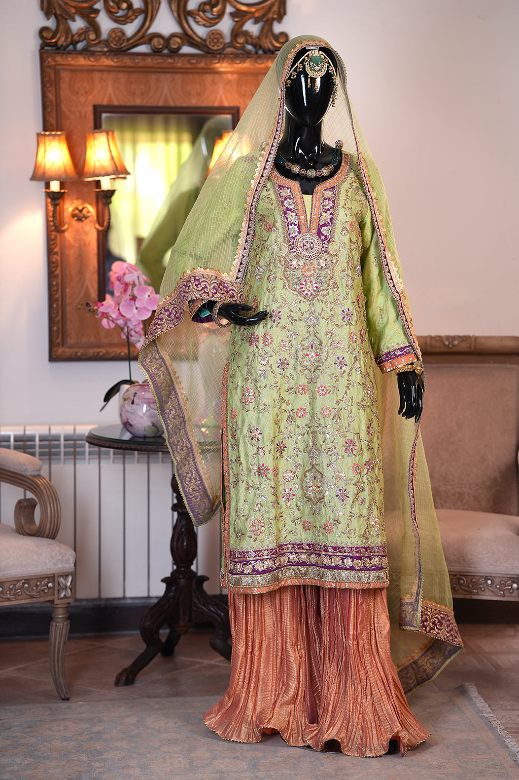 A traditional ensemble with a pista green long shirt adorned with Mukesh work, thread, and zardozi. Contrasting pattis bring in additional colors, complementing the crushed tissue sharara for a graceful look.