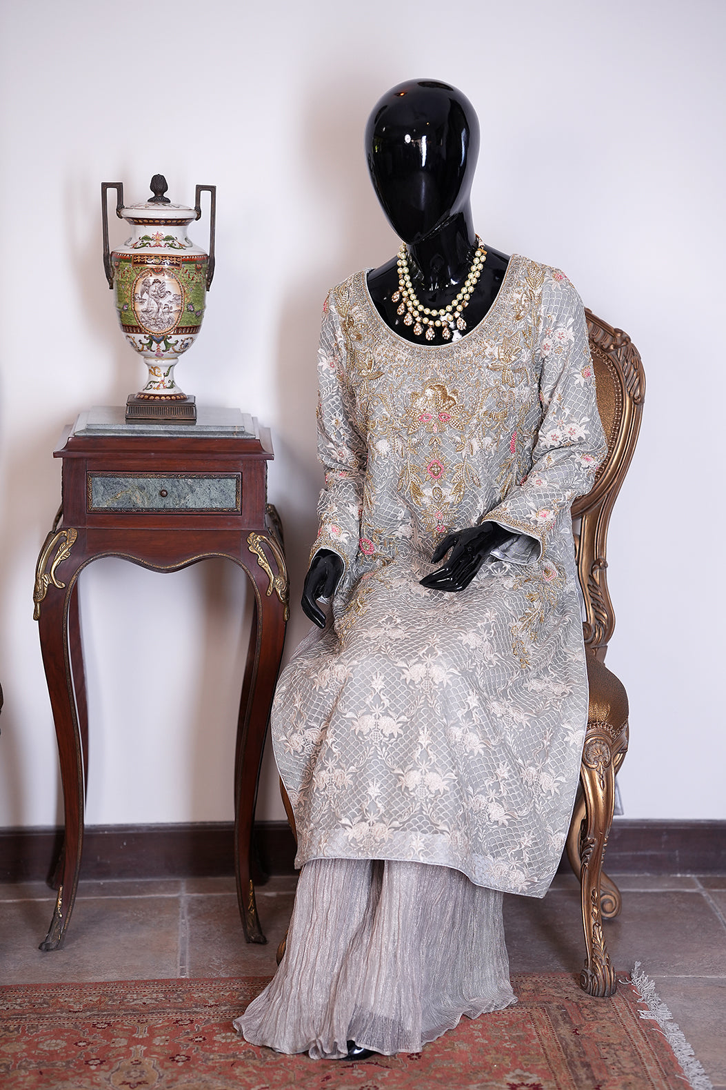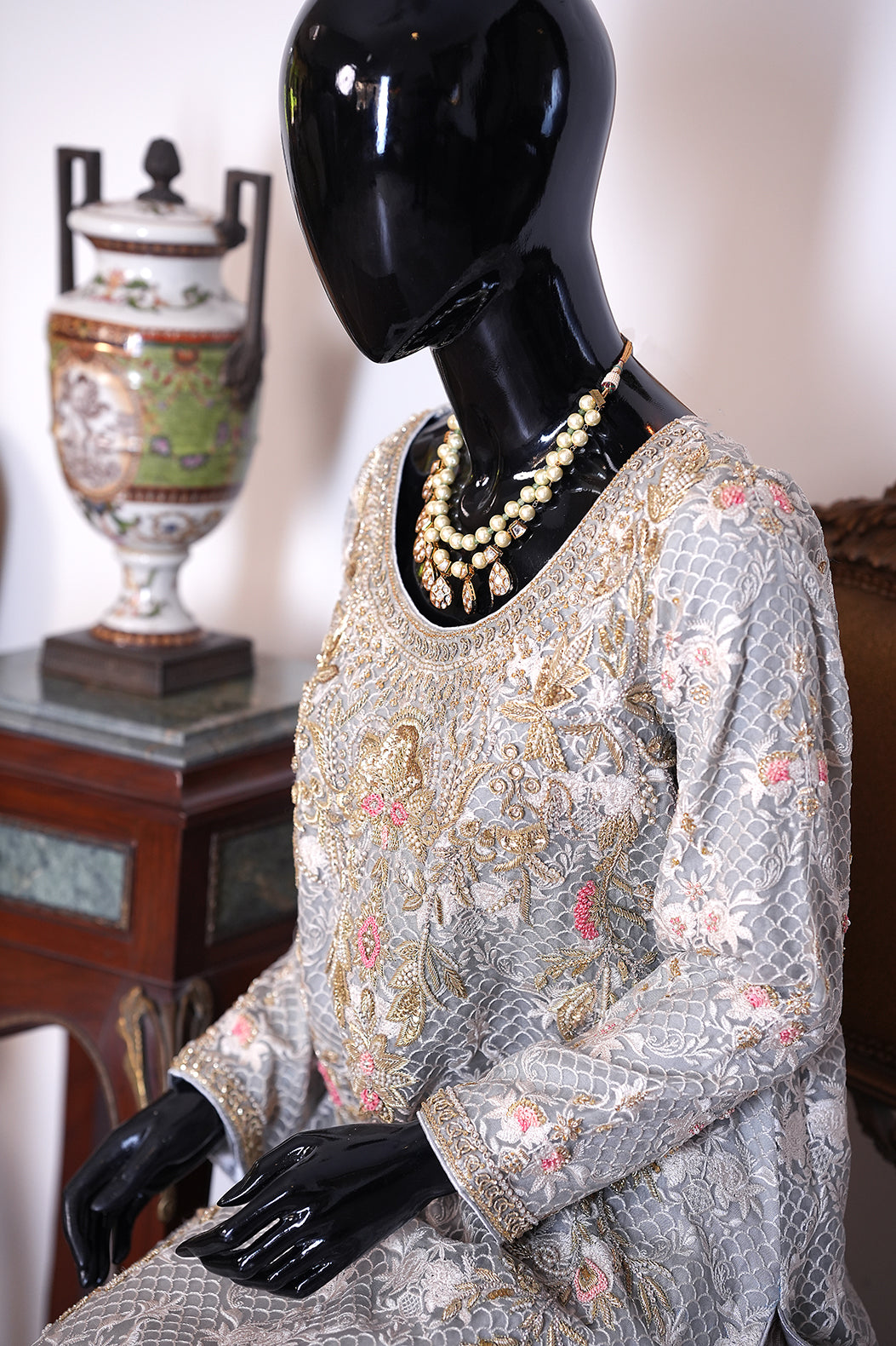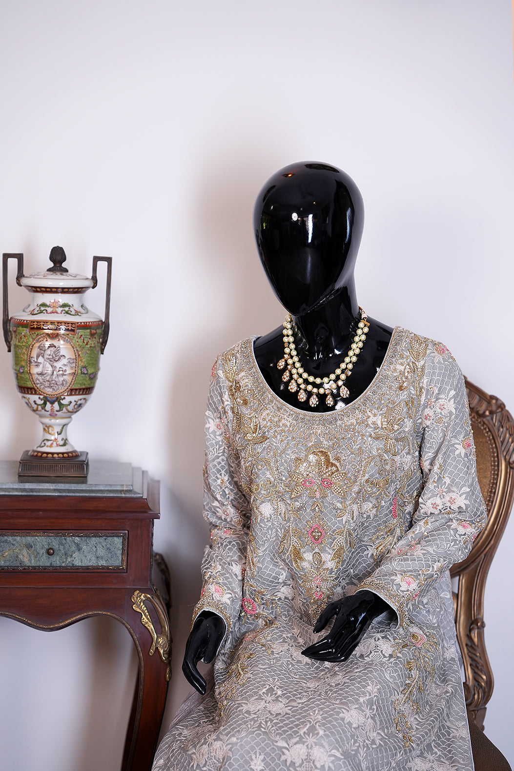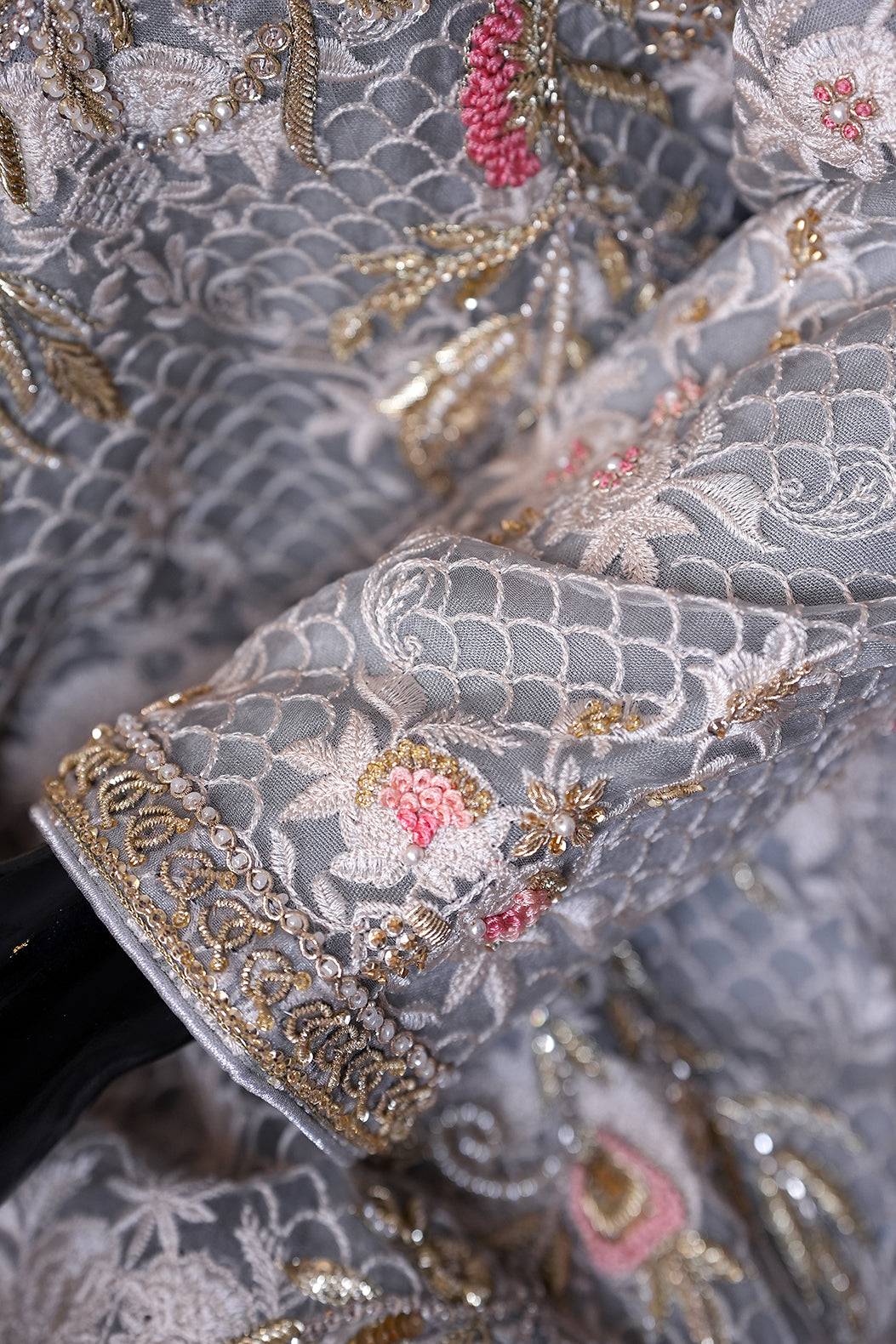 Grey embroidery organza, gold and pearl kam with peach thread work