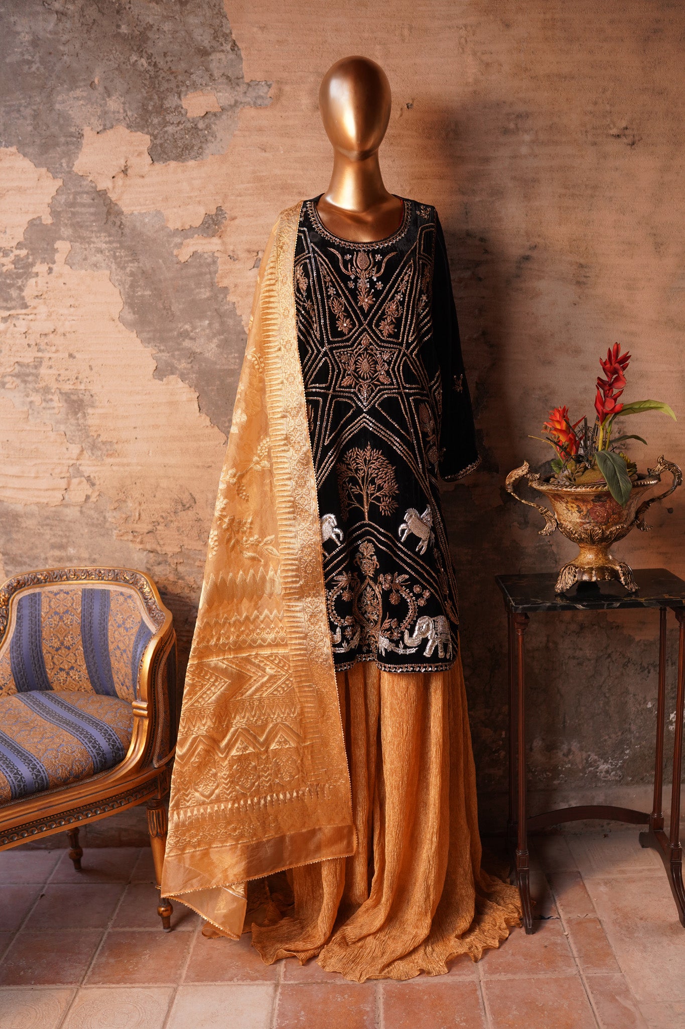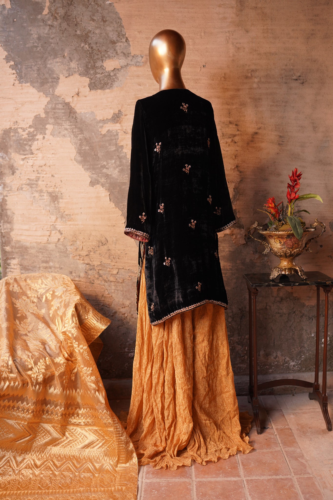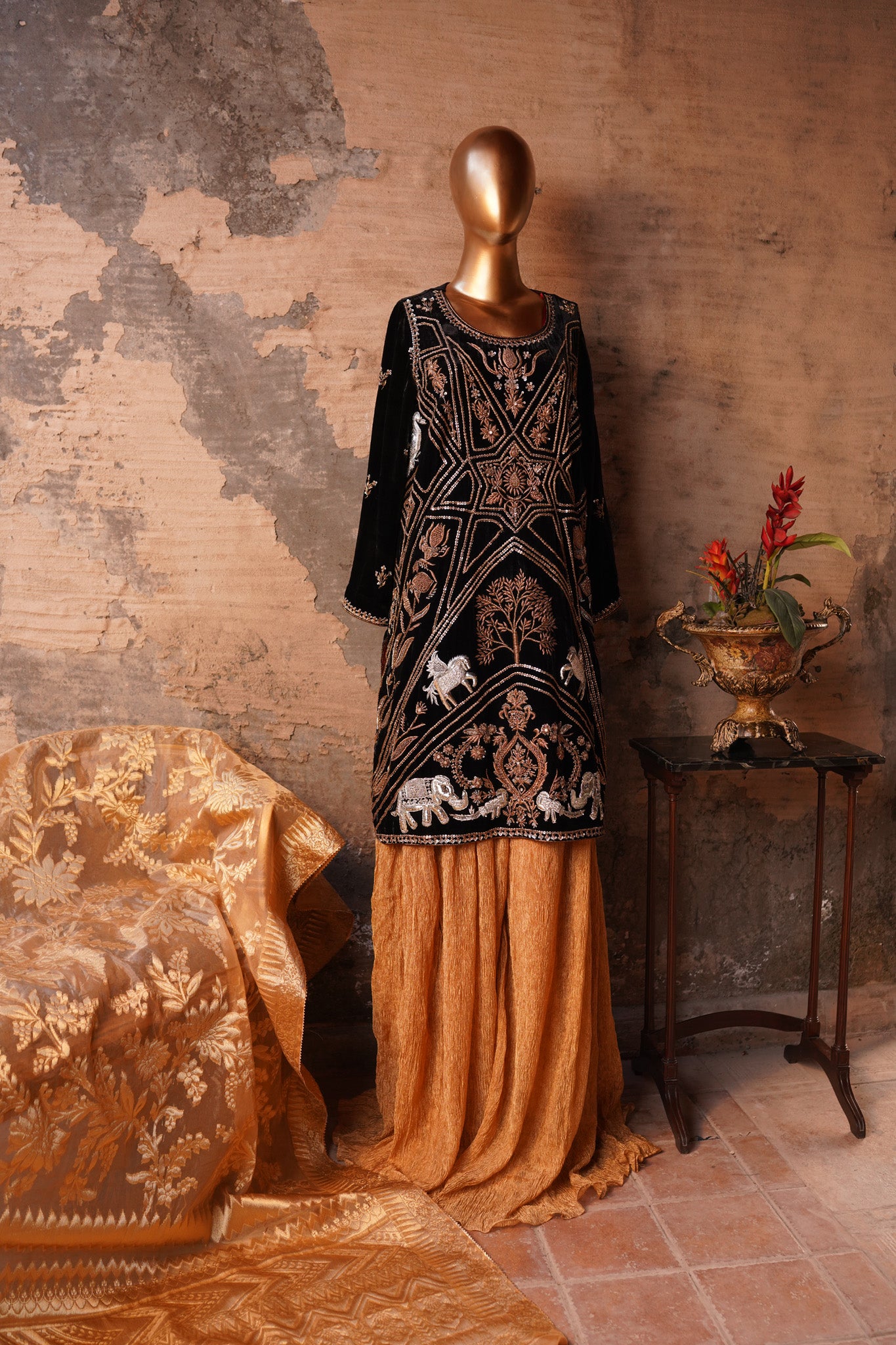 Introducing Parinda from our exclusive Heritage collection! Made with exquisite velvet and Ganga Jamni kam in timeless antique Gold colors, it's the perfect addition to your wardrobe. Perfectly paired with a crushed tissue sharara and dupatta, it's specially designed to bring out your best and make you stand out. Plus, it's available in any size and can be customized for a truly unique look. Make a statement with Parinda today.
