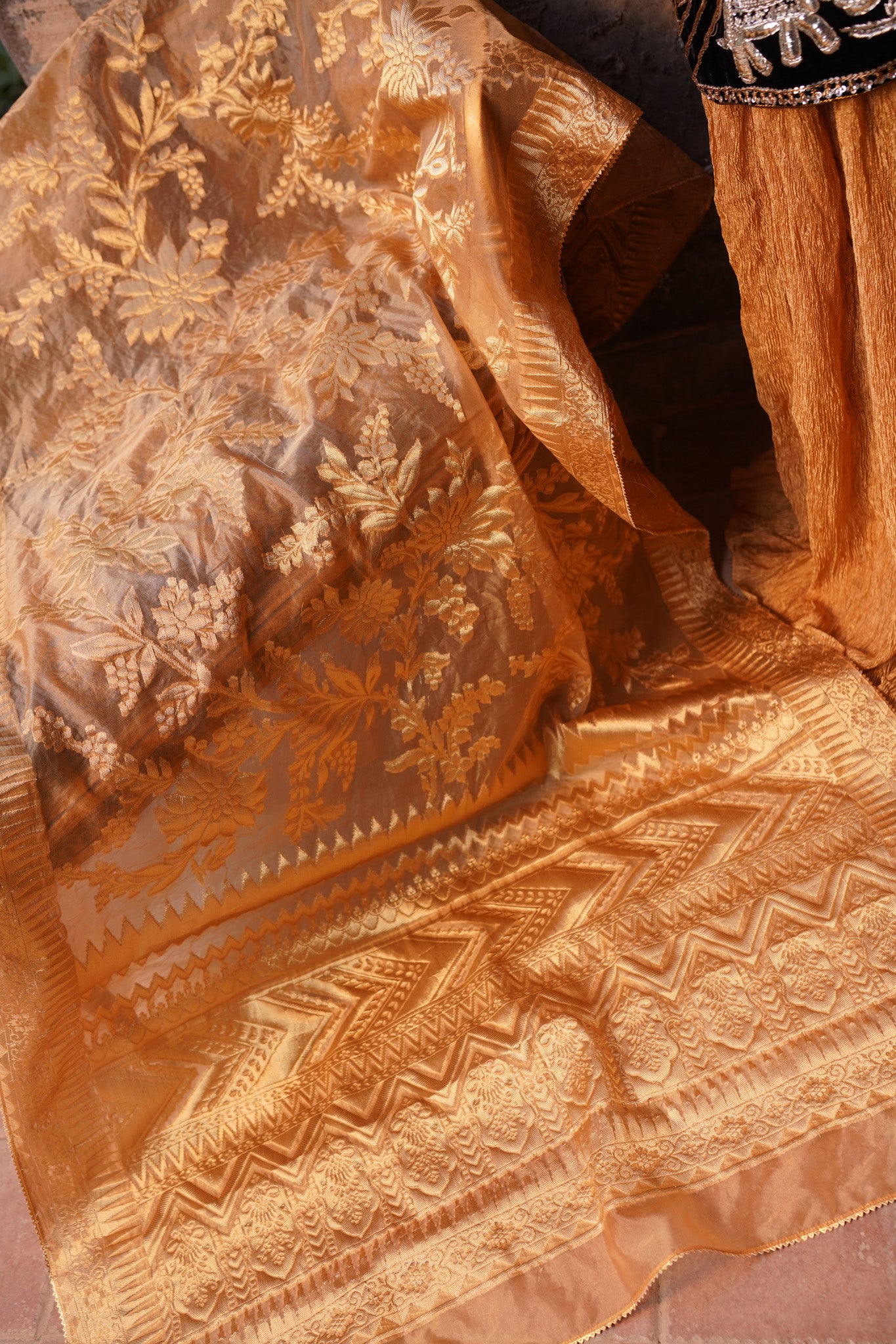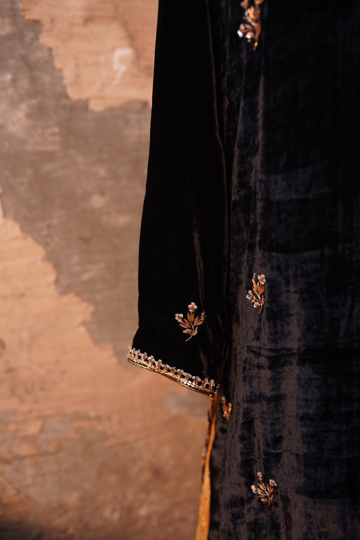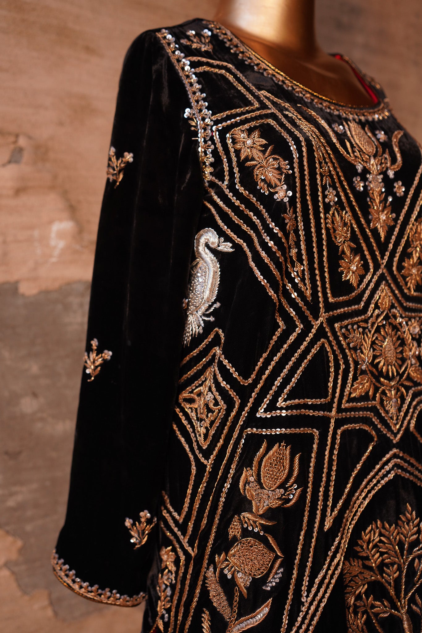 Introducing Parinda from our exclusive Heritage collection! Made with exquisite velvet and Ganga Jamni kam in timeless antique Gold colors, it's the perfect addition to your wardrobe. Perfectly paired with a crushed tissue sharara and dupatta, it's specially designed to bring out your best and make you stand out. Plus, it's available in any size and can be customized for a truly unique look. Make a statement with Parinda today.