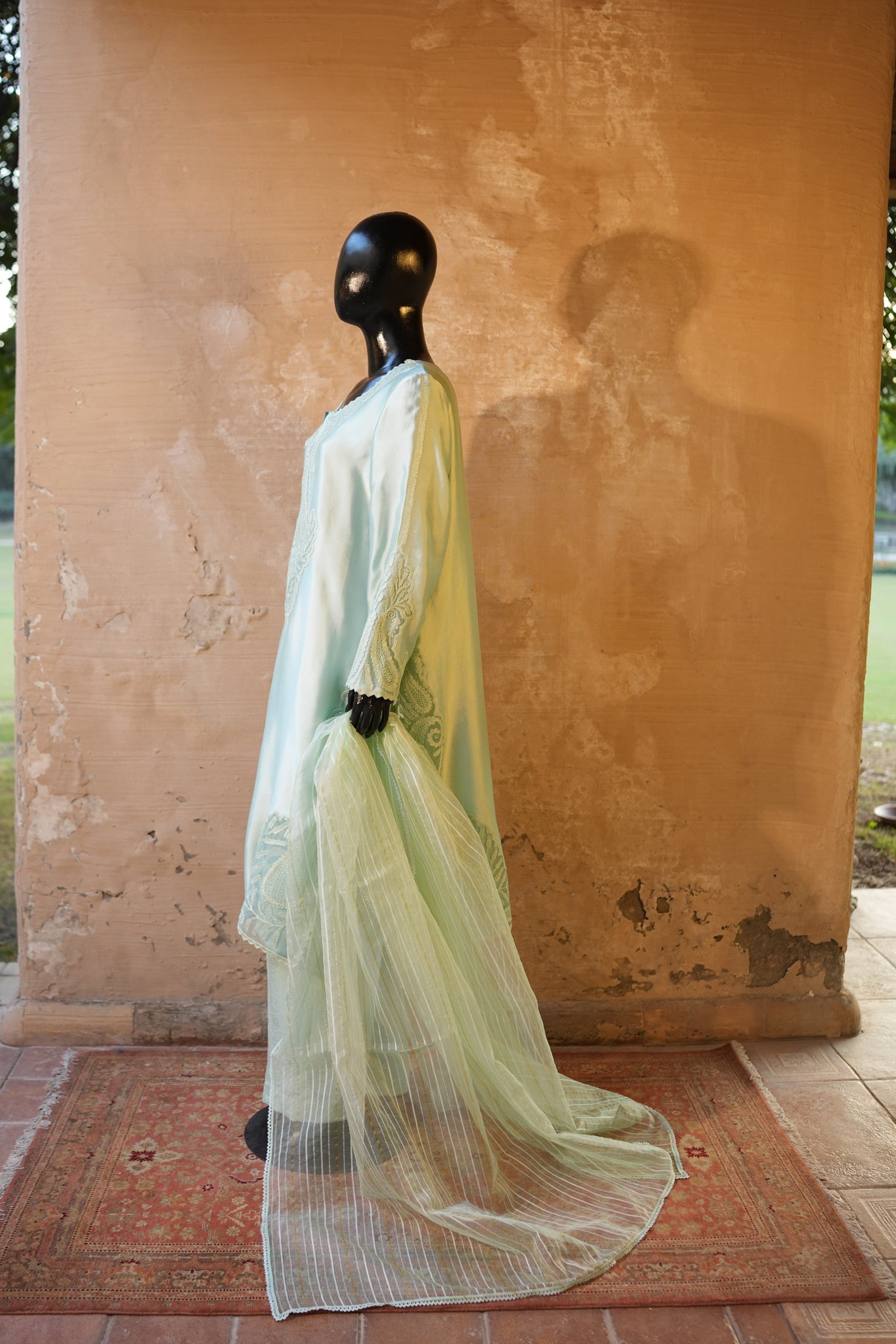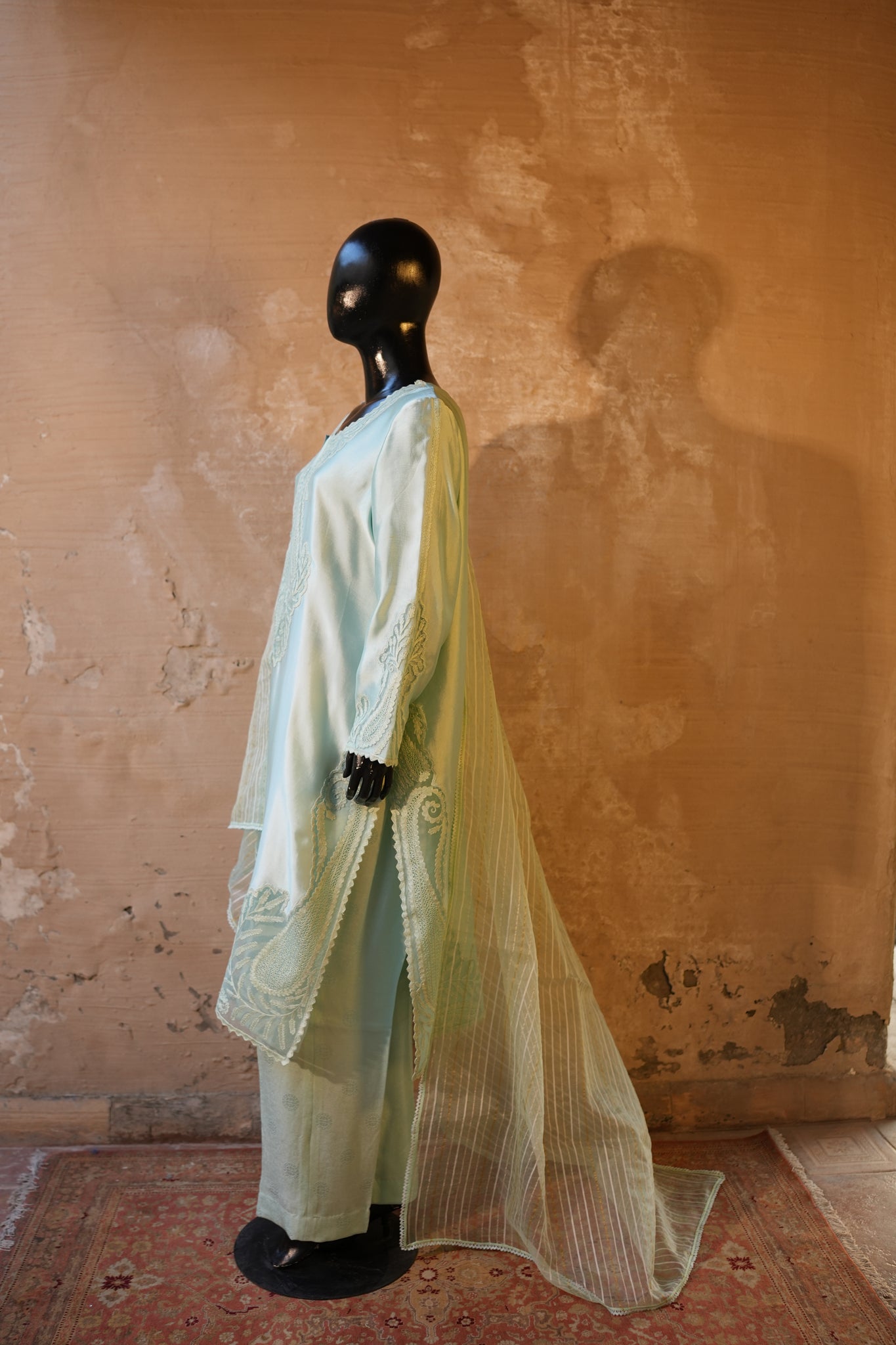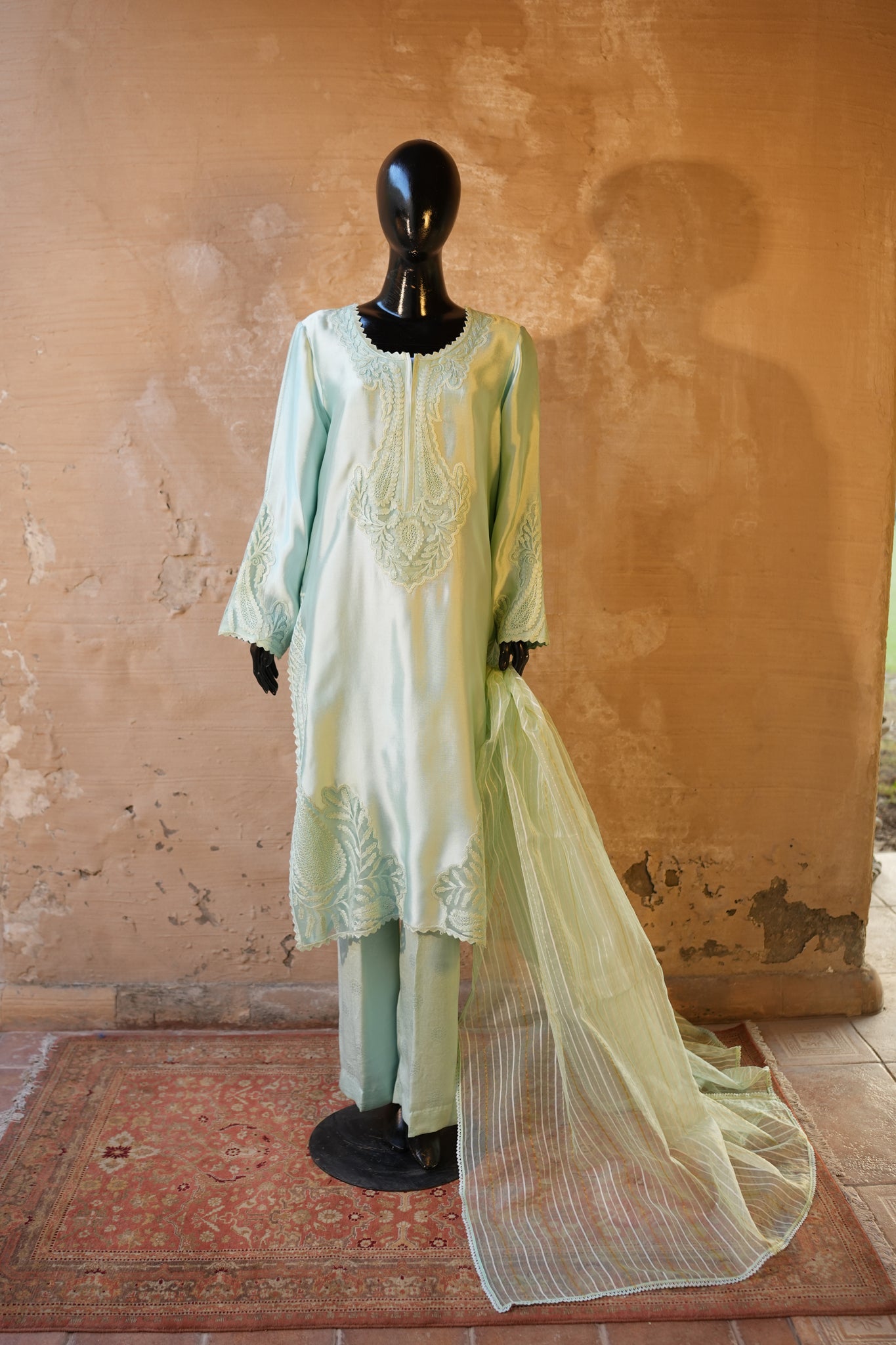 Sheer organza dupatta light and airy, perfectly complementing the elegance of the silk shirt.