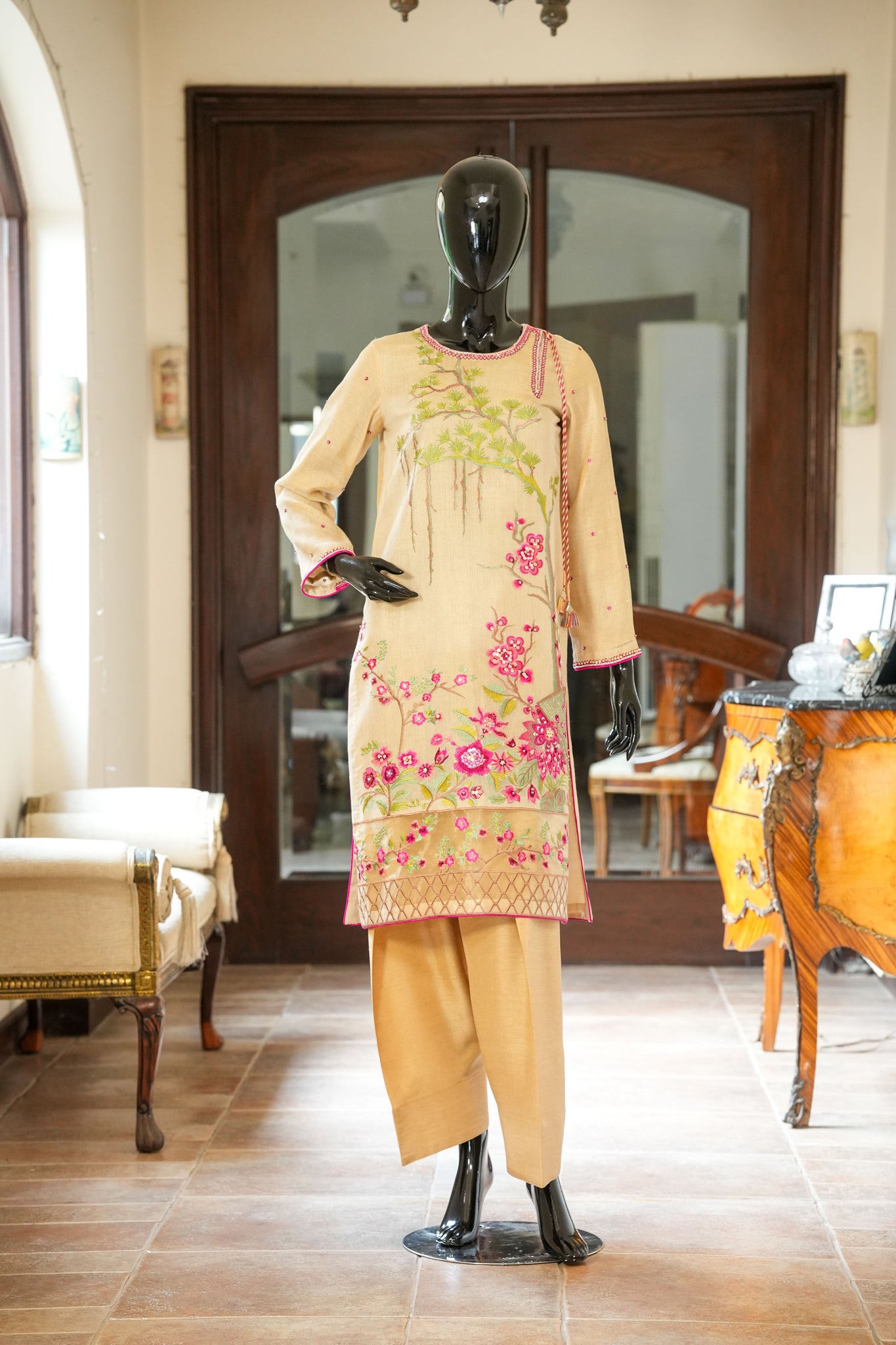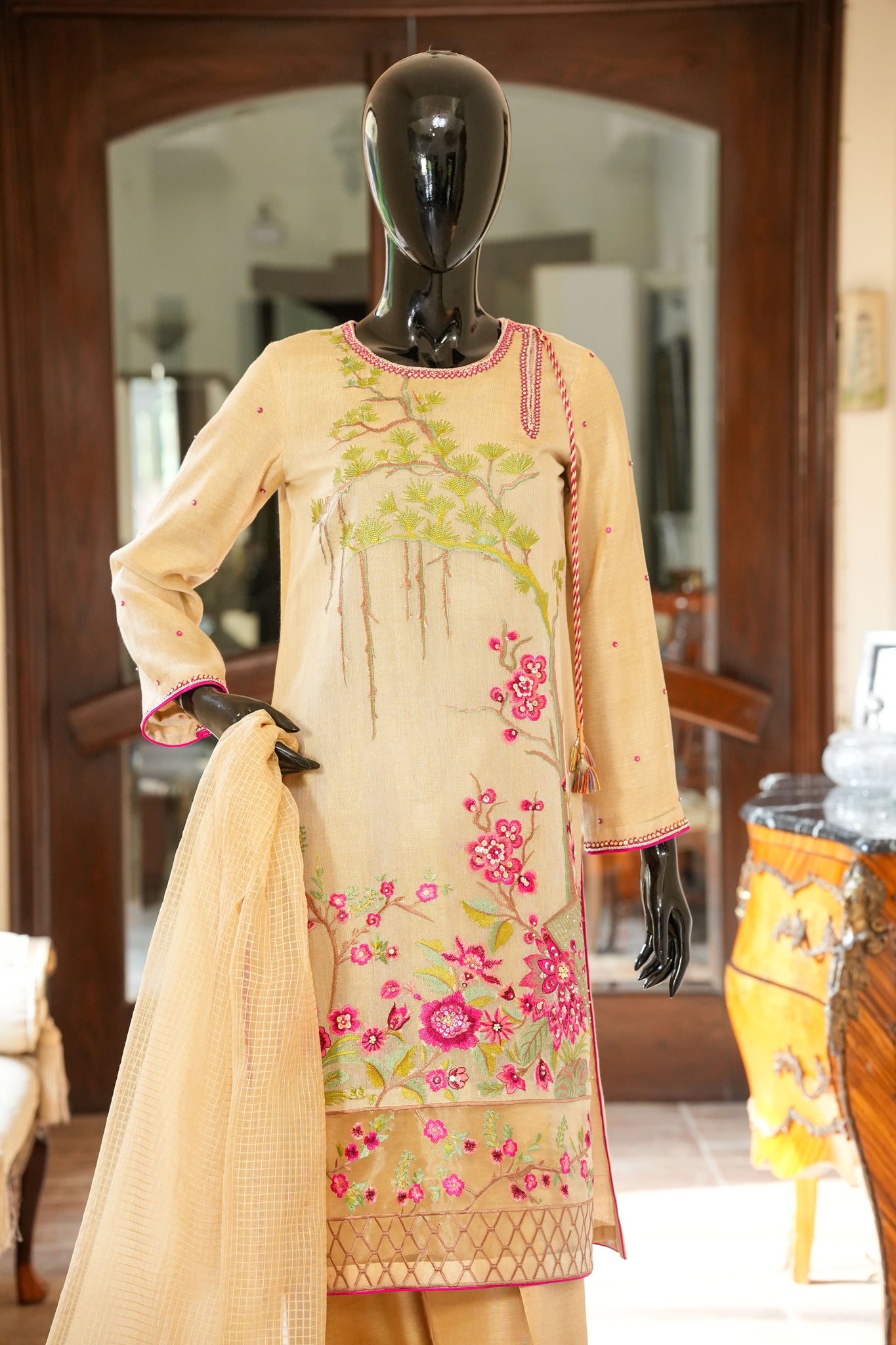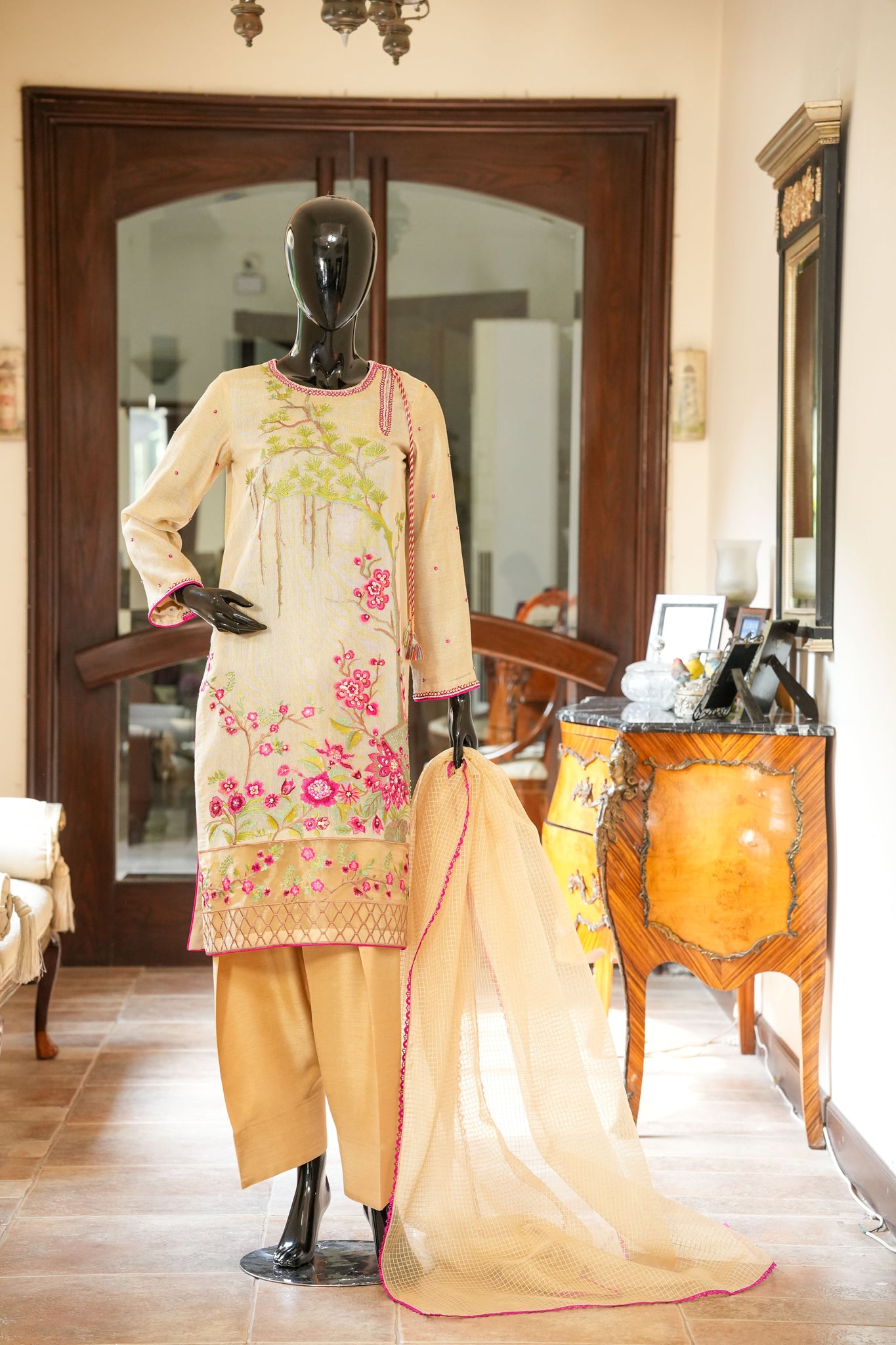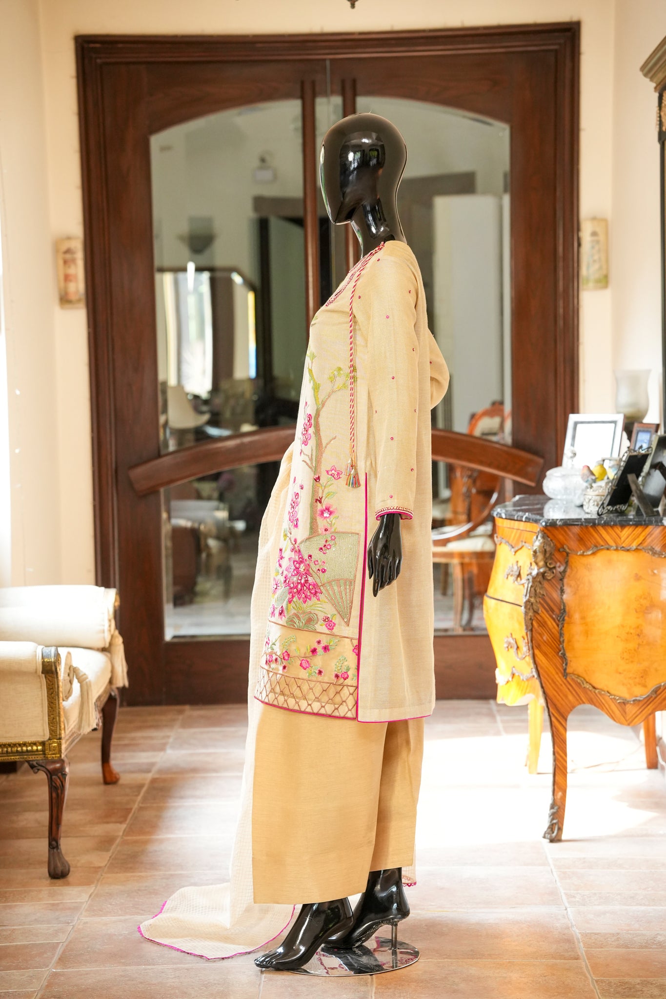This Fresh Green outfit features a cotton net shirt with a 37-inch length, richly decorated with machine embroidery enhanced by hand-applied sequins, moti, and zardozi for exquisite detail. The Korean raw silk shalwar, measuring 39-40 inches, offers a luxurious feel, while the shirt is fully lined on the front, back, and sleeves for comfort. Complete your look with a choice of dupattas in Pakistani grip, checked organza, or chiffon, blending traditional craftsmanship with modern elegance.