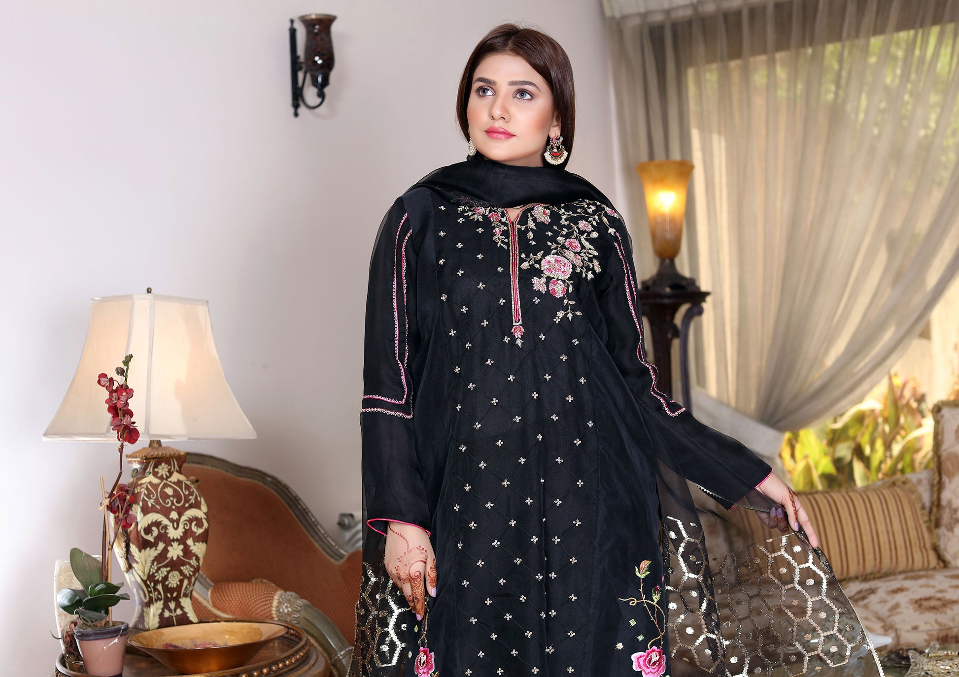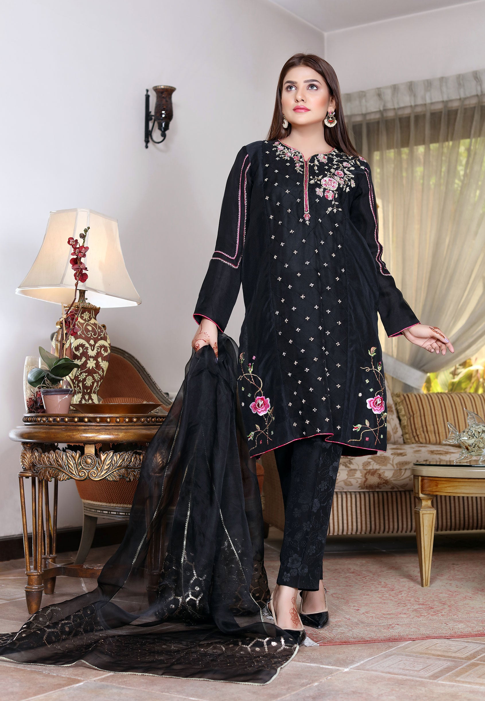 Black first choice for evening wear.Shades of pink embroidery ,subtle hand work with a touch of geometrical figure on sleeves brings out the contemporary and traditional in this elegant silk organza shirt