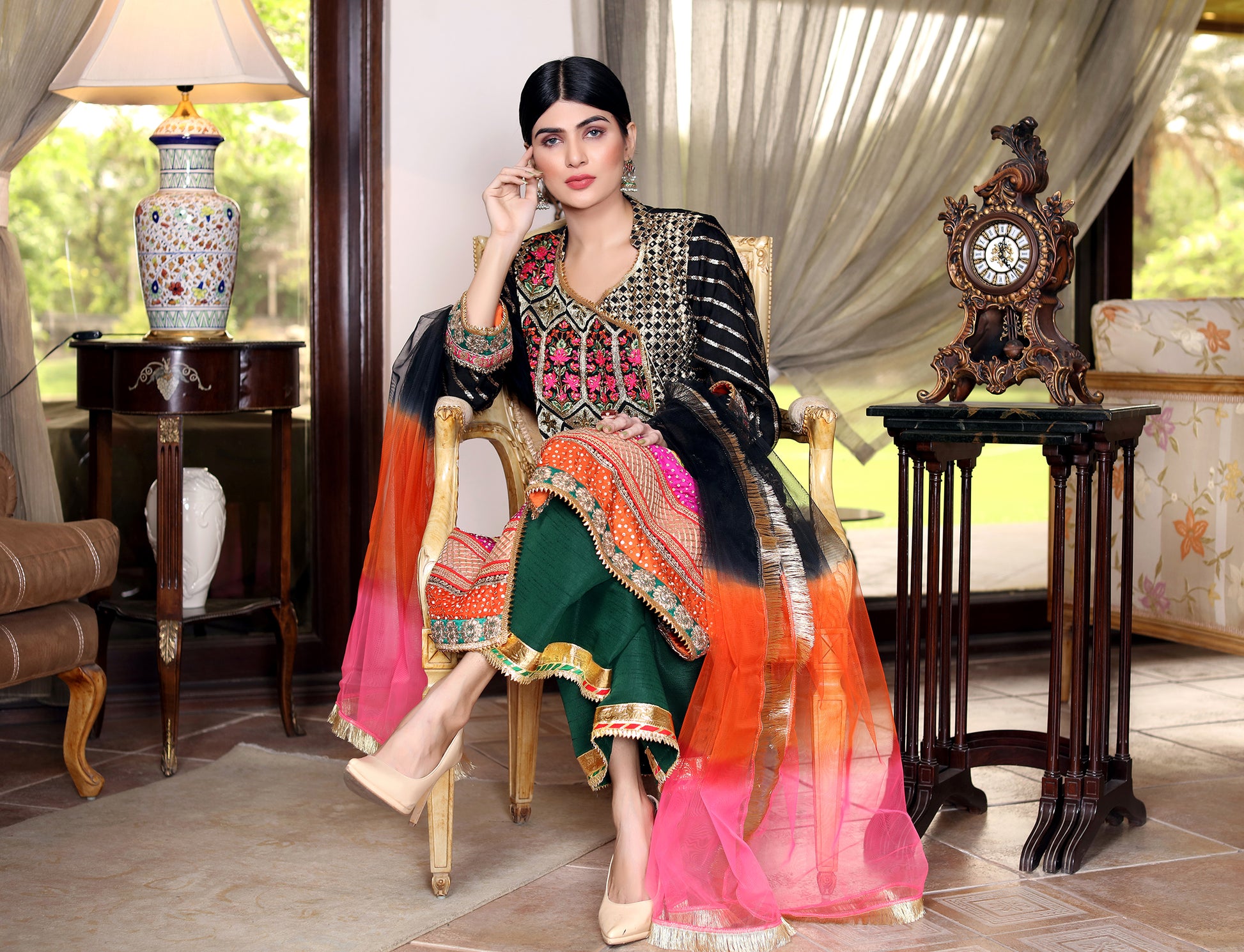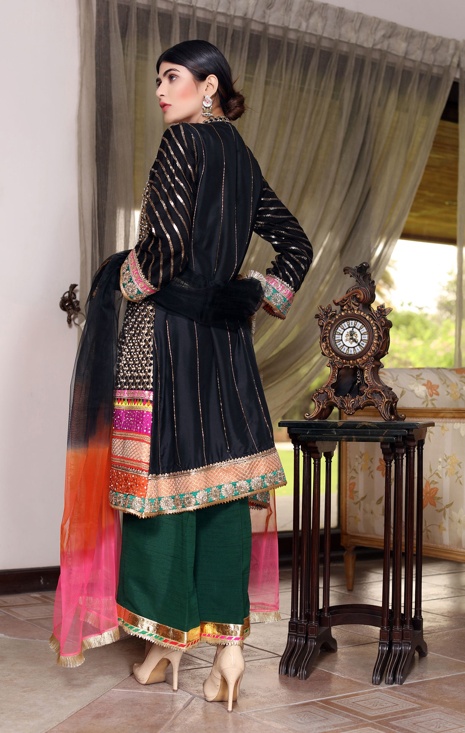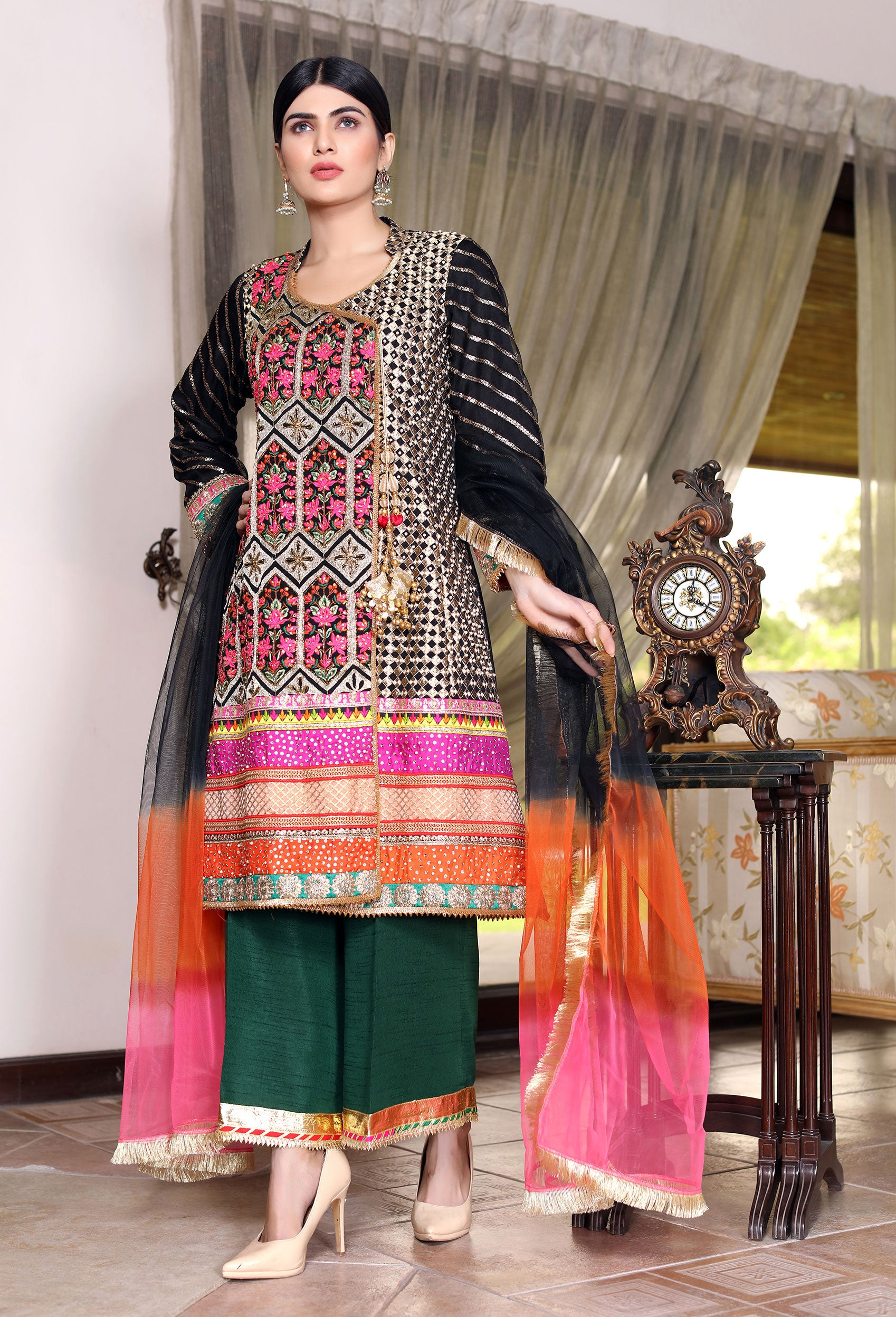 Comtemporary Angarkha in the brightest hues of fabric with hand work on borders