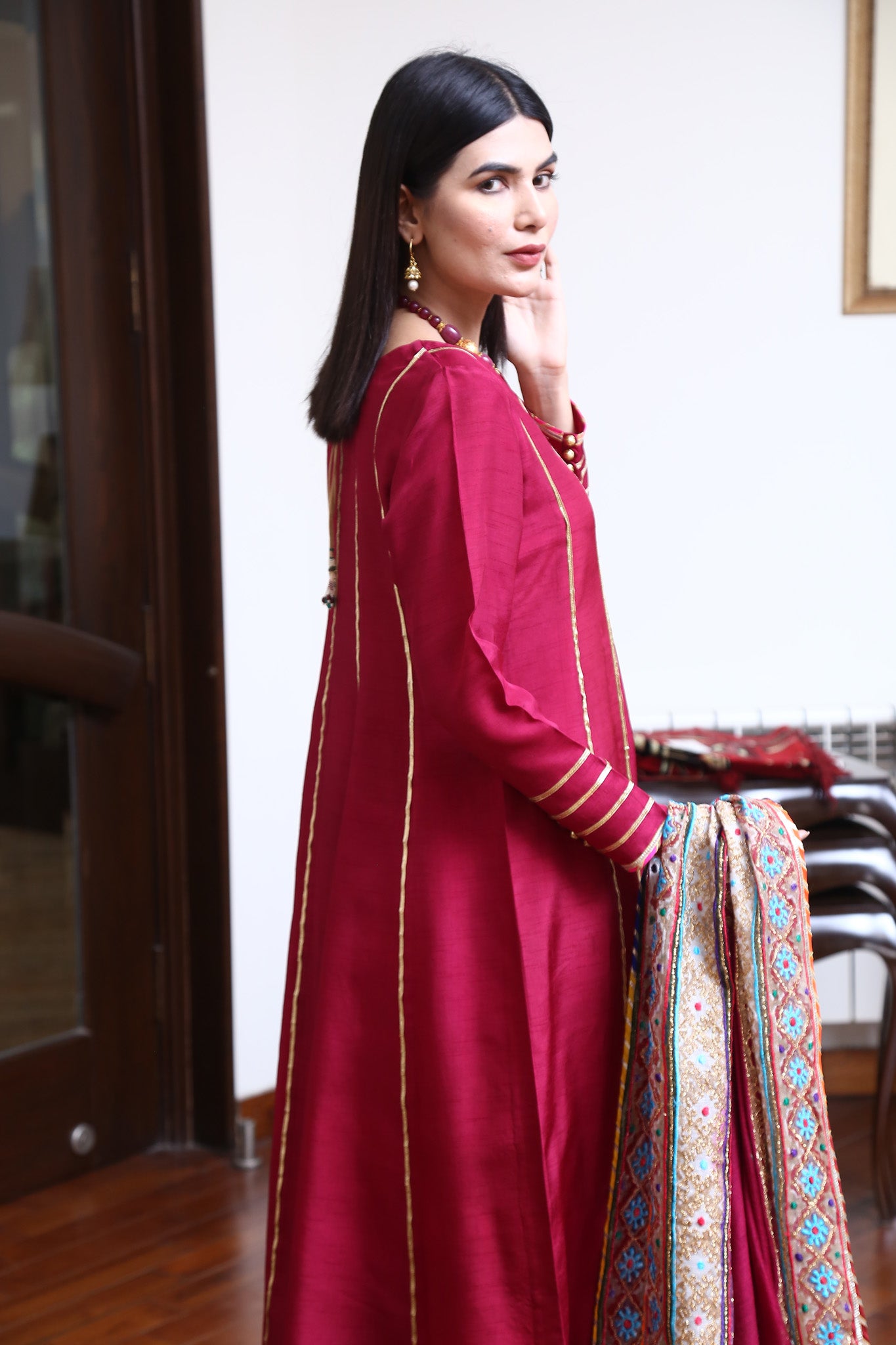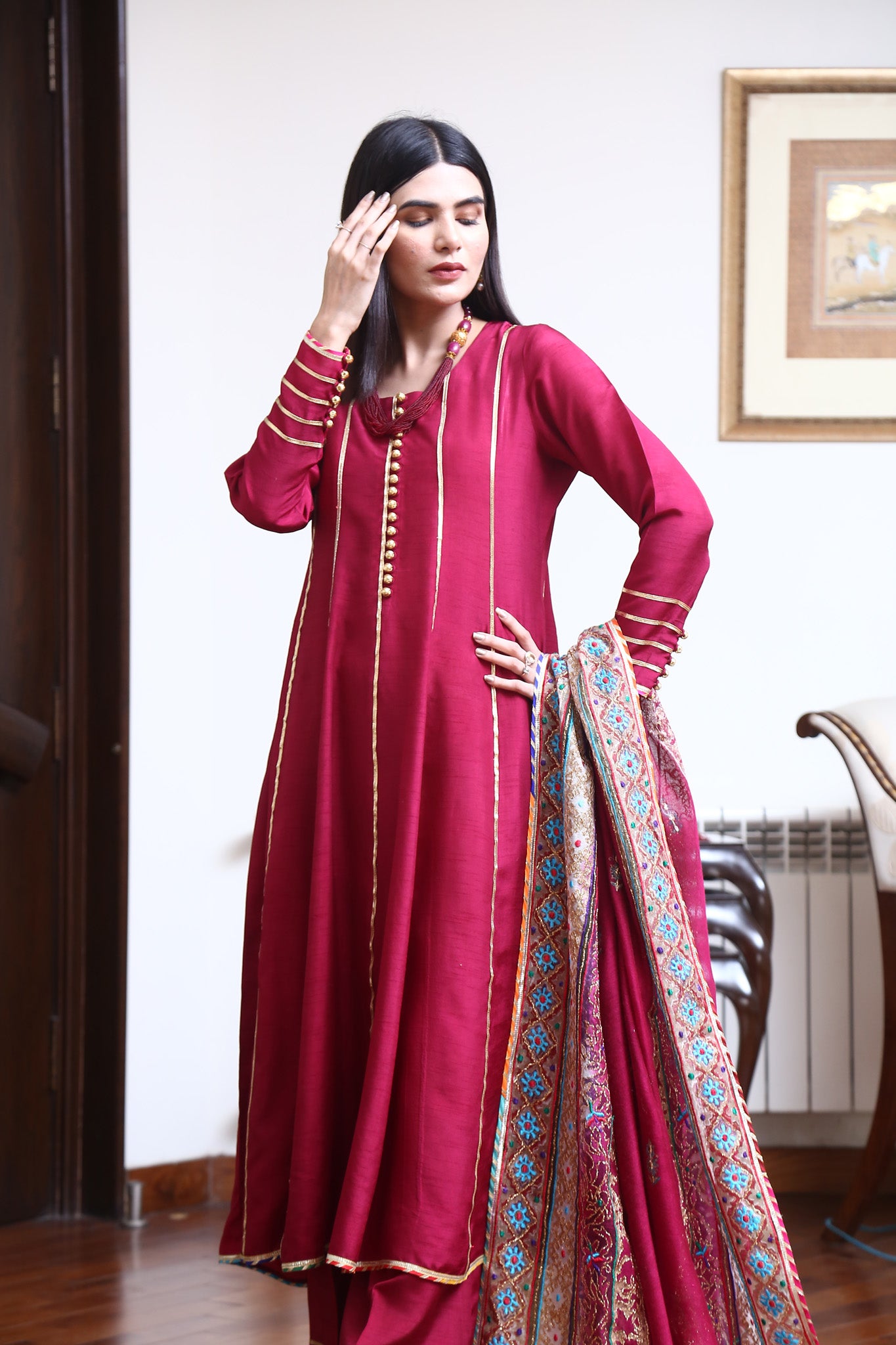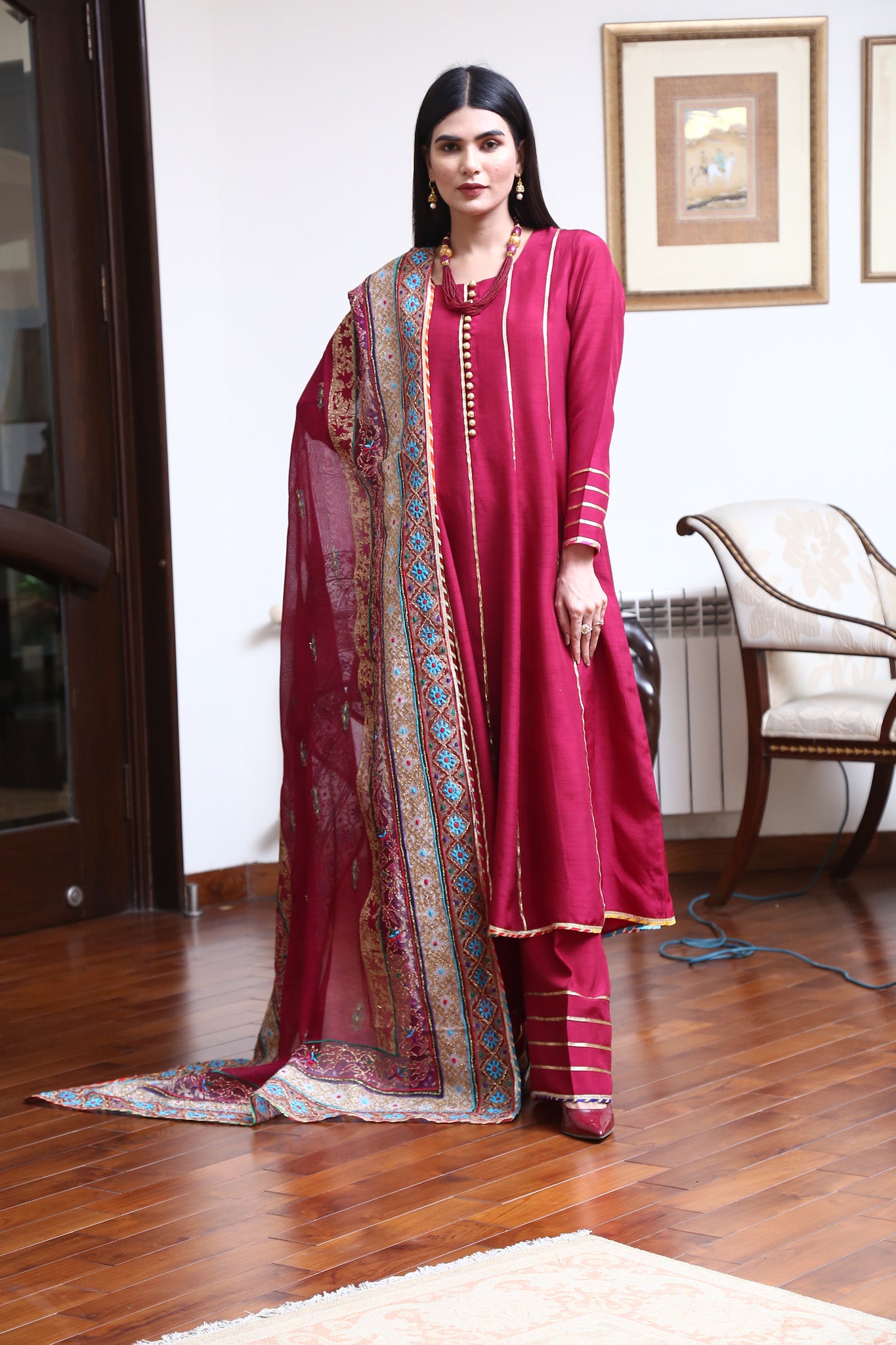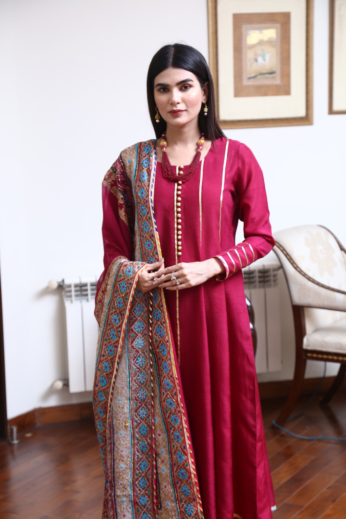 Enliven your wardrobe with this beautiful hand-dyed cotton net dupatta! It boasts stunning, colorful block printing in gold, giving it an aura of sophistication. Outlined with golden tilla thread, it will make any traditional block printed outfit truly shine. The accompanying A-line shirt and loose culottes come decorated with simple yet elegant traditional gota work. Transform your look with this exquisite ensemble!