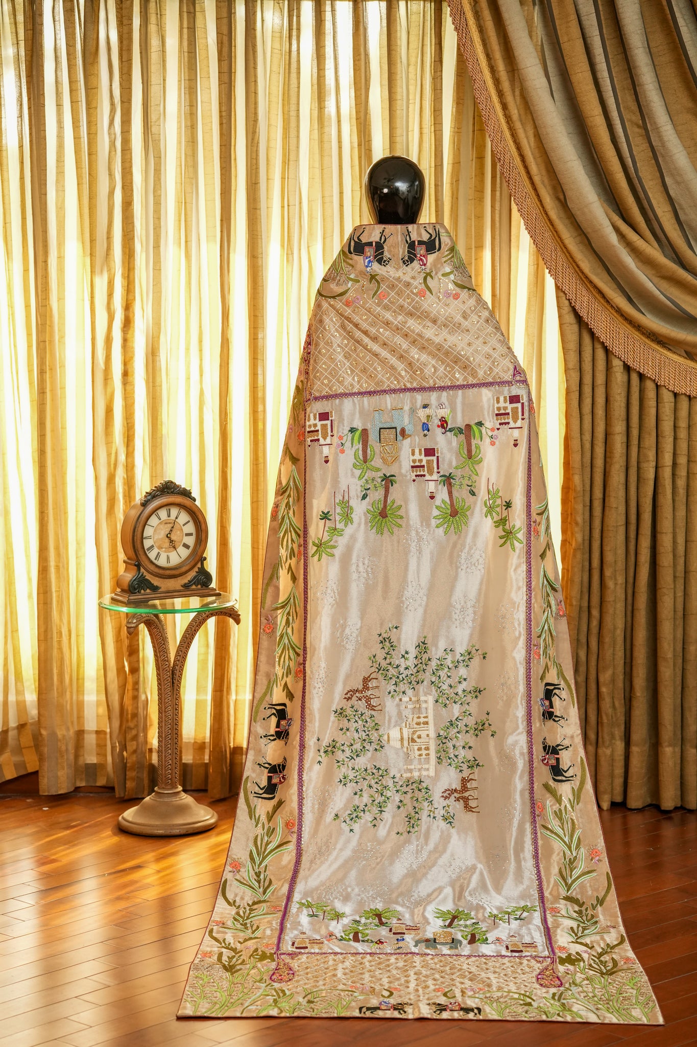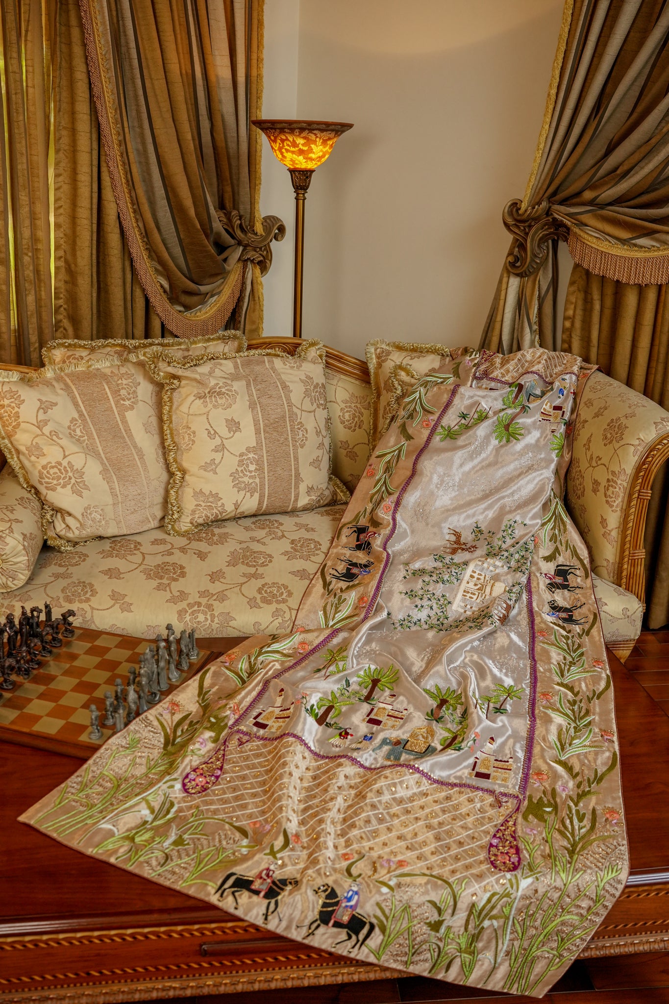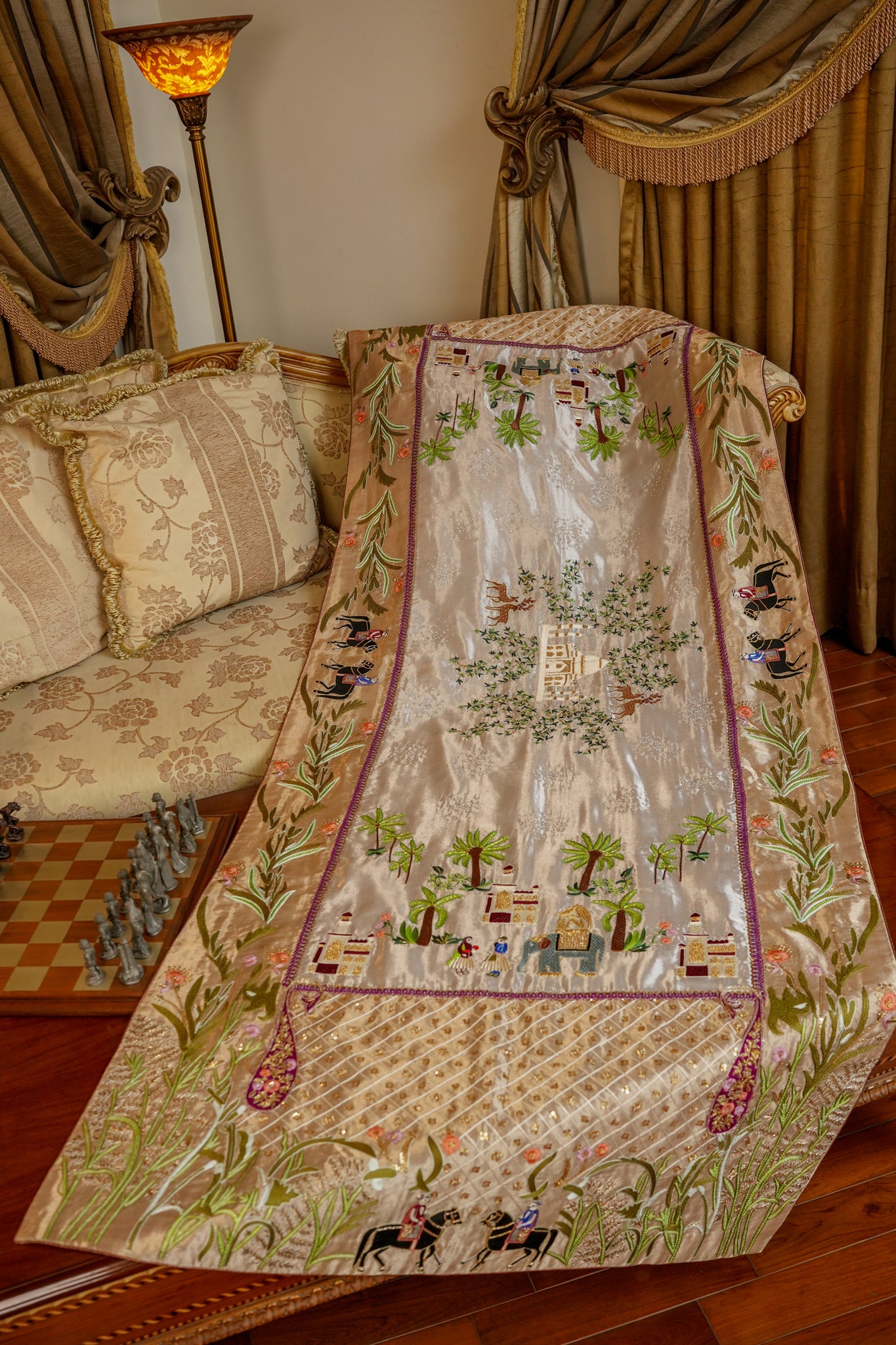 The Shawl from Heritage Collection is exquisite and luxurious. Made with pure silver and gold tissue, it highlights a rich, timeless aesthetic. The single-thread embroidery adds a refined touch, showcasing intricate craftsmanship. The delicate figures and the depiction of a dancing black horse make it an artistic masterpiece, combining tradition with elegance. This collection must is beautiful blend of heritage and fine artistry.