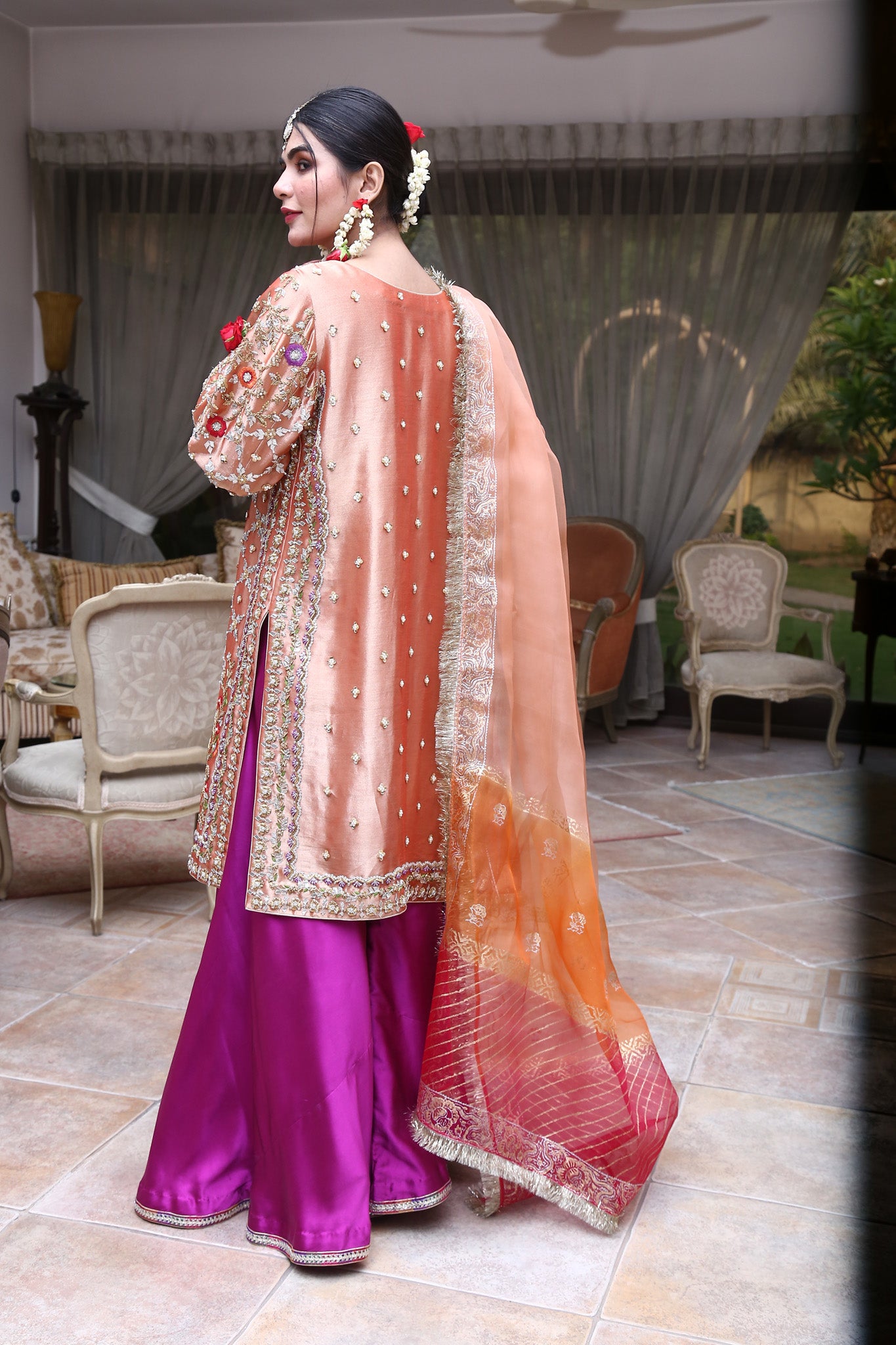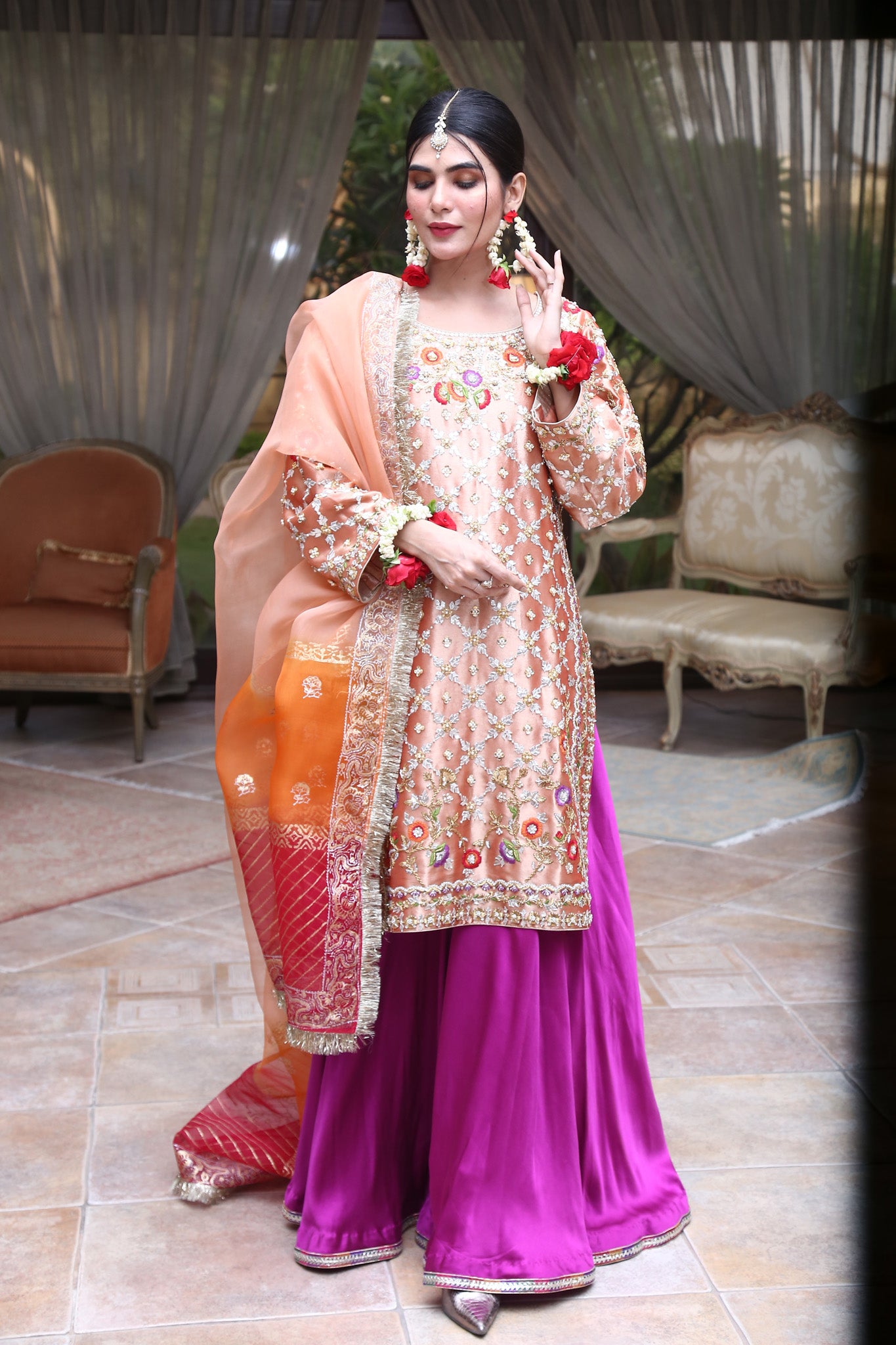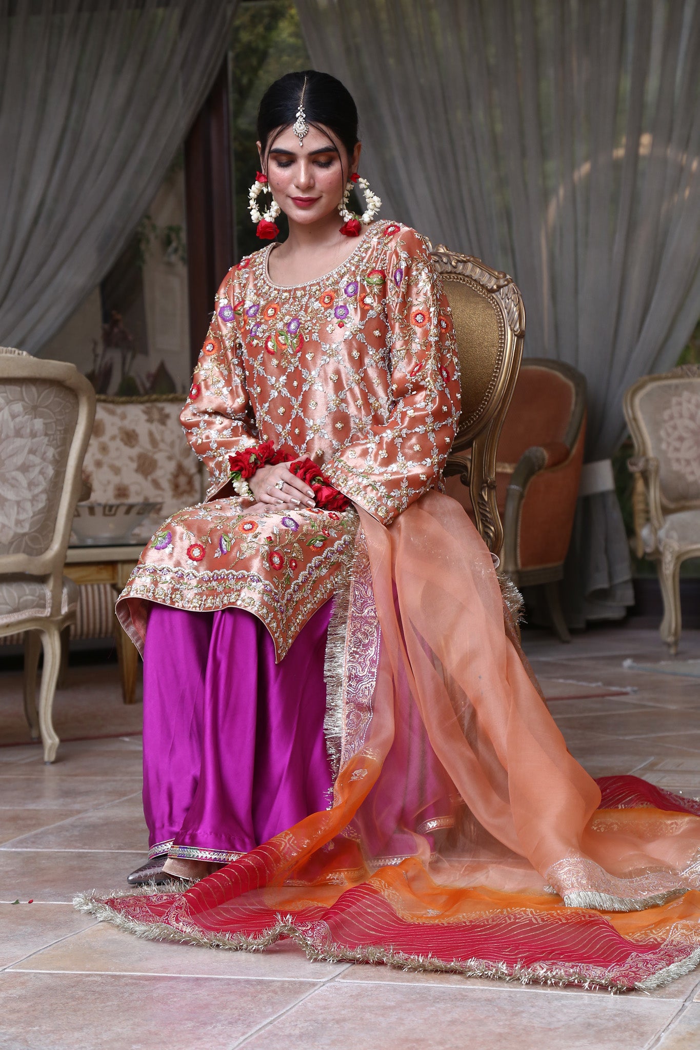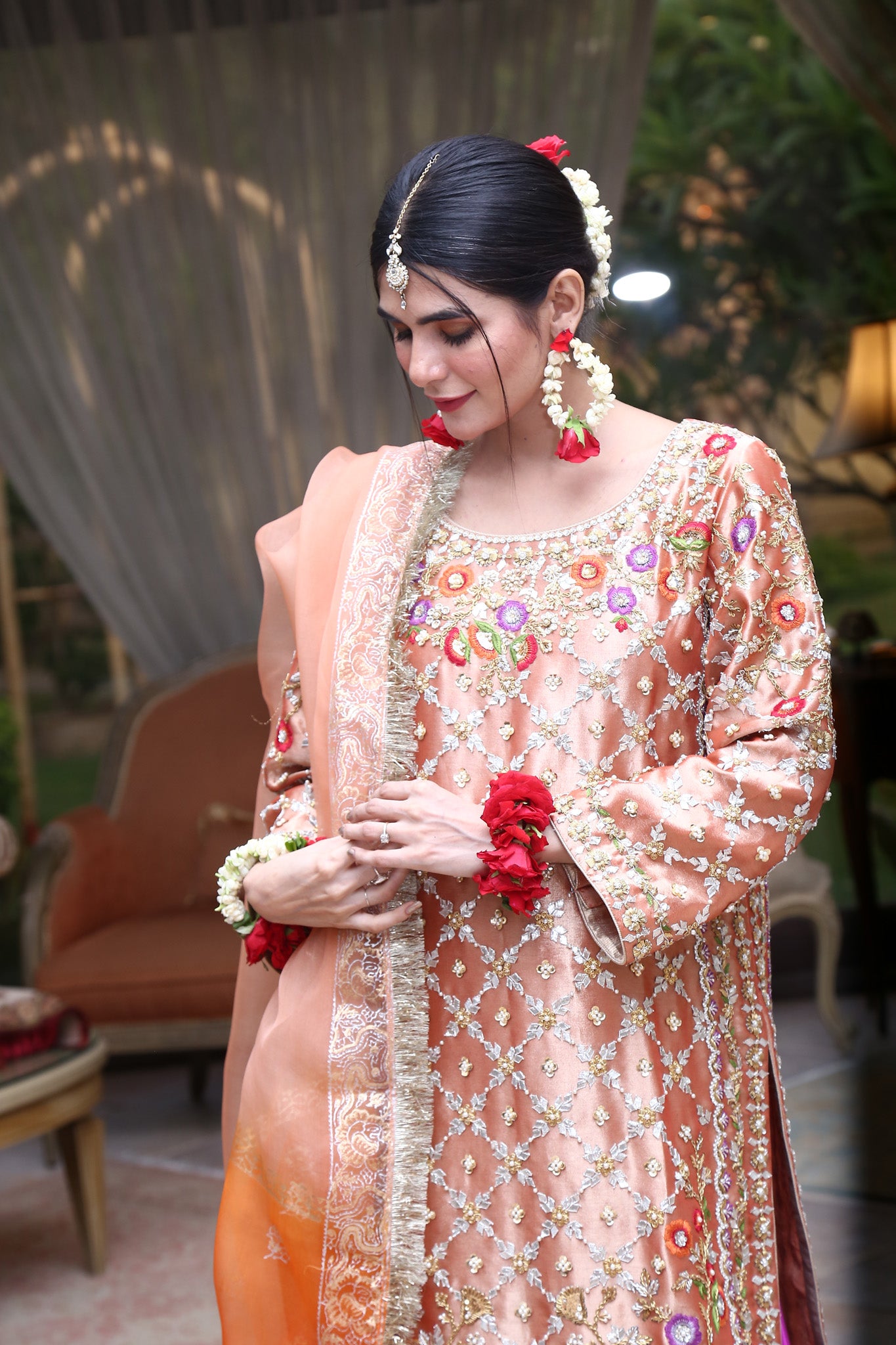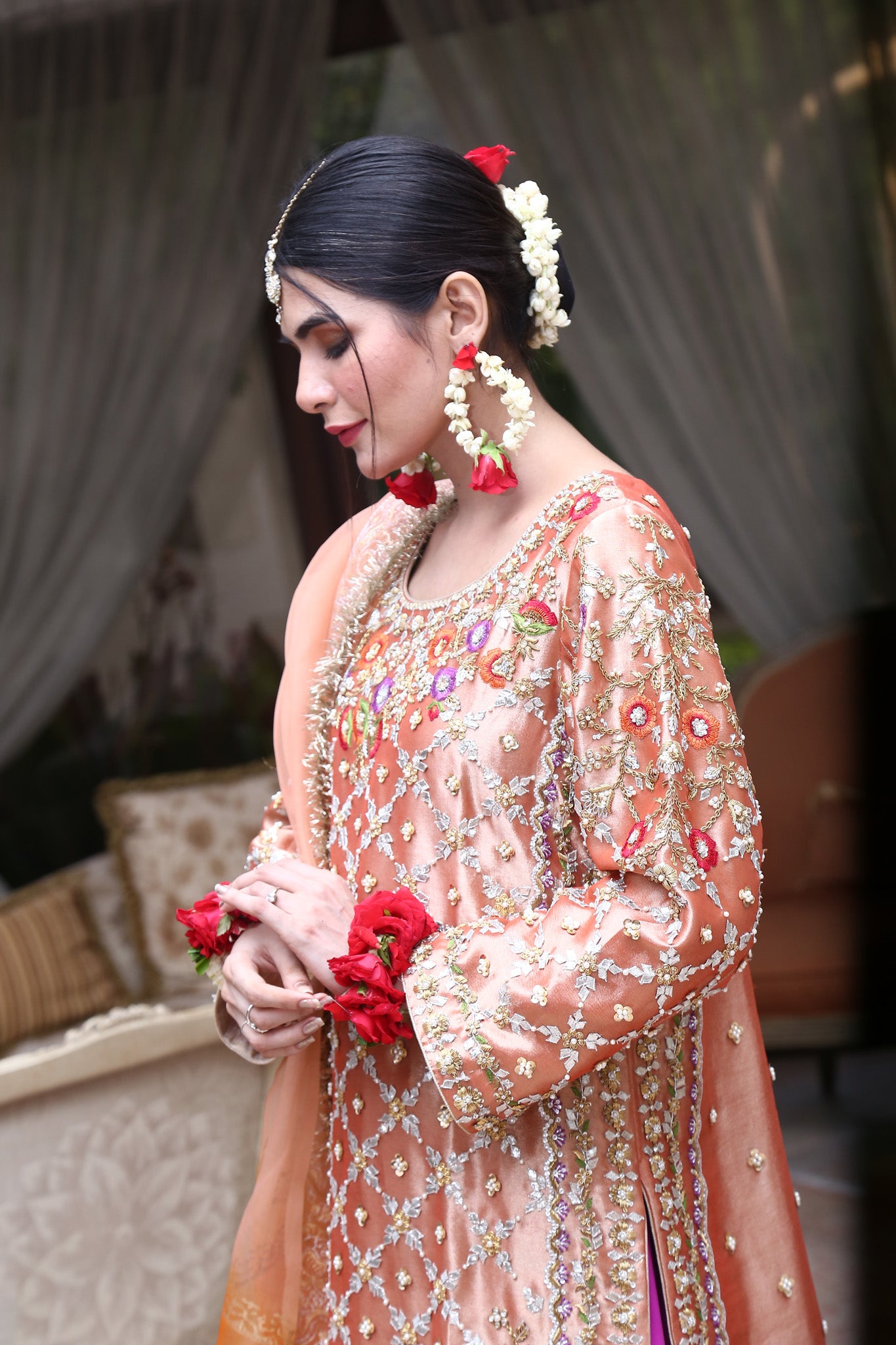 Be a showstopper in this ornate traditional Gota kam ensemble. The intricate zardozi and thread work will have you sparkling in style at any event. Contrasting pure silk lengha and pure organza dupatta let you customize the look in your size. Get ready to impress!