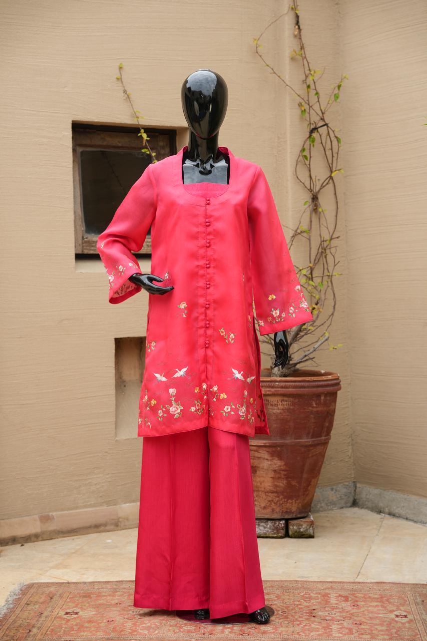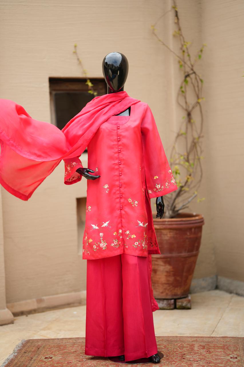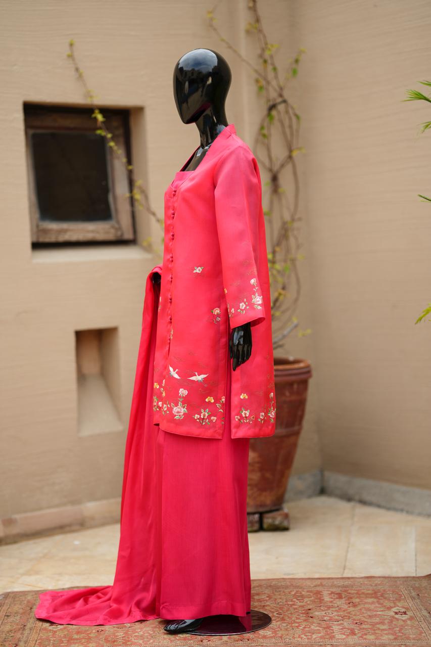 This ensemble makes a bold yet refreshing statement. The melon pink jacket bursts with a vibrant bright hue, while the embroidery in soft shades of cream and lemon provides a delicate contrast that enhances the jacket’s character. The intricate detail of Swan embroidery adds a whimsical, artistic touch, elevating the design.