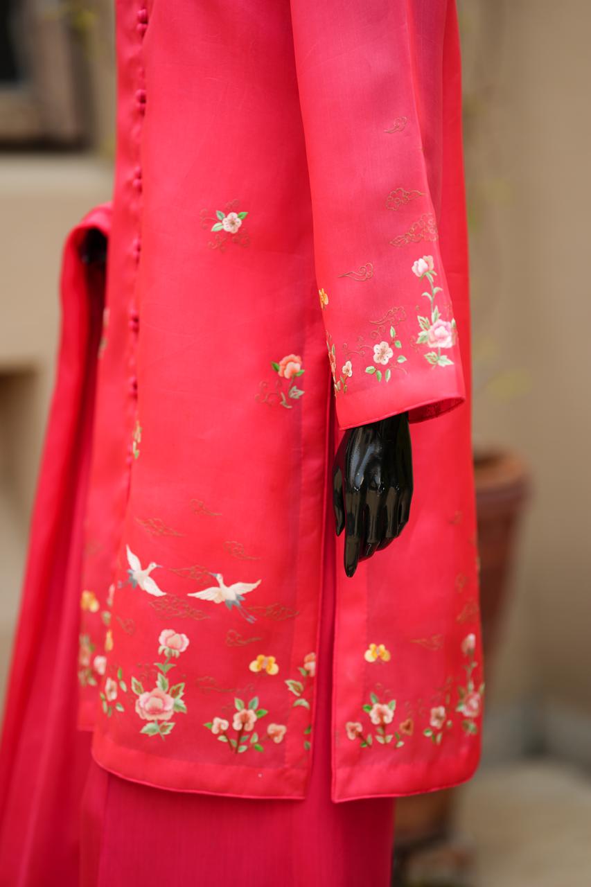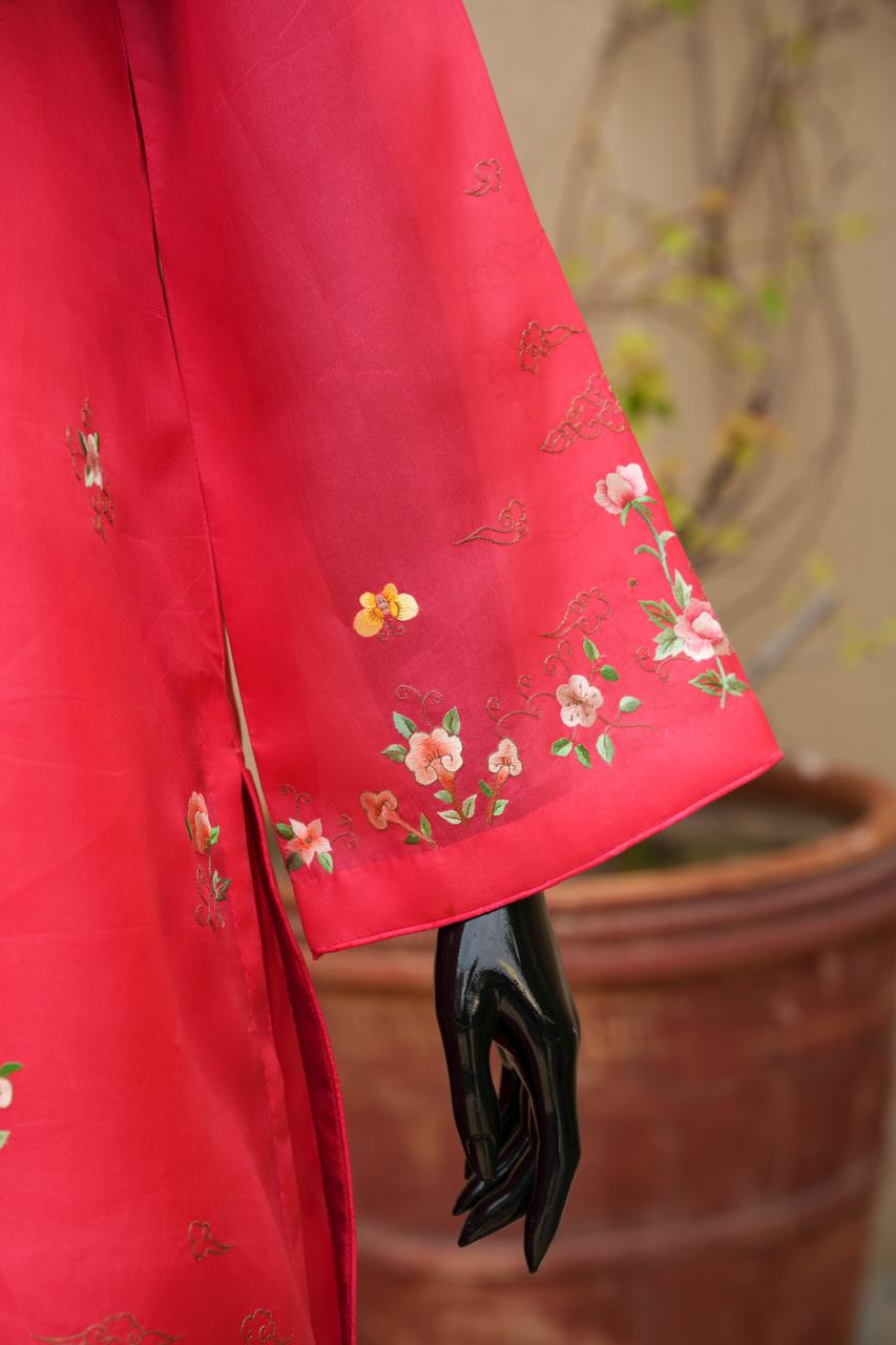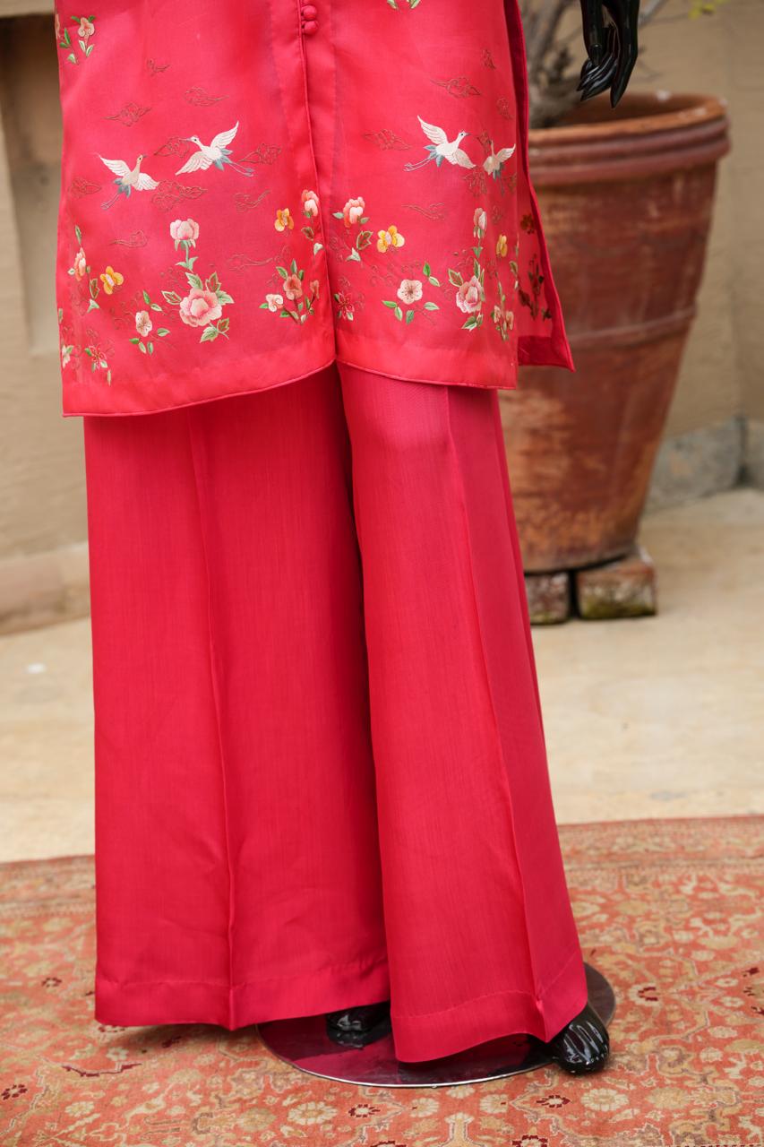 This ensemble makes a bold yet refreshing statement. The melon pink jacket bursts with a vibrant bright hue, while the embroidery in soft shades of cream and lemon provides a delicate contrast that enhances the jacket’s character. The intricate detail of Swan embroidery adds a whimsical, artistic touch, elevating the design.