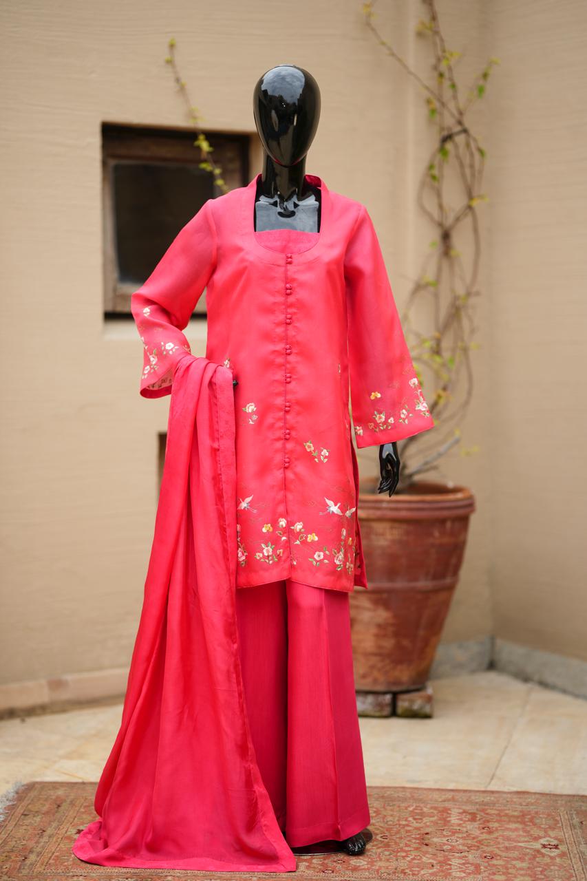 Paired with silk loose culottes and a silk dupatta, the outfit balances playful modernity with fluid elegance, making it ideal for making a stylish impression at daytime events or chic gatherings